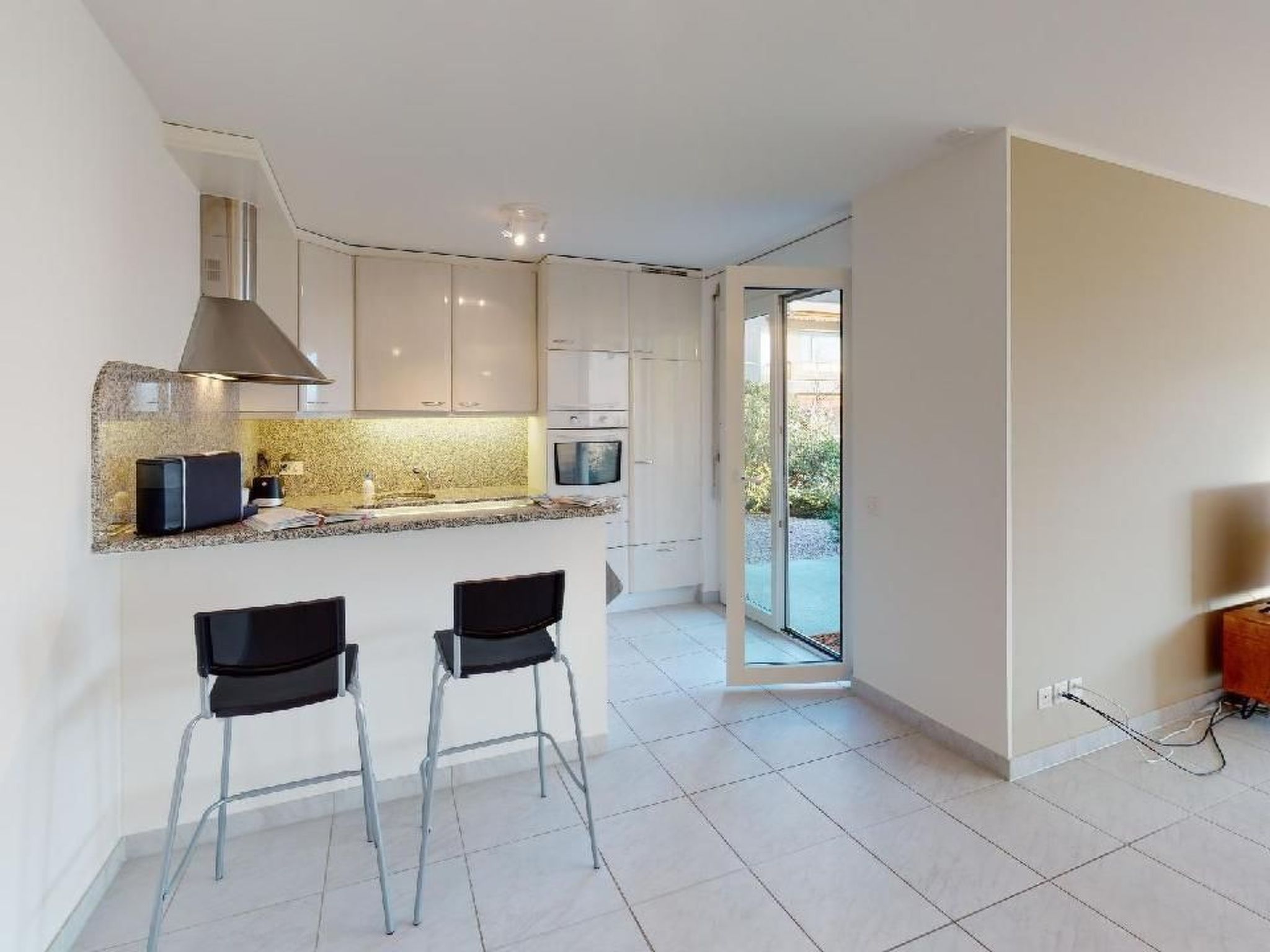 Sonstige Kücheneinrichtung (Küche1): Geschirrspüler, Dampfabzug, Glaskeramikfeld, Backofen, Mikrowellenherd, Kühlschrank mit Gefrierfach, Delizio-Kaffeemaschine, Mokkakocher, Wasserkocher, Toaster, Stabmixer, Tischgrill/Marronibräter/Crèpemaker. Direkter Zugang zum Garten. Frühstückstisch auf dem gedeckten Sitzplatz