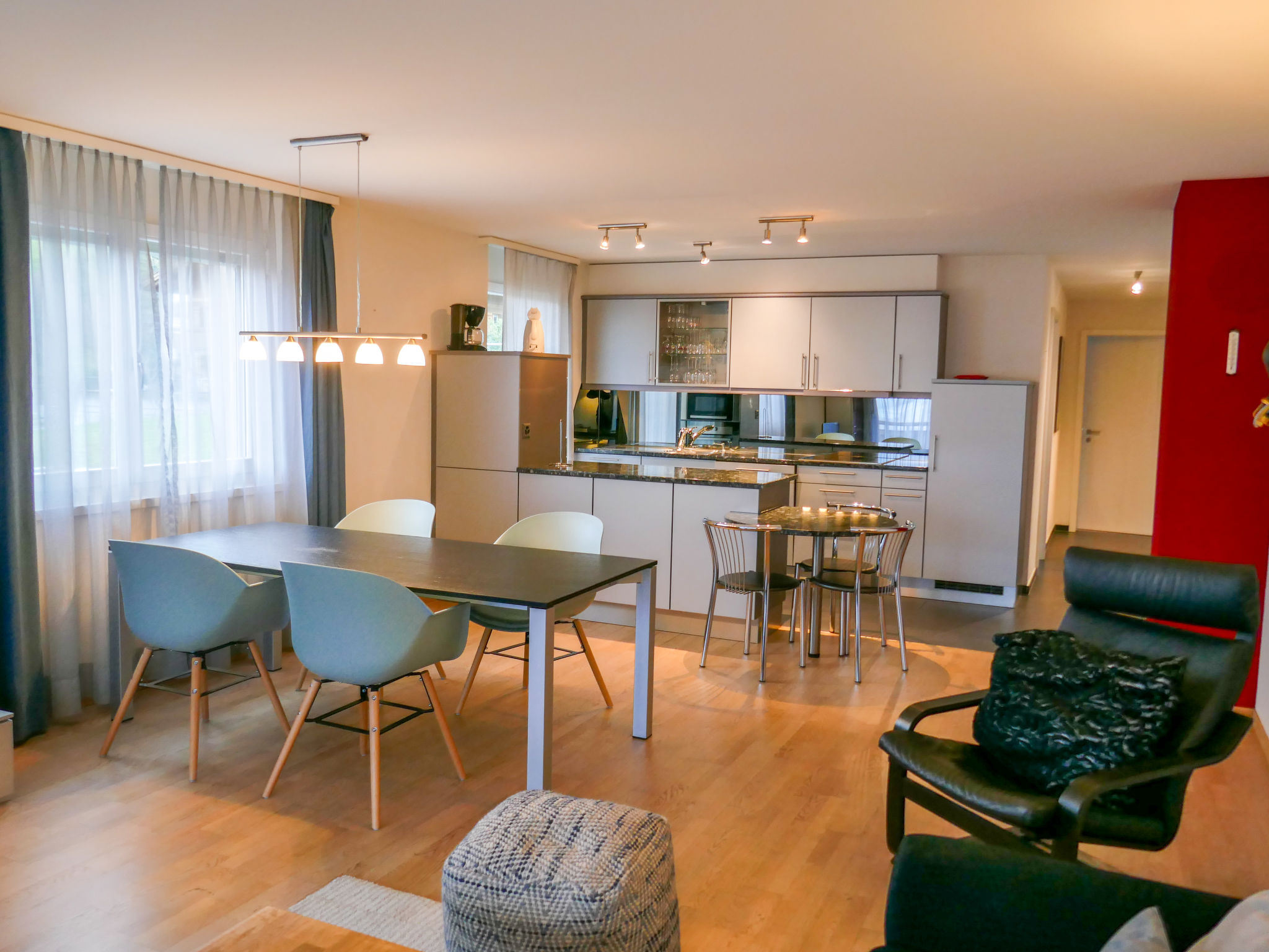 3-Zimmer-Wohnung 108 m2 im 1. Stock, Südlage. Hell, schön und modern eingerichtet: Wohn-/Esszimmer mit Kabel-TV und Flachbildschirm. Ausgang zum Balkon, Richtung Süden und Richtung Westen. 1 Zimmer mit 1 Bett (90 cm, Länge 200 cm), 1 franz. Bett (160 cm, Länge 200 cm). 1 Zimmer mit 1 franz. Bett (160 cm, Länge 200 cm). Ausgang zum Balkon, Richtung Westen. Offene Küche (Backofen, Geschirrspüler, 4 Glaskeramikplatten, Mikrowelle, elektrische Kaffeemaschine, Kapseln für die Kaffeemaschine (Nespresso) extra, Racletteofen, Fondue Set (Käse)). Bad/WC, Dusche/WC. Fussbodenheizung. Parkettboden, Natursteinboden. Südlage und Westlage. Balkonmöbel. Herrliche Sicht auf die Berge und Eiger Nordwand. Zur Verfügung: Waschmaschine, Wäschetrockner, Bügeleisen. Internet (Wireless LAN, gratis). Parkplatz, Garage Nr. 12, Höhe 198 cm. Bitte beachten: Nichtraucher-Unterkunft. Feuerlöscher.
