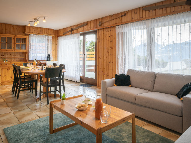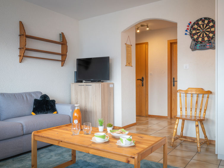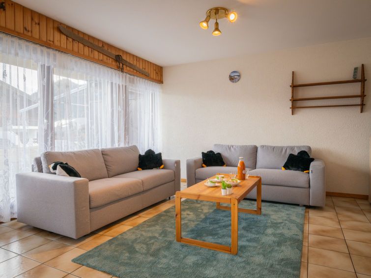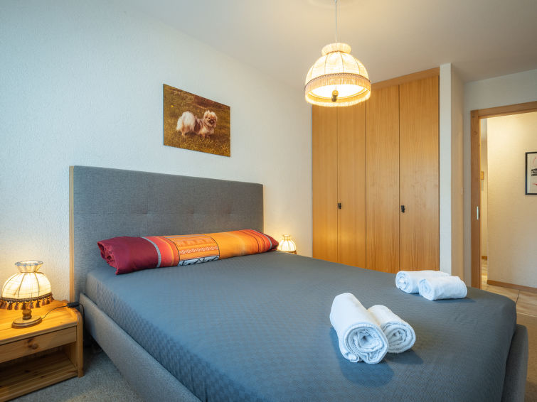 "Austral 105", 3-Zimmer-Wohnung 75 m2, Südlage. Geräumig und hell, komfortabel und schön eingerichtet: Eingang. Wohn-/Esszimmer mit Kabel-TV und DVD. Ausgang zur Terrasse, Richtung Süden. 1 Zimmer mit 1 franz. Bett (1 x 160 cm, Länge 200 cm). 1 Zimmer mit 2 x 2 Etagenbetten (90 cm, Länge 200 cm). Offene Küche (4 Kochplatten, Backofen, Geschirrspüler, Wasserkocher, Tiefkühler, elektrische Kaffeemaschine, Kapseln für die Kaffeemaschine (Tassimo) extra, Racletteofen, Fondue Set (Käse)). Bad/WC, sep. WC. Grosse Terrasse 37 m2, Südlage. Terrassenmöbel. Schöne Sicht auf die Berge. Zur Verfügung: Kinderhochstuhl, Babybett, Haartrockner. Internet (WLAN, gratis). Garage Nr. 105 (2 Autos), Höhe 190 cm, Breite 230 cm. Bitte beachten: geeignet für Familien. Nichtraucher-Unterkunft.