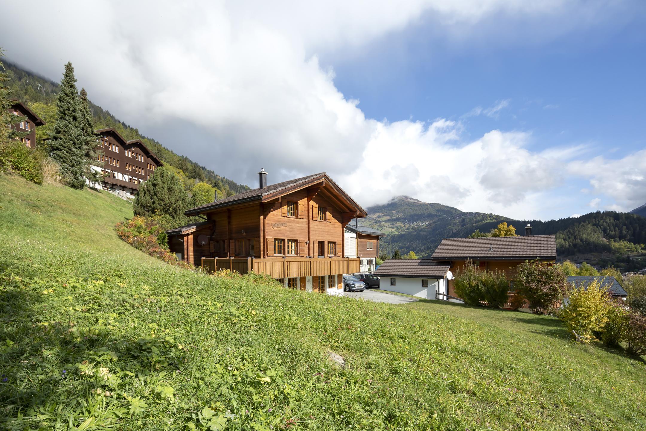 Das freistehende Chalet Cresta befindet sich im Ortsteil Wiler in Fiesch, oberhalb des Dorfzentrums. Die ruhige und sonnige Lage bietet einen beeindruckenden Ausblick auf die Walliser Alpen. In etwa zehn Gehminuten erreichst du das Zentrum von Fiesch, die Seilbahnstation sowie den Bahnhof. Das Chalet ist über eine Zufahrtsstrasse gut erreichbar und verfügt über eine eigene Garage sowie zwei Parkplätze. Vor dem Haus lädt eine grosse Liegewiese zum Verweilen ein. Die Region rund um Fiesch, Fieschertal und das Musikdorf Ernen verbindet das Langlaufgebiet Goms mit dem Wintersportparadies Aletsch Arena. Im Sommer wie im Winter bieten sich zahlreiche Möglichkeiten für Outdoor-Aktivitäten wie Wandern, Skifahren, Langlauf oder Mountainbiken.