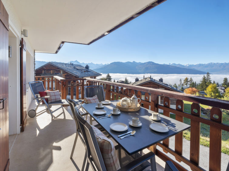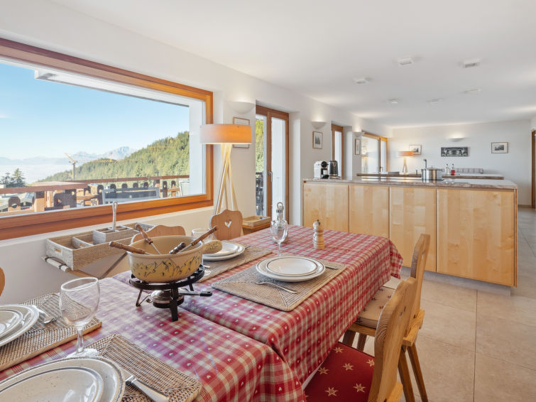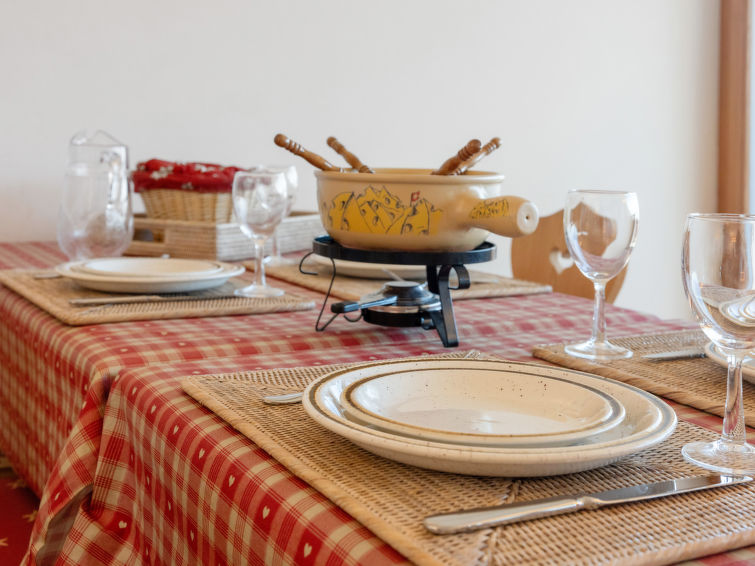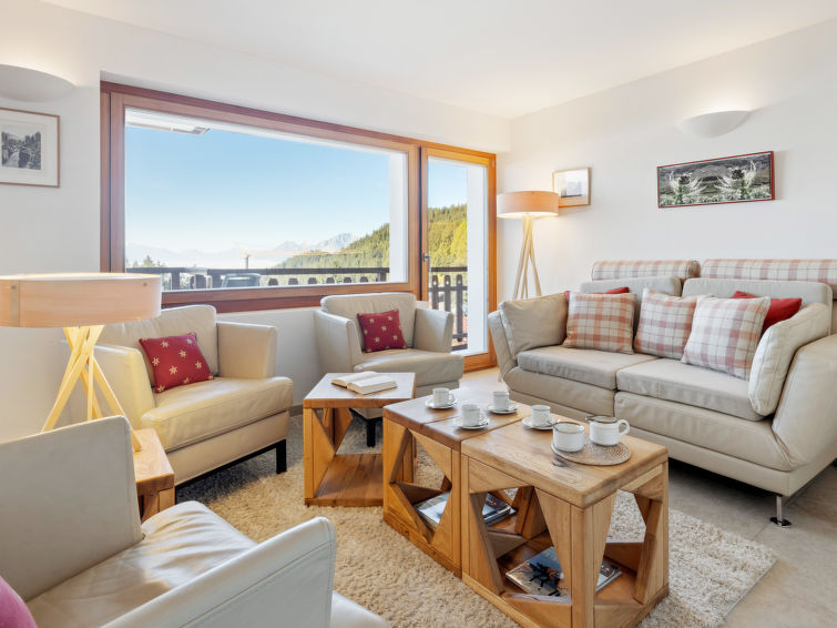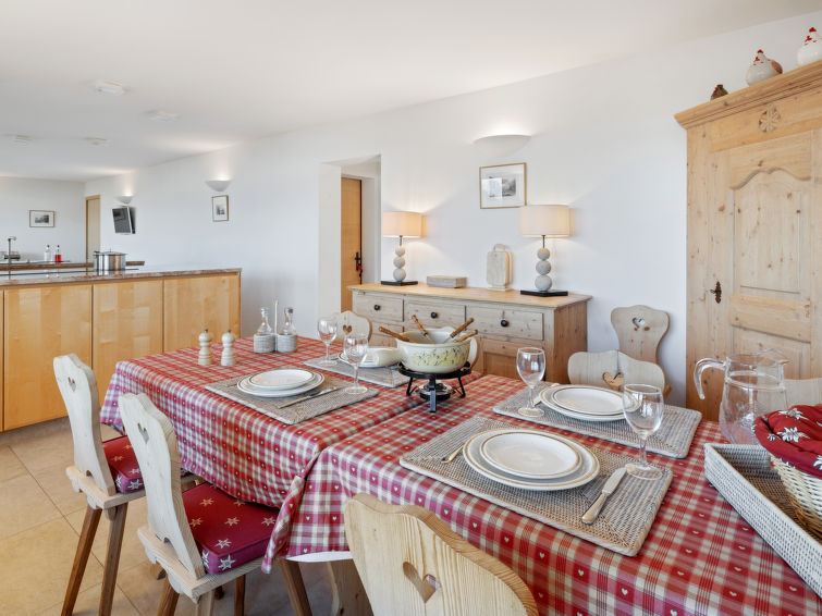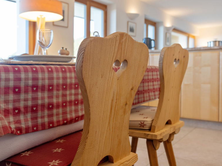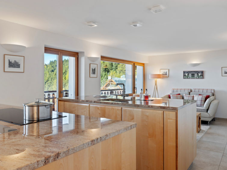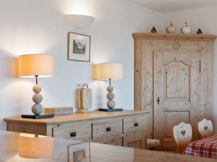 "Les Aiguilles Vertes Rez inférieur", 3-Zimmer-Wohnung 70 m2, im erhöhten Erdgeschoss. Komfortabel und gemütlich eingerichtet: Wohn-/Esszimmer mit Kabel-TV. Ausgang zum Balkon. 1 Zimmer mit 2 Betten (90 cm, Länge 200 cm), Bad/WC. 1 Zimmer mit 2 Betten (90 cm, Länge 200 cm). Wohnküche (Backofen, Geschirrspüler, 4 Induktionskochplatten, Toaster, Wasserkocher, Mikrowelle, elektrische Kaffeemaschine, Kapseln für die Kaffeemaschine (Nespresso) extra, Racletteofen, Fondue Set (Chinoise, Käse)). Dusche/WC. Grosser Balkon 20 m2, Südwestlage. Balkonmöbel, Liegestühle (2). Sehr schöne Sicht auf die Berge und die Landschaft. Zur Verfügung: Bügeleisen, Haartrockner. Internet (WLAN, gratis). Garage Nr. 2, Höhe 190 cm, Breite 230 cm. Bitte beachten: Nichtraucher-Unterkunft. Maximal 1 Haustier/Hund erlaubt. Kein Fahrstuhl.