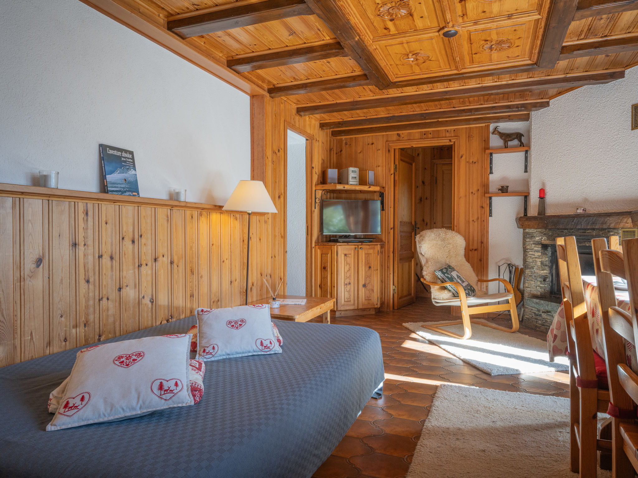 "Mélèze", 3-Zimmer-Wohnung im Erdgeschoss, Südwestlage. Komfortabel eingerichtet: Eingang. Wohn-/Esszimmer mit 1 Diwanbett (130 cm), offenem Kamin, Kabel-TV, Stereoanlage und DVD. Ausgang zum Balkon. 2 Zimmer, jedes Zimmer mit 2 Betten (90 cm, Länge 200 cm). Offene Küche (4 Kochplatten, Backofen, Geschirrspüler, elektrische Kaffeemaschine, Kapseln für die Kaffeemaschine (Nespresso) extra, Racletteofen, Fondue Set (Chinoise, Käse)). Bad/WC. Terrassenmöbel, Gartengrill (mobil), Liegestühle (2), Abstellkammer. Sehr schöne Sicht auf die Berge. Zur Verfügung: Waschmaschine, Wäschetrockner. Internet (WLAN, gratis). Bitte beachten: Nichtraucher-Unterkunft. Maximal 1 kleines Haustier/Hund erlaubt.