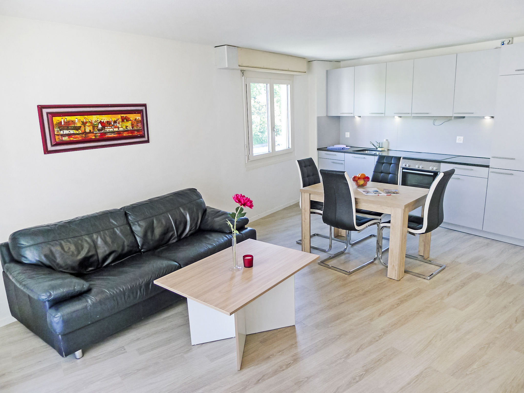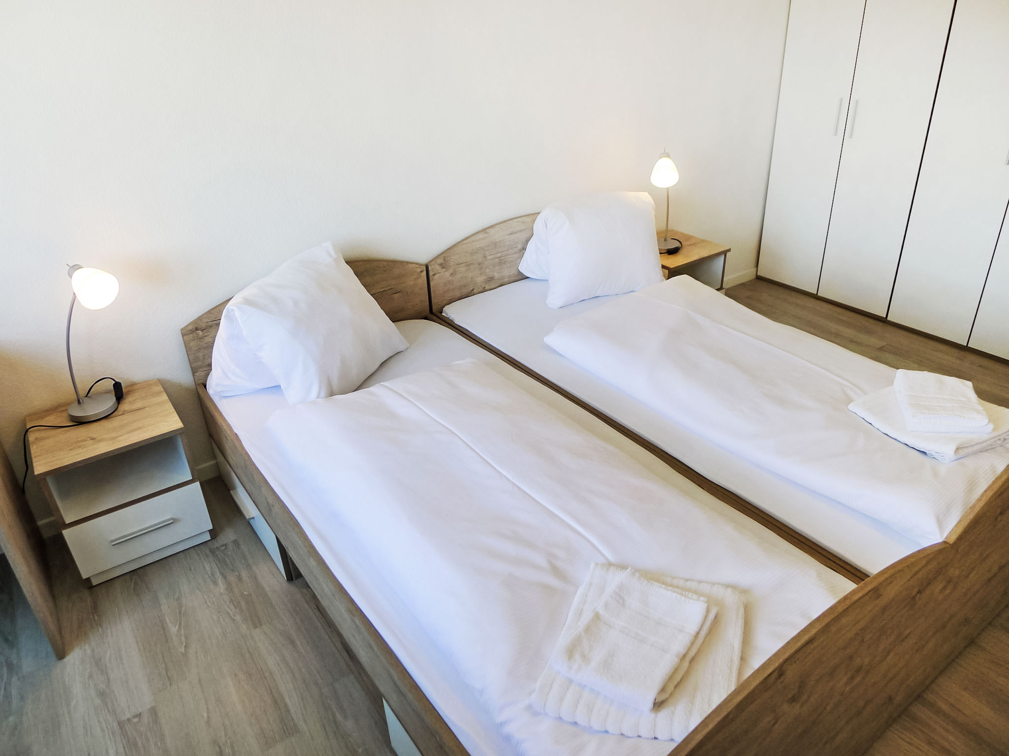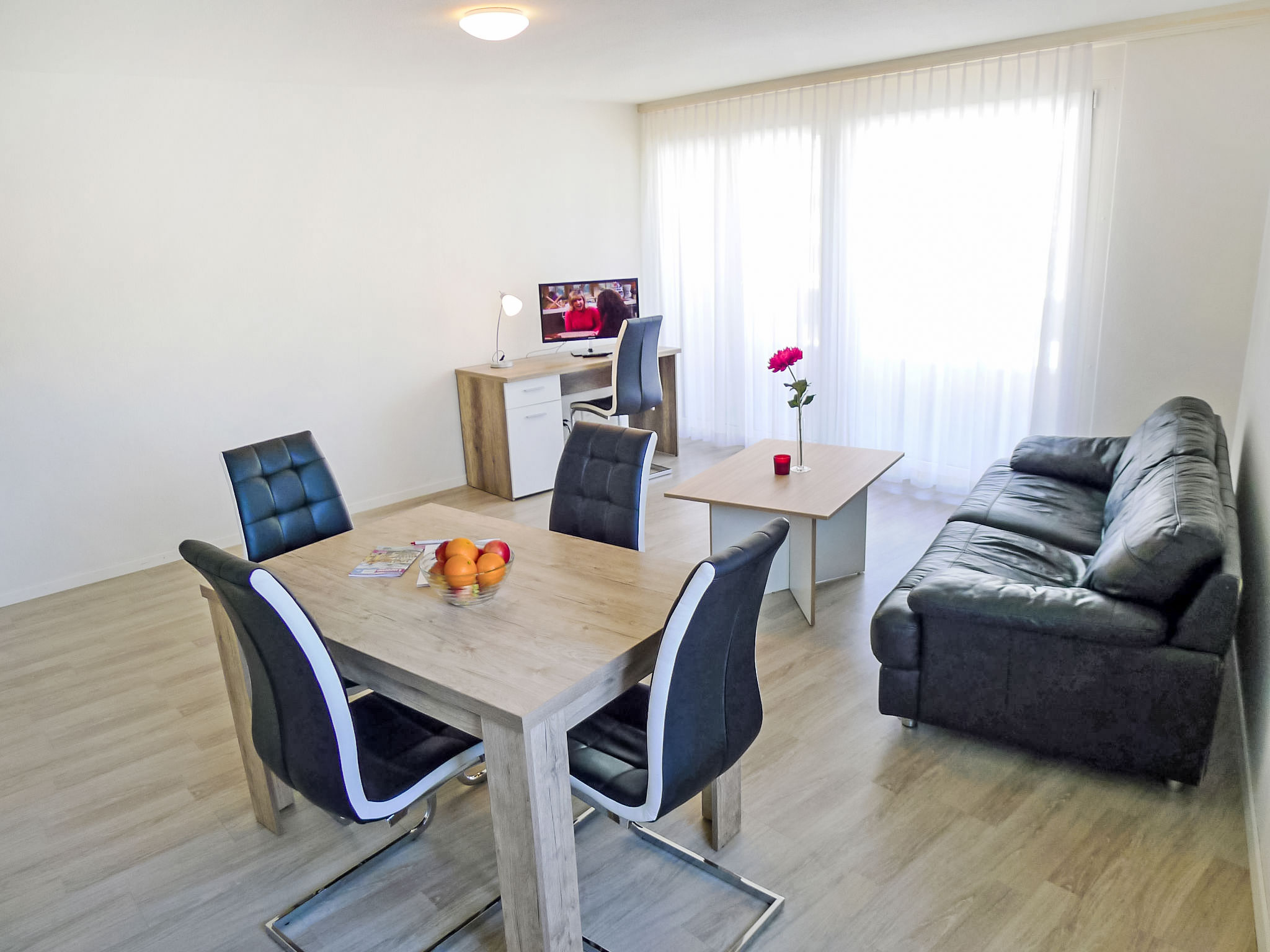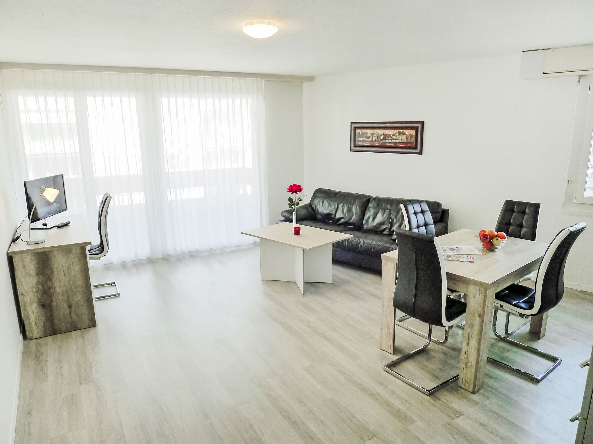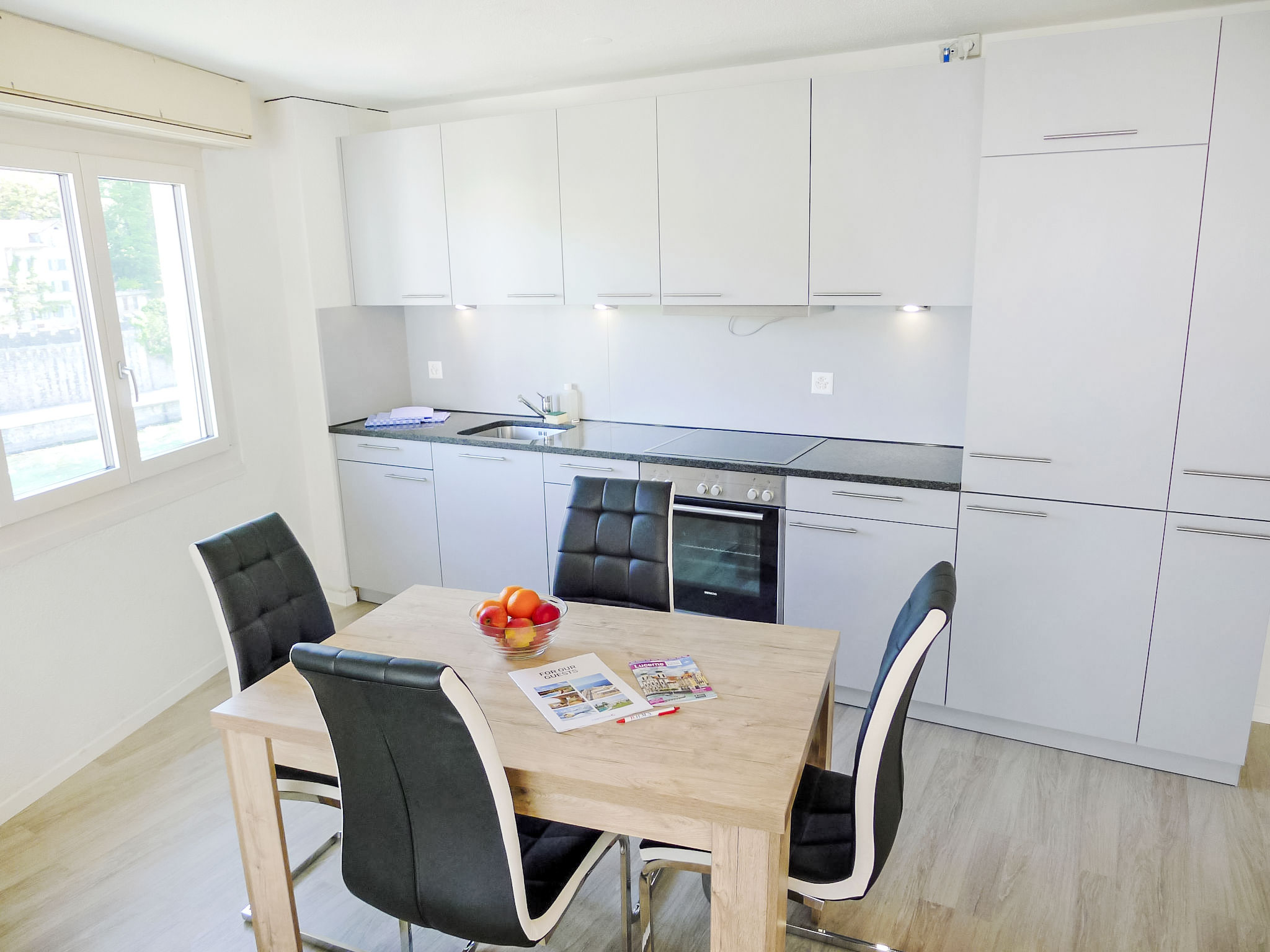 3-Zimmer-Wohnung 66 m2. Zweckmässig und gemütlich eingerichtet: Wohn-/Esszimmer mit Kabel-TV (Flachbildschirm). Ausgang zum Balkon. 2 Zimmer, jedes Zimmer mit 2 Betten (90 cm, Länge 200 cm). Küche (4 Kochplatten, Backofen, elektrische Kaffeemaschine, Kapseln für die Kaffeemaschine (Nespresso) extra). Bad/WC. Balkon. Zur Verfügung: Internet (Wireless LAN, gratis). Bitte beachten: Nichtraucher-Unterkunft.
