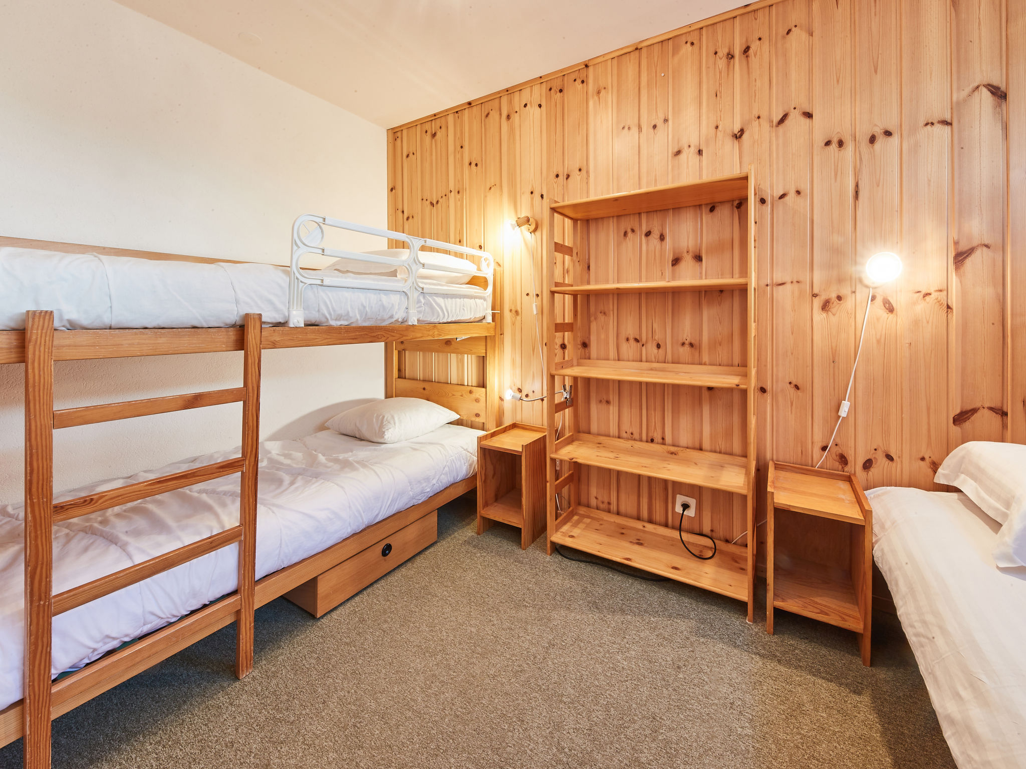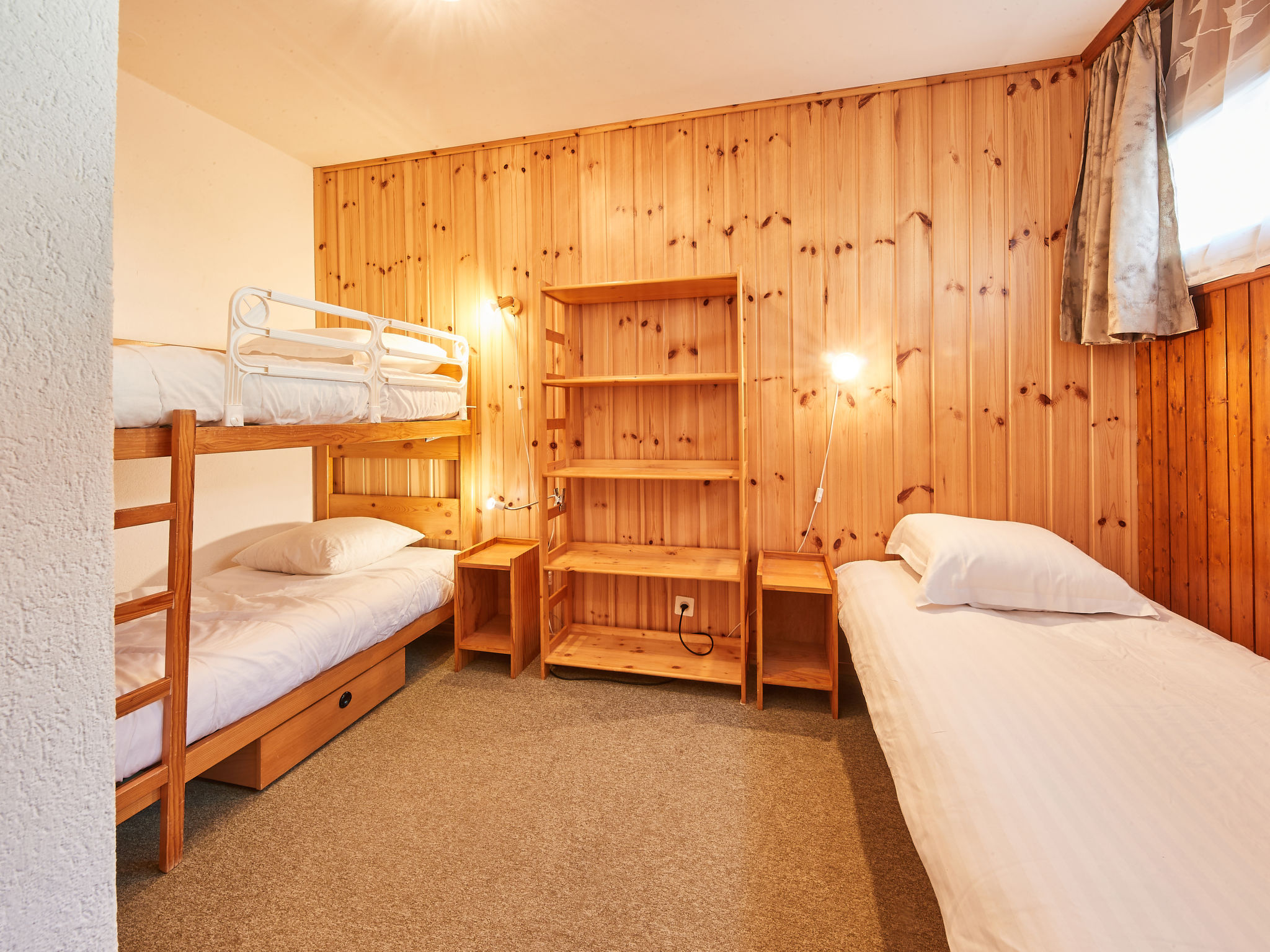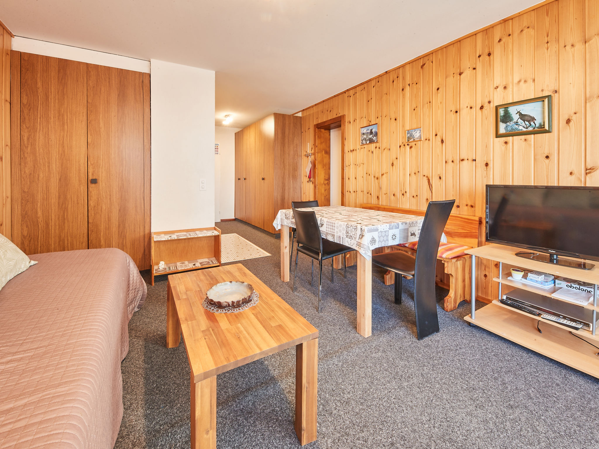 "Greppon 306", 2-Zimmer-Wohnung im 3. Stock. Zweckmässig und komfortabel eingerichtet: Wohn-/Schlafzimmer mit 1 Ausziehbett (2 Pers. 2 x 90 cm, Länge 200 cm), TV. Ausgang zum Balkon. 1 Zimmer mit 1 Bett (90 cm, Länge 180 cm), 1 x 2 Etagenbetten (90 cm, Länge 190 cm). Kleine, offene Küche (3 Kochplatten). Bad/WC. Teppichboden. Balkon, Westlage. Sehr schöne Sicht auf die Berge und die Landschaft. Bitte beachten: Nichtraucher-Unterkunft.