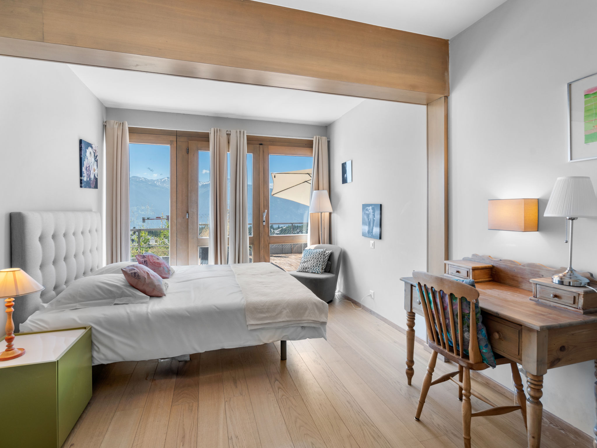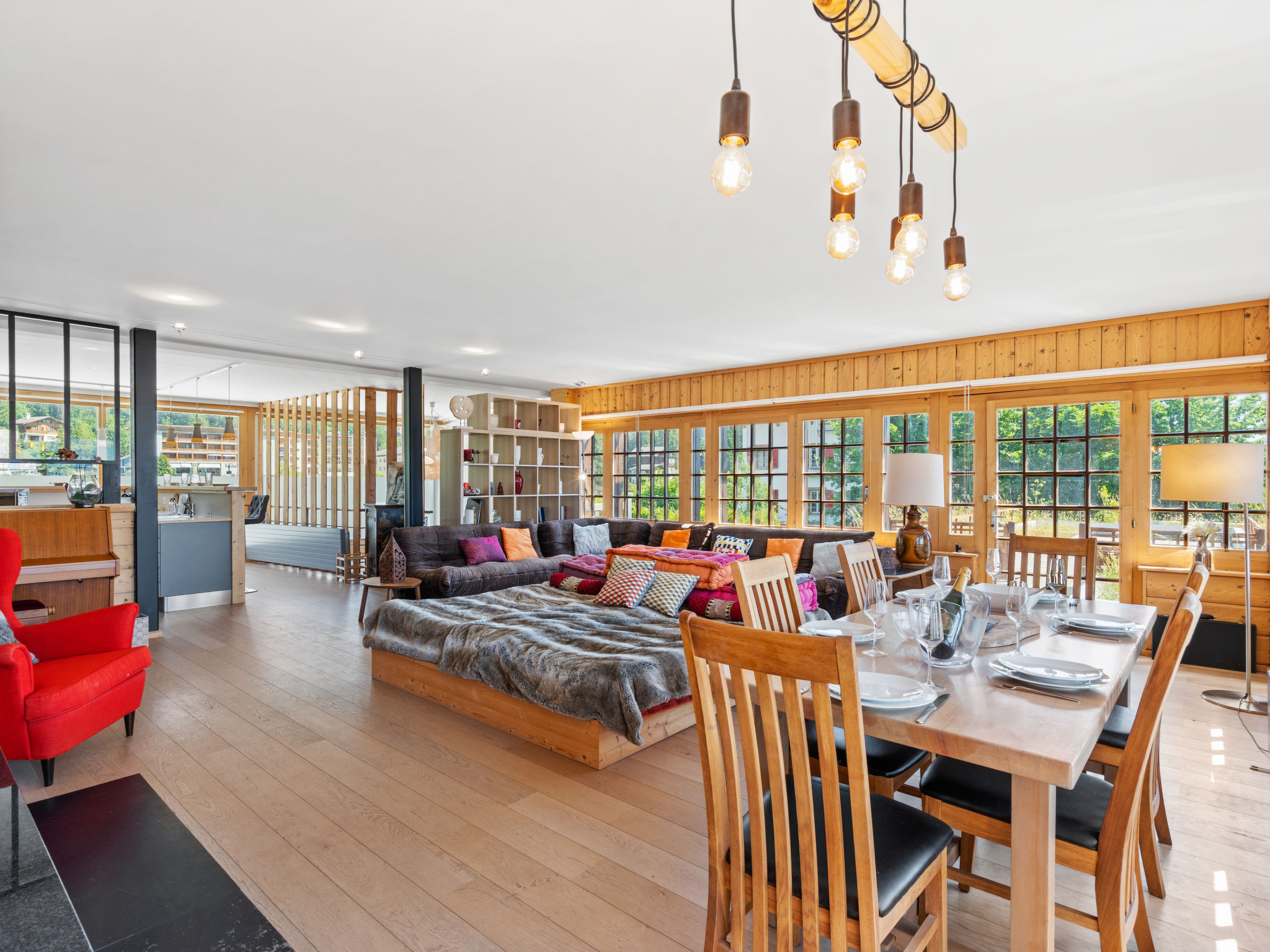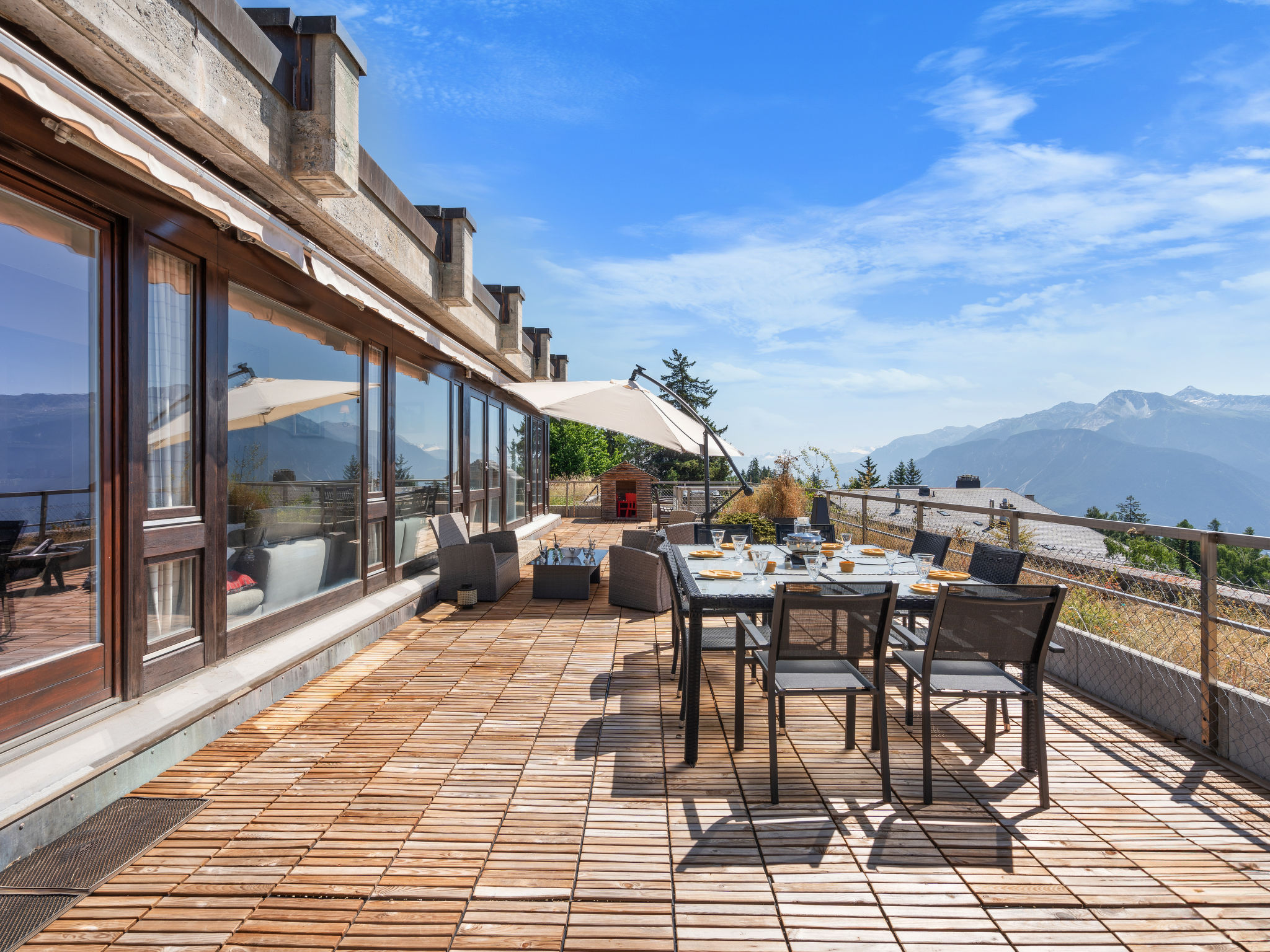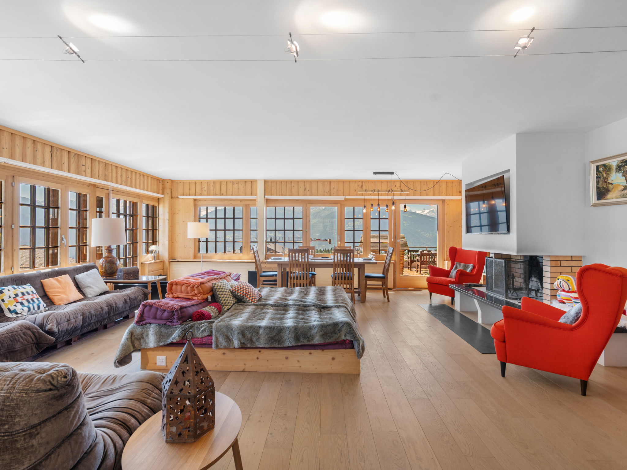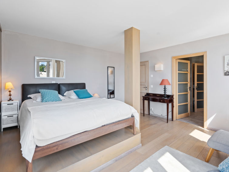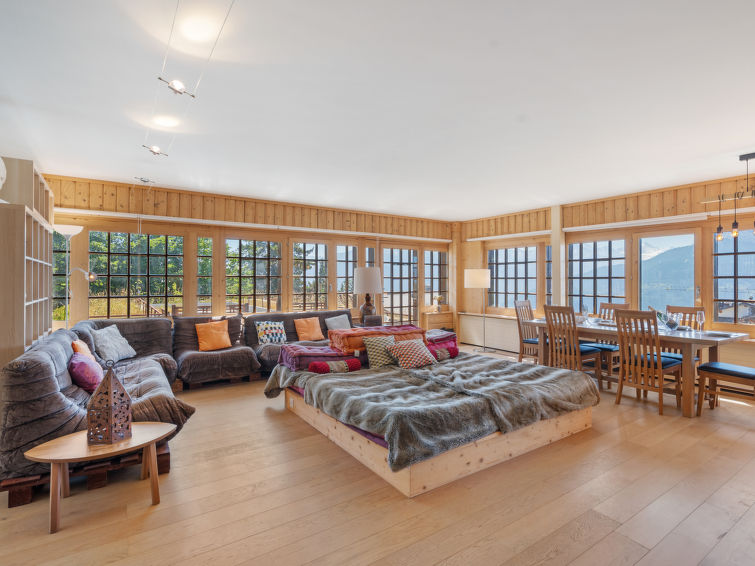 "Jeanne D'Arc LOFT COMBI", 10-Zimmer-Maisonette-Wohnung 350 m2, Südlage. Geräumig, komfortabel und geschmackvoll eingerichtet: grosses Wohn-/Esszimmer mit offenem Kamin, Esstisch und Kabel-TV. Ausgang zur Terrasse. 1 Zimmer mit 1 franz. Bett (160 cm, Länge 200 cm), Bad/WC, Doppelwaschbecken und Kabel-TV. 1 Zimmer mit 2 Betten (80 cm, Länge 200 cm), Dusche/WC. 1 Zimmer mit 2 Betten (80 cm, Länge 200 cm), Dusche/WC. Ausgang zur Terrasse. 1 Zimmer mit 2 Betten (90 cm, Länge 190 cm), Dusche/WC. 1 Zimmer mit 1 franz. Bett (160 cm, Länge 200 cm), Bad/WC und Doppelwaschbecken. Ausgang zur Terrasse. 1 Zimmer mit 1 Doppelbett (2 x 90 cm, Länge 200 cm), Dusche/WC. Ausgang zur Terrasse. Offene Küche (Backofen, Geschirrspüler, 4 Glaskeramikplatten, Toaster, Wasserkocher, Mikrowelle, Tiefkühler, elektrische Kaffeemaschine, Kapseln für die Kaffeemaschine (Nespresso) extra, Racletteofen, Fondue Set (Chinoise)) mit Bar. Sep. WC. Unteres Geschoss: (Wendeltreppe) grosses Spielzimmer mit Bar. Grosser Salon. Sep. WC, Sauna. Grosse Terrasse 50 m2, Südlage, grosse Terrasse 50 m2, Südlage und Ostlage. Terrassenmöbel, Gartengrill (mobil). Sehr schöne Panoramasicht auf den See, die Berge, das Tal und die Landschaft. Zur Verfügung: Waschmaschine, Wäschetrockner, Bügeleisen, Haartrockner. Internet (WLAN, gratis). Garage Nr. 21 (1 Auto) in 350 m, Höhe 200 cm, Breite 290 cm. Bitte beachten: geeignet für Familien. Nichtraucher-Haus. Eigener Eingang, kein Fahrstuhl. Kombination (Verbindungstür) aus 2 Wohnungen. Elektrischer Treppenlift zur Verfügung.
