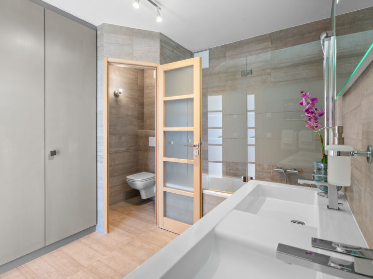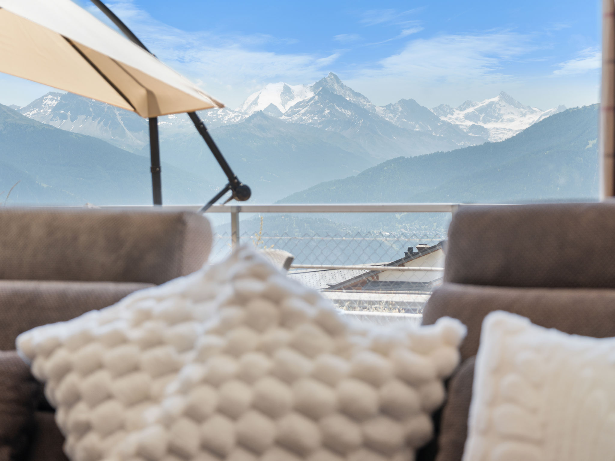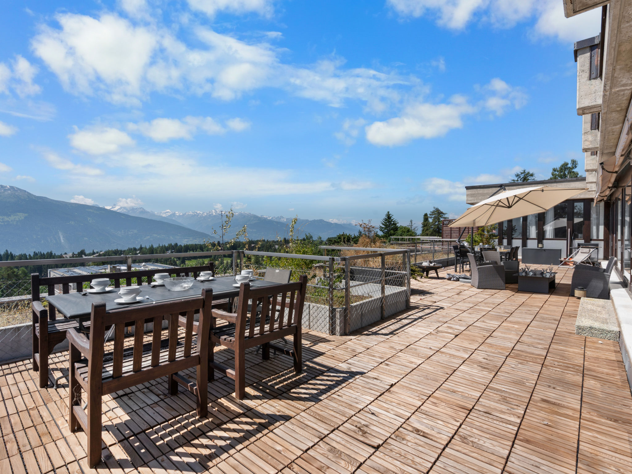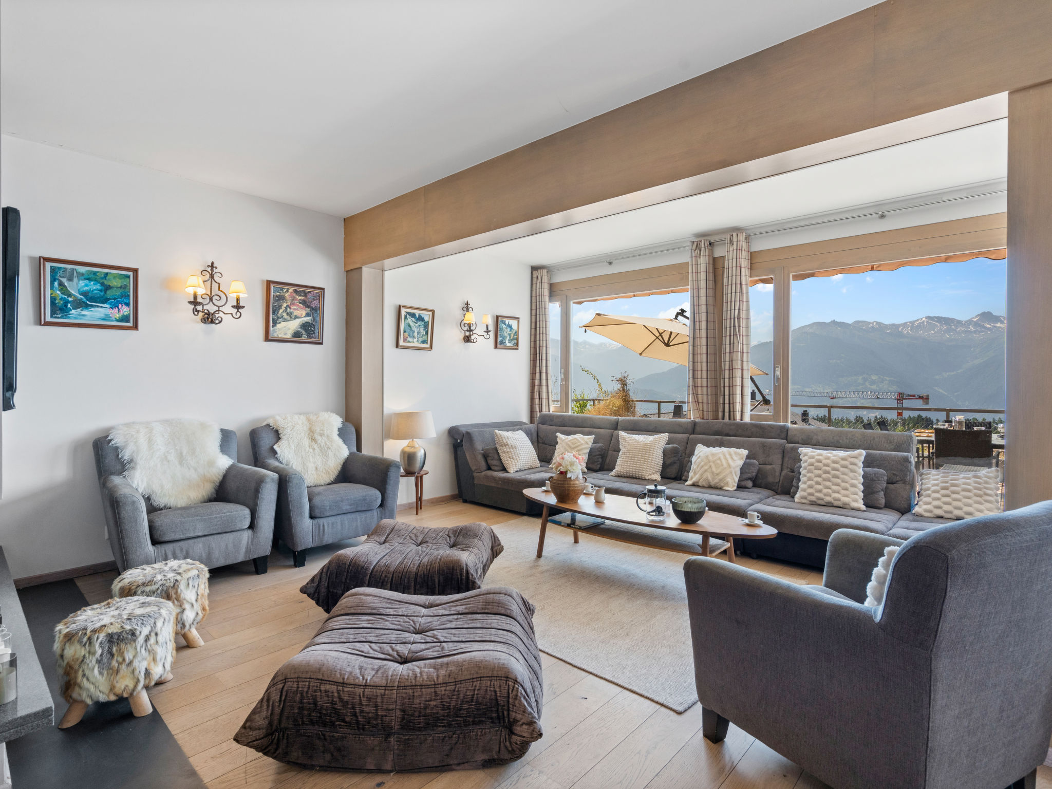 "Jeanne D'Arc LOFT COMBI", 10-Zimmer-Maisonette-Wohnung 350 m2, Südlage. Geräumig, komfortabel und geschmackvoll eingerichtet: grosses Wohn-/Esszimmer mit offenem Kamin, Esstisch und Kabel-TV. Ausgang zur Terrasse. 1 Zimmer mit 1 franz. Bett (160 cm, Länge 200 cm), Bad/WC, Doppelwaschbecken und Kabel-TV. 1 Zimmer mit 2 Betten (80 cm, Länge 200 cm), Dusche/WC. 1 Zimmer mit 2 Betten (80 cm, Länge 200 cm), Dusche/WC. Ausgang zur Terrasse. 1 Zimmer mit 2 Betten (90 cm, Länge 190 cm), Dusche/WC. 1 Zimmer mit 1 franz. Bett (160 cm, Länge 200 cm), Bad/WC und Doppelwaschbecken. Ausgang zur Terrasse. 1 Zimmer mit 1 Doppelbett (2 x 90 cm, Länge 200 cm), Dusche/WC. Ausgang zur Terrasse. Offene Küche (Backofen, Geschirrspüler, 4 Glaskeramikplatten, Toaster, Wasserkocher, Mikrowelle, Tiefkühler, elektrische Kaffeemaschine, Kapseln für die Kaffeemaschine (Nespresso) extra, Racletteofen, Fondue Set (Chinoise)) mit Bar. Sep. WC. Unteres Geschoss: (Wendeltreppe) grosses Spielzimmer mit Bar. Grosser Salon. Sep. WC, Sauna. Grosse Terrasse 50 m2, Südlage, grosse Terrasse 50 m2, Südlage und Ostlage. Terrassenmöbel, Gartengrill (mobil). Sehr schöne Panoramasicht auf den See, die Berge, das Tal und die Landschaft. Zur Verfügung: Waschmaschine, Wäschetrockner, Bügeleisen, Haartrockner. Internet (WLAN, gratis). Garage Nr. 21 (1 Auto) in 350 m, Höhe 200 cm, Breite 290 cm. Bitte beachten: geeignet für Familien. Nichtraucher-Haus. Eigener Eingang, kein Fahrstuhl. Kombination (Verbindungstür) aus 2 Wohnungen. Elektrischer Treppenlift zur Verfügung.