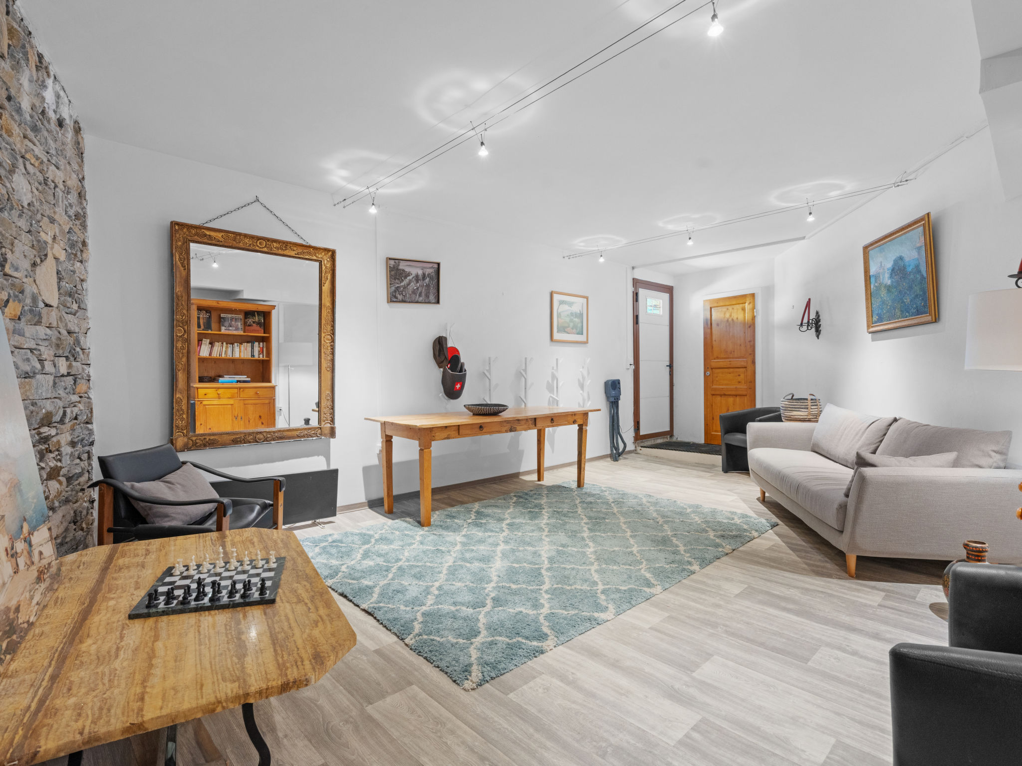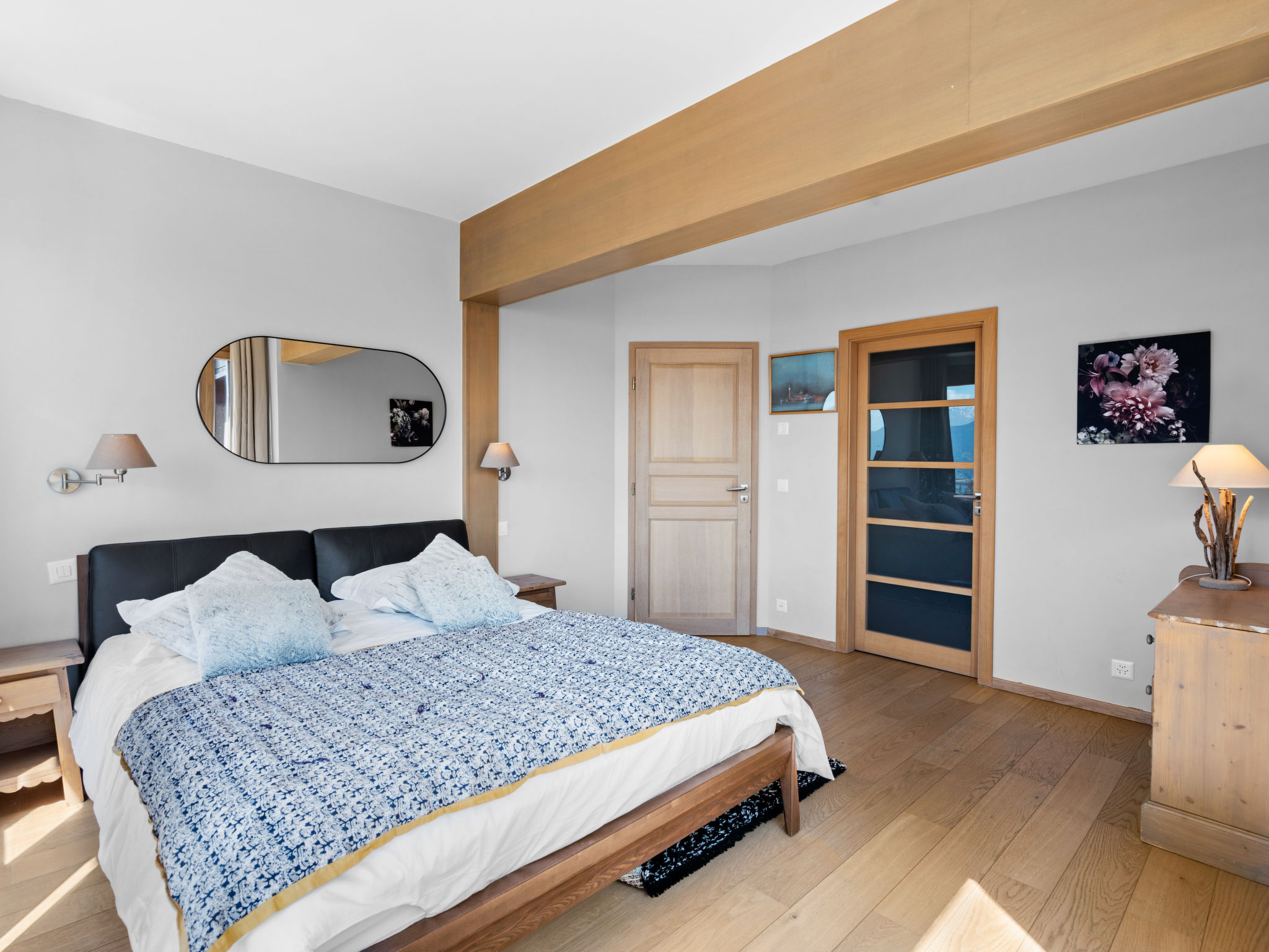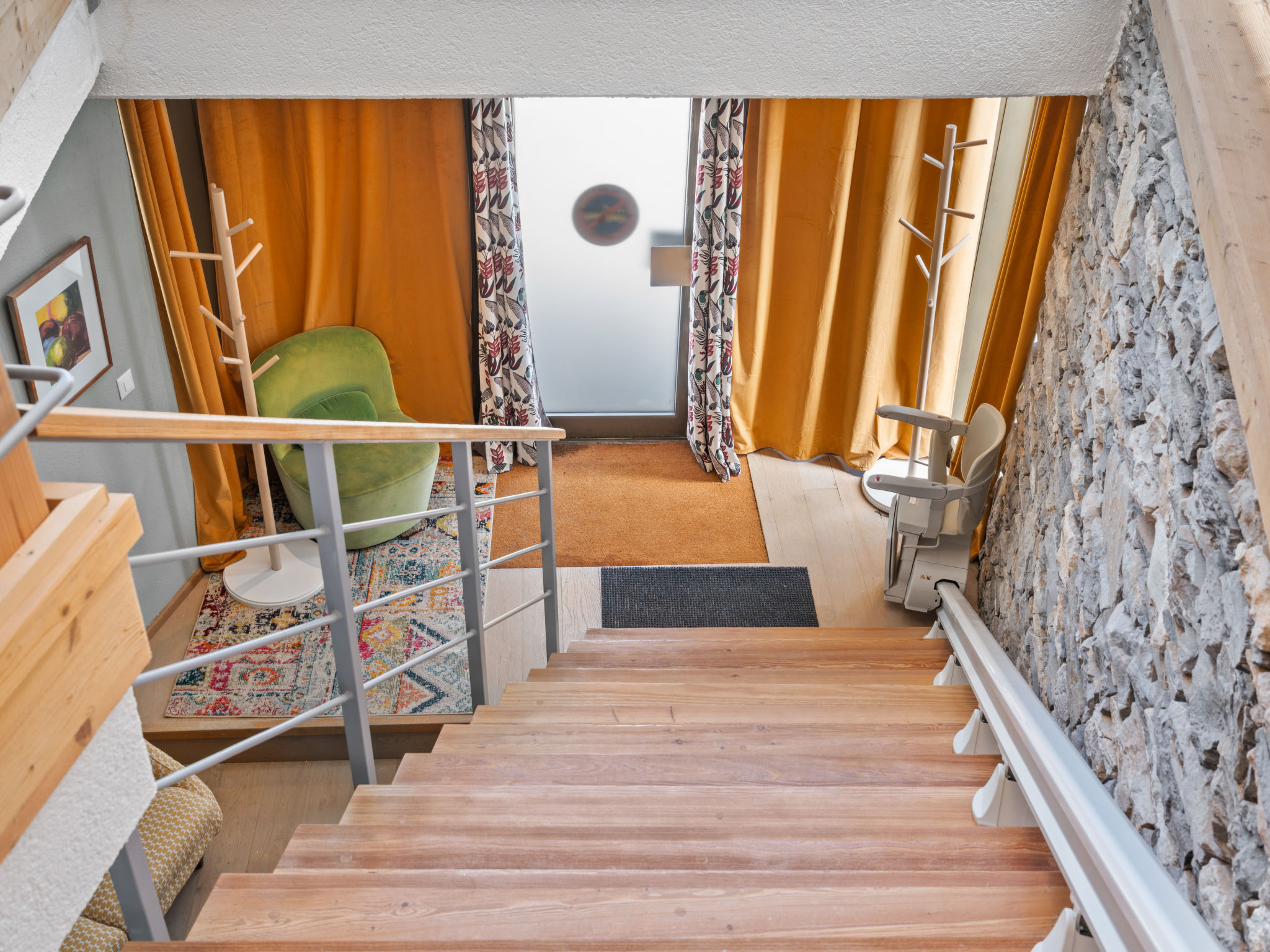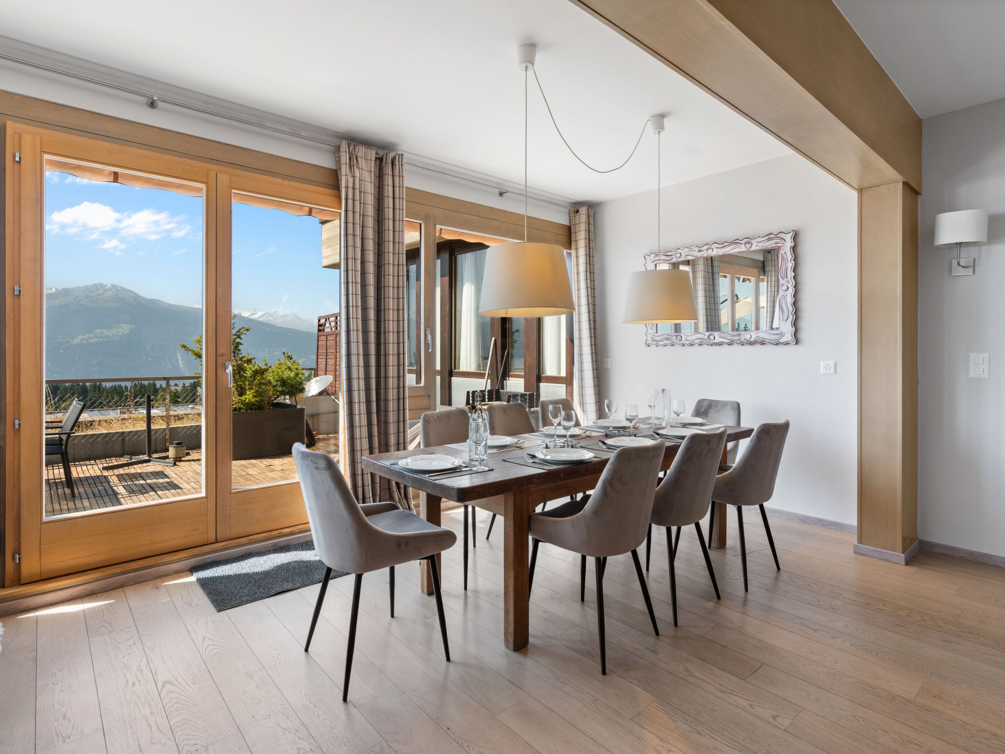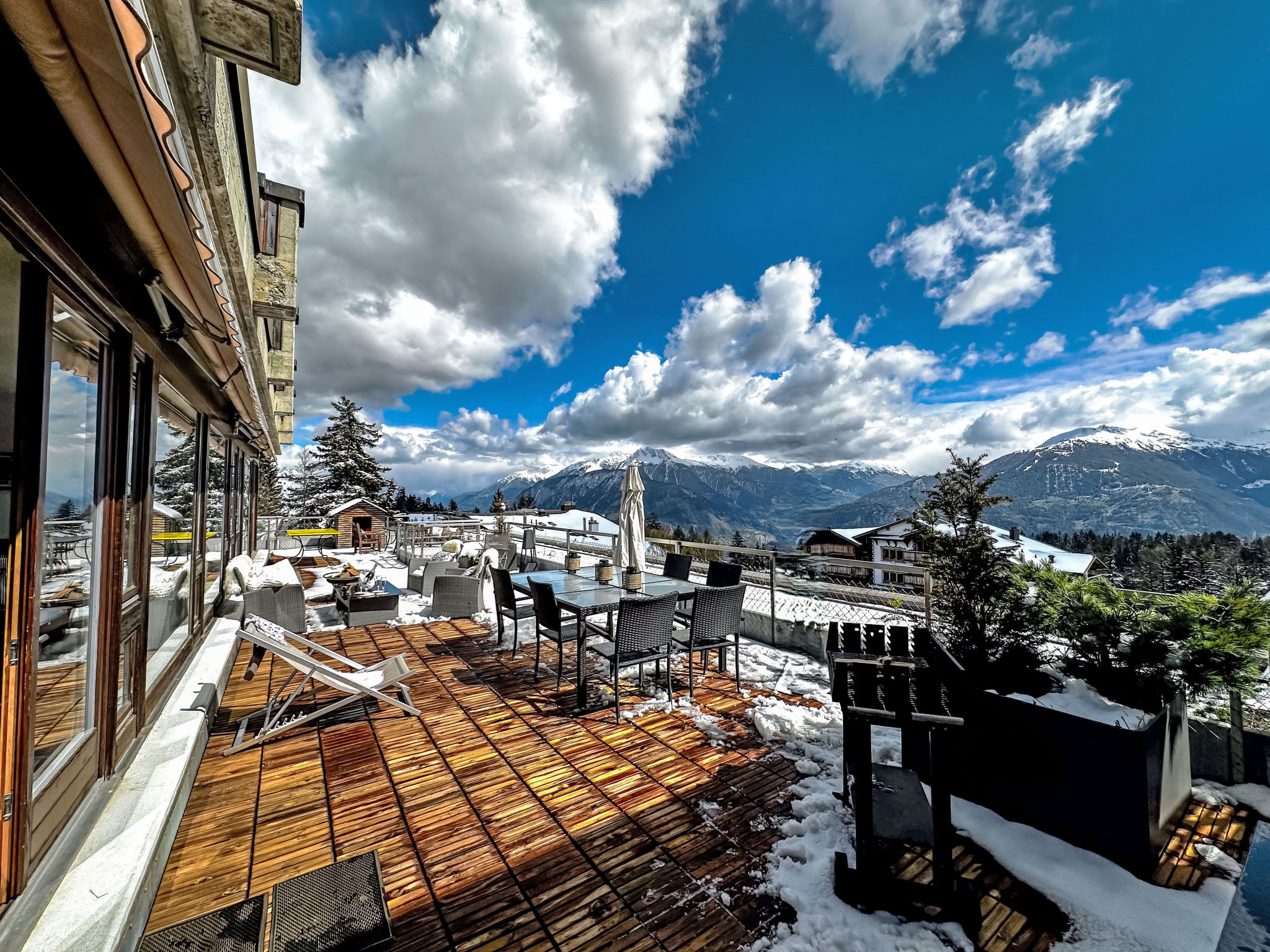 "Jeanne D'Arc LOFT COMBI", 10-Zimmer-Maisonette-Wohnung 350 m2, Südlage. Geräumig, komfortabel und geschmackvoll eingerichtet: grosses Wohn-/Esszimmer mit offenem Kamin, Esstisch und Kabel-TV. Ausgang zur Terrasse. 1 Zimmer mit 1 franz. Bett (160 cm, Länge 200 cm), Bad/WC, Doppelwaschbecken und Kabel-TV. 1 Zimmer mit 2 Betten (80 cm, Länge 200 cm), Dusche/WC. 1 Zimmer mit 2 Betten (80 cm, Länge 200 cm), Dusche/WC. Ausgang zur Terrasse. 1 Zimmer mit 2 Betten (90 cm, Länge 190 cm), Dusche/WC. 1 Zimmer mit 1 franz. Bett (160 cm, Länge 200 cm), Bad/WC und Doppelwaschbecken. Ausgang zur Terrasse. 1 Zimmer mit 1 Doppelbett (2 x 90 cm, Länge 200 cm), Dusche/WC. Ausgang zur Terrasse. Offene Küche (Backofen, Geschirrspüler, 4 Glaskeramikplatten, Toaster, Wasserkocher, Mikrowelle, Tiefkühler, elektrische Kaffeemaschine, Kapseln für die Kaffeemaschine (Nespresso) extra, Racletteofen, Fondue Set (Chinoise)) mit Bar. Sep. WC. Unteres Geschoss: (Wendeltreppe) grosses Spielzimmer mit Bar. Grosser Salon. Sep. WC, Sauna. Grosse Terrasse 50 m2, Südlage, grosse Terrasse 50 m2, Südlage und Ostlage. Terrassenmöbel, Gartengrill (mobil). Sehr schöne Panoramasicht auf den See, die Berge, das Tal und die Landschaft. Zur Verfügung: Waschmaschine, Wäschetrockner, Bügeleisen, Haartrockner. Internet (WLAN, gratis). Garage Nr. 21 (1 Auto) in 350 m, Höhe 200 cm, Breite 290 cm. Bitte beachten: geeignet für Familien. Nichtraucher-Haus. Eigener Eingang, kein Fahrstuhl. Kombination (Verbindungstür) aus 2 Wohnungen. Elektrischer Treppenlift zur Verfügung.