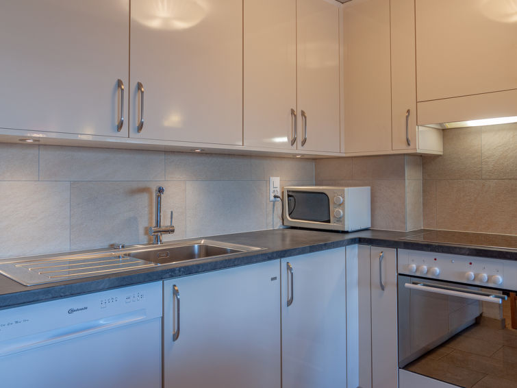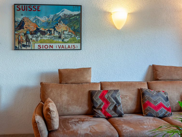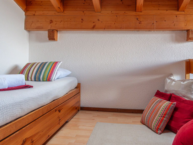 "Anemone 9", 3-Zimmer-Attikawohnung 75 m2 auf 2 Stockwerken. Schön eingerichtet: Wohn-/Esszimmer mit Panoramafenster mit offenem Kamin. Ausgang zum Balkon. 1 Zimmer mit 1 franz. Bett (160 cm, Länge 200 cm). Ausgang zum Balkon. Küche (Backofen, Geschirrspüler, Toaster, Wasserkocher, Mikrowelle, elektrische Kaffeemaschine, Kapseln für die Kaffeemaschine (Nespresso) extra, Fondue Set (Käse)). Dusche/WC. Dachgeschoss: offene Galerie mit 1 Bett (90 cm, Länge 190 cm), Kabel-TV und DVD. 1 Zimmer mit 2 Betten (90 cm, Länge 200 cm). Dusche/WC. Balkon, Südwestlage Balkon, Nordostlage. Panoramasicht auf die Berge und das Tal. Zur Verfügung: Internet (Wireless LAN, gratis). Bitte beachten: Nichtraucher-Unterkunft. Anstelle eines abgeschlossenen Schlafzimmers befinden sich manche Schlafplätze in einem offenen Bereich (Galerie, Nische etc.).