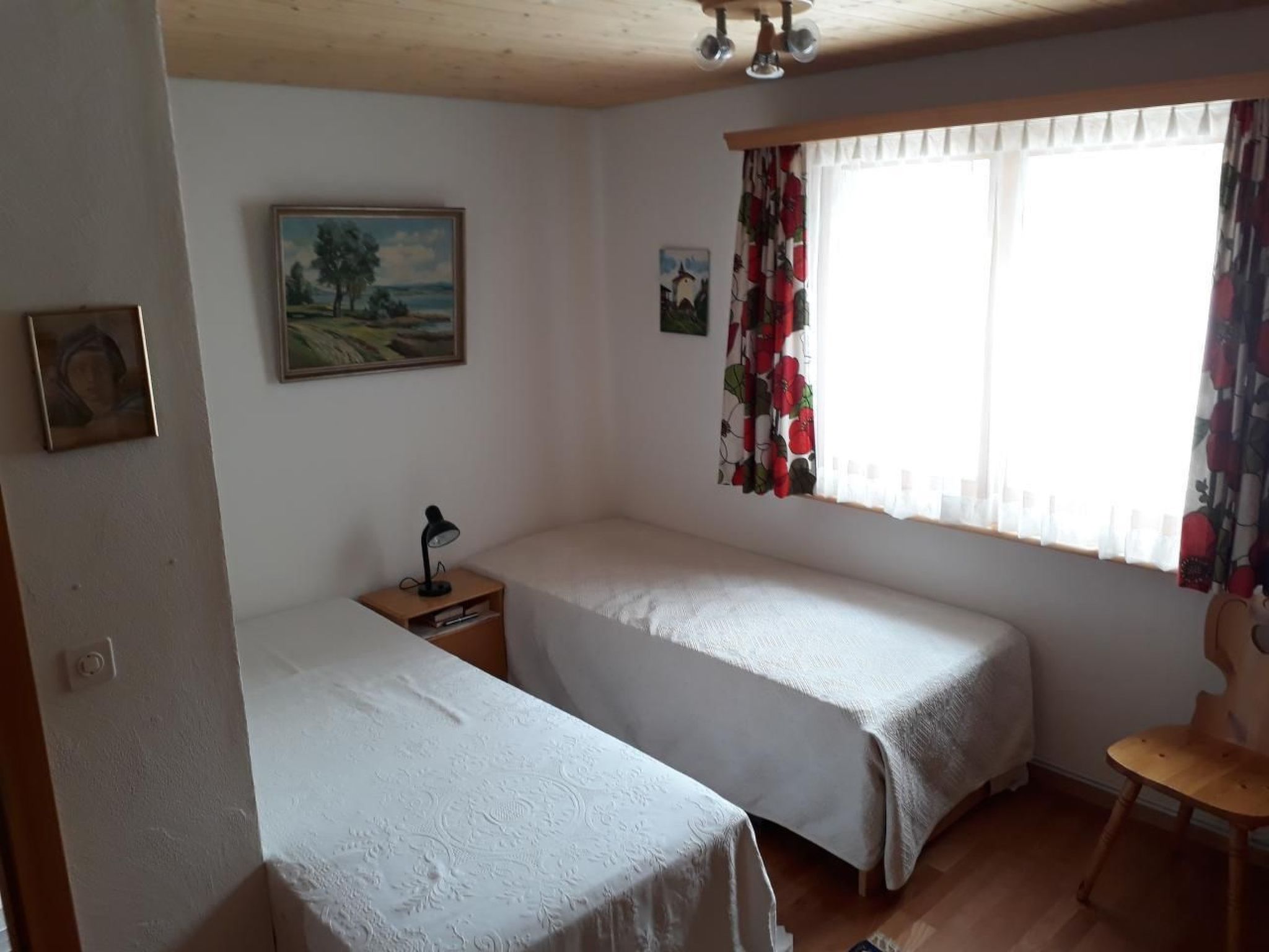 Zur Ausstattung der einzelnen Räumlichkeiten: Offene Küche mit kleinem Tisch (2 Personen) , 4 Herdplatten, Backofen, Wasserkocher, Kaffeemaschine, Kühlschrank, Gefrierschrank, Handrührwerk, Racletteofen und Fonduecaquelon. Helles Wohnzimmer mit grossem Esstisch und 8 Stühlen, Sideboard mit einigen Spielen, Sofa, Lehnstuhl und TV. Das Cheminee und die hohe Decke bis zum Giebel vermitteln Ferienstimmung. Terrasse, 18 m2 mit verglaster Ecke, Gartentisch, 6 Stühlen und 2 Liegestühlen. Schlafzimmer 1 mit Doppelbett (2 einzelne Matratzen), Nachttischchen mit Nachttischlampen, 2 Stühlen, 5-türigem Schrank, Kommode mit Spiegel, hohe Decke bis zum Giebel. Schlafzimmer 2 mit zwei einzelnen Betten (zusammenschiebbar), Nachttisch, Nachttischlampen, 2 Stühlen, 4-türigem Schrank, kleineres Sideboard. Badezimmer mit Badewanne, separater Dusche, Lavabo, kleinem Schränkchen, Fön und Toilette. Gang mit Garderobe. Beim Eingang im EG befindet sich eine Schuhablage. Ein Parkplatz steht vor dem Haus zur Verfügung.