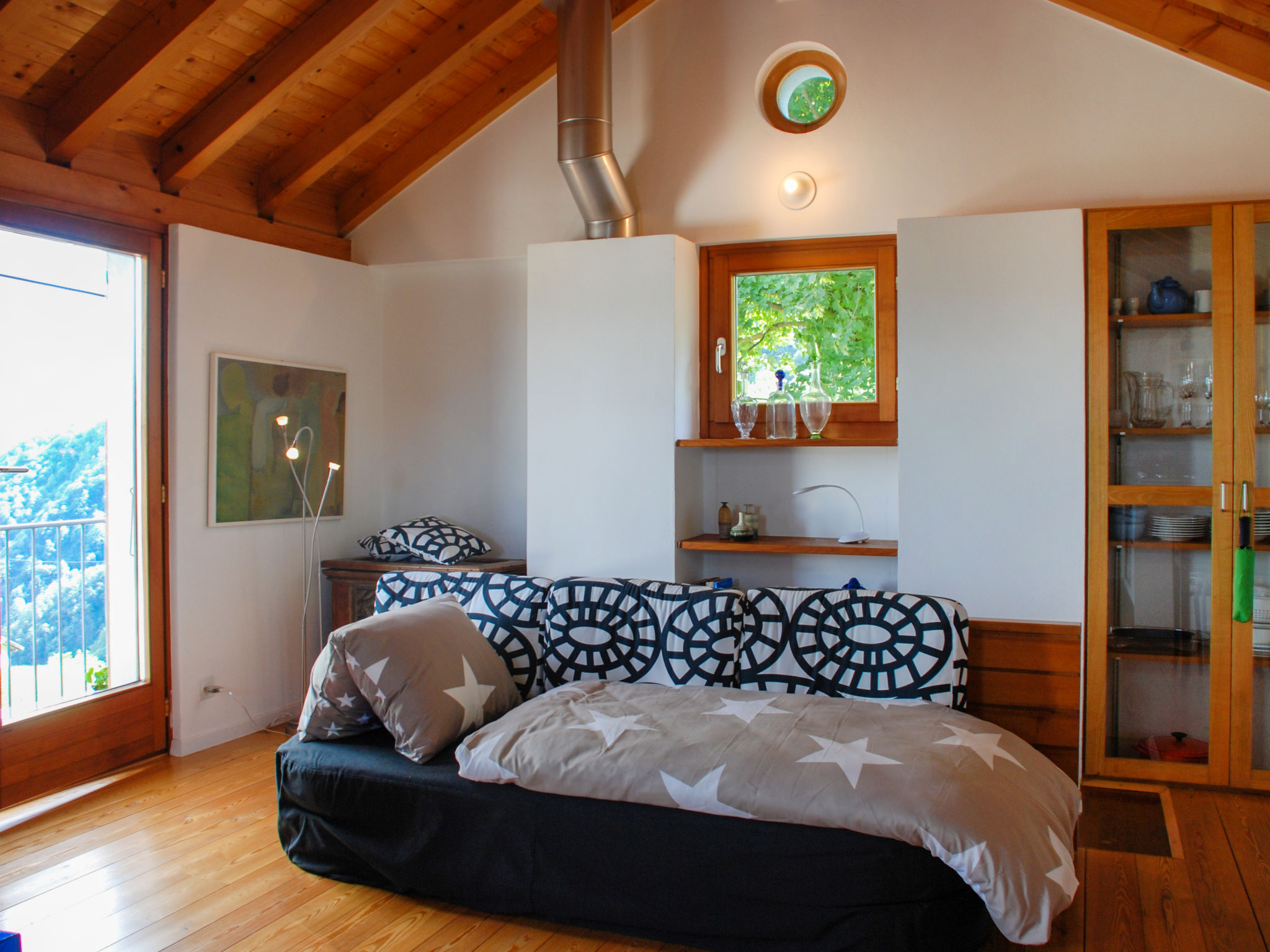 "Baita Pimpisnino", 2-Zimmer-Haus 35 m2 auf 2 Stockwerken. Objekt geeignet für 2 Erwachsene + 2 Kinder. Komfortabel und gemütlich eingerichtet: offenes Wohn-/Esszimmer mit 1 Diwanbett (90 cm, Länge 200 cm), Esstisch und Holzofen. Ausgang zum Balkon, zum Gartensitzplatz. Offene Küche im Eingang (Backofen, Gasherd, 4 Flammen). Unteres Geschoss: 1 Doppelzimmer mit 1 Bett (90 cm, Länge 200 cm), 1 Doppelbett (2 x 90 cm, Länge 200 cm), Schwedenofen. Ausgang zum Garten. Dusche/WC. Holzheizung. Kleiner Balkon, Südlage. Gartengrill, Liegestühle (1), Sitzplatz. Herrliche Panoramasicht auf den See, die Berge und die Landschaft. Zur Verfügung: Internet (Wireless LAN). Bitte beachten: Nichtraucher-Haus. Maximal 1 kleines Haustier/Hund erlaubt. Aus- und Beladen 60 m vom Haus möglich. Im Weiler Pimpisnino hat es fast keine Parkmöglichkeiten, 600m weiter die Strasse hoch gibt es Anzahl begrenzte Parkplätze, da beginnt das Wanderparadies! Es dürfen KEINE Elektrogeräte benutzt werden. NL-00005855