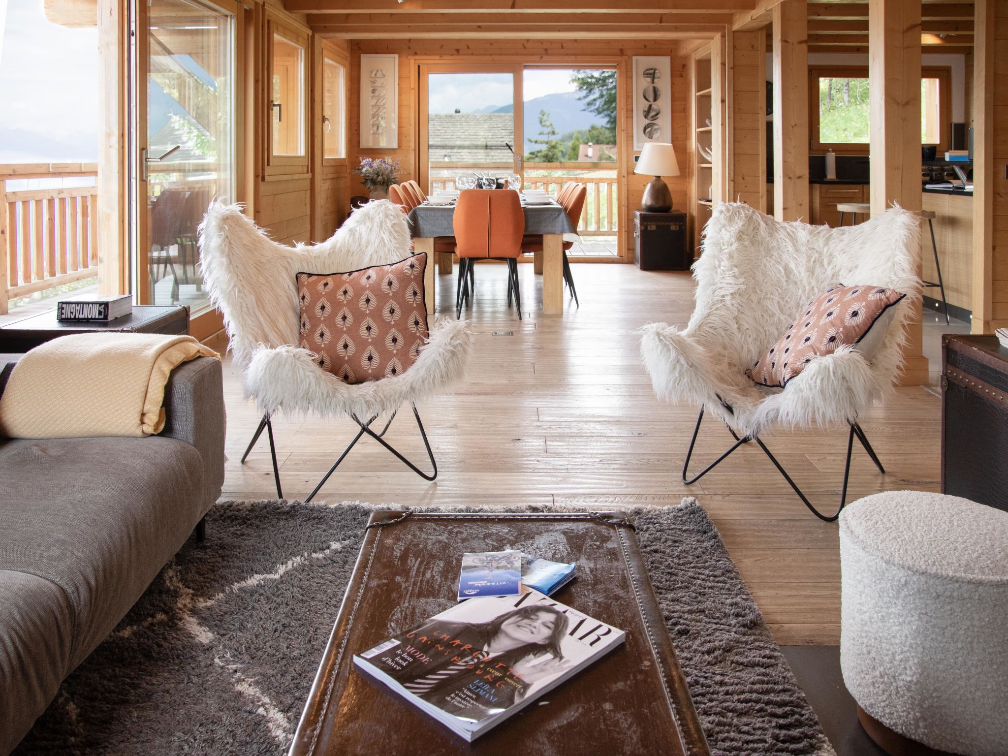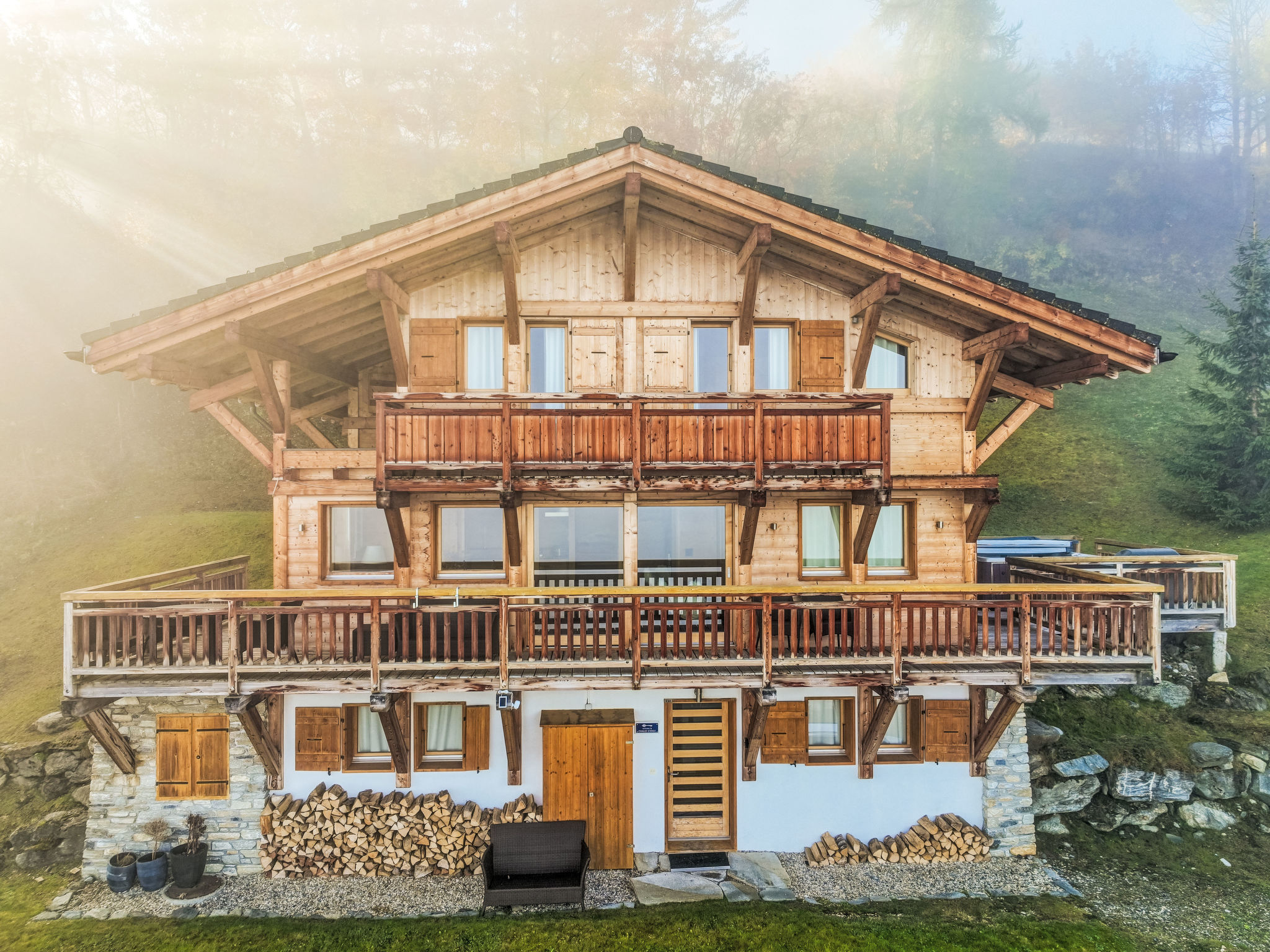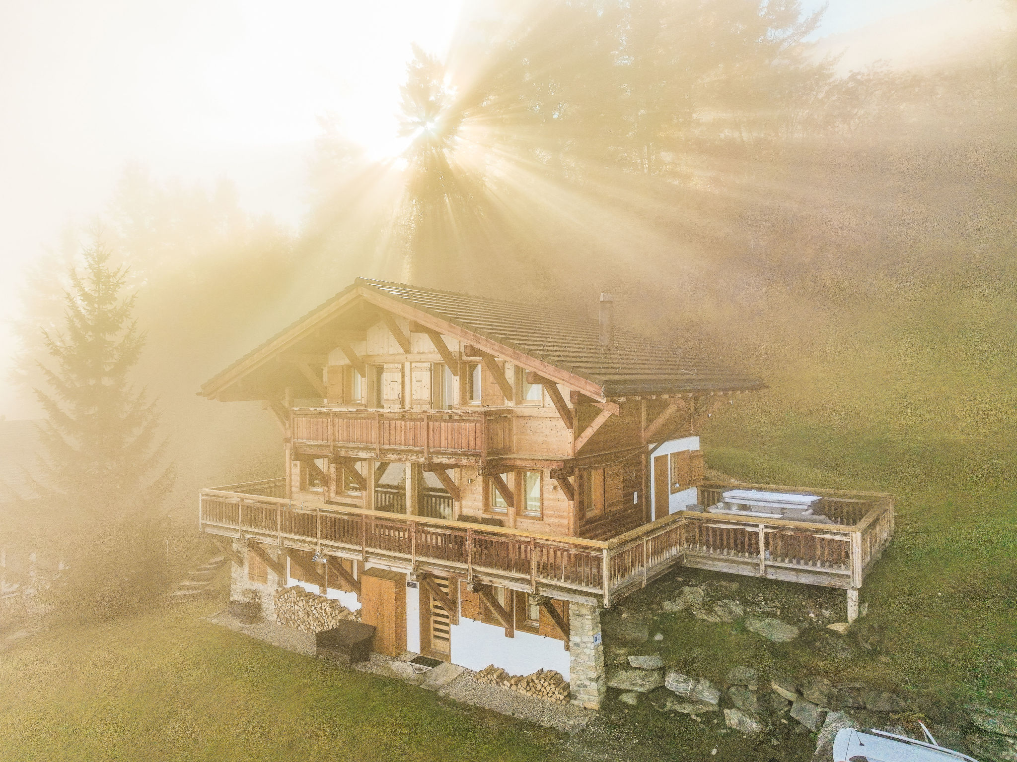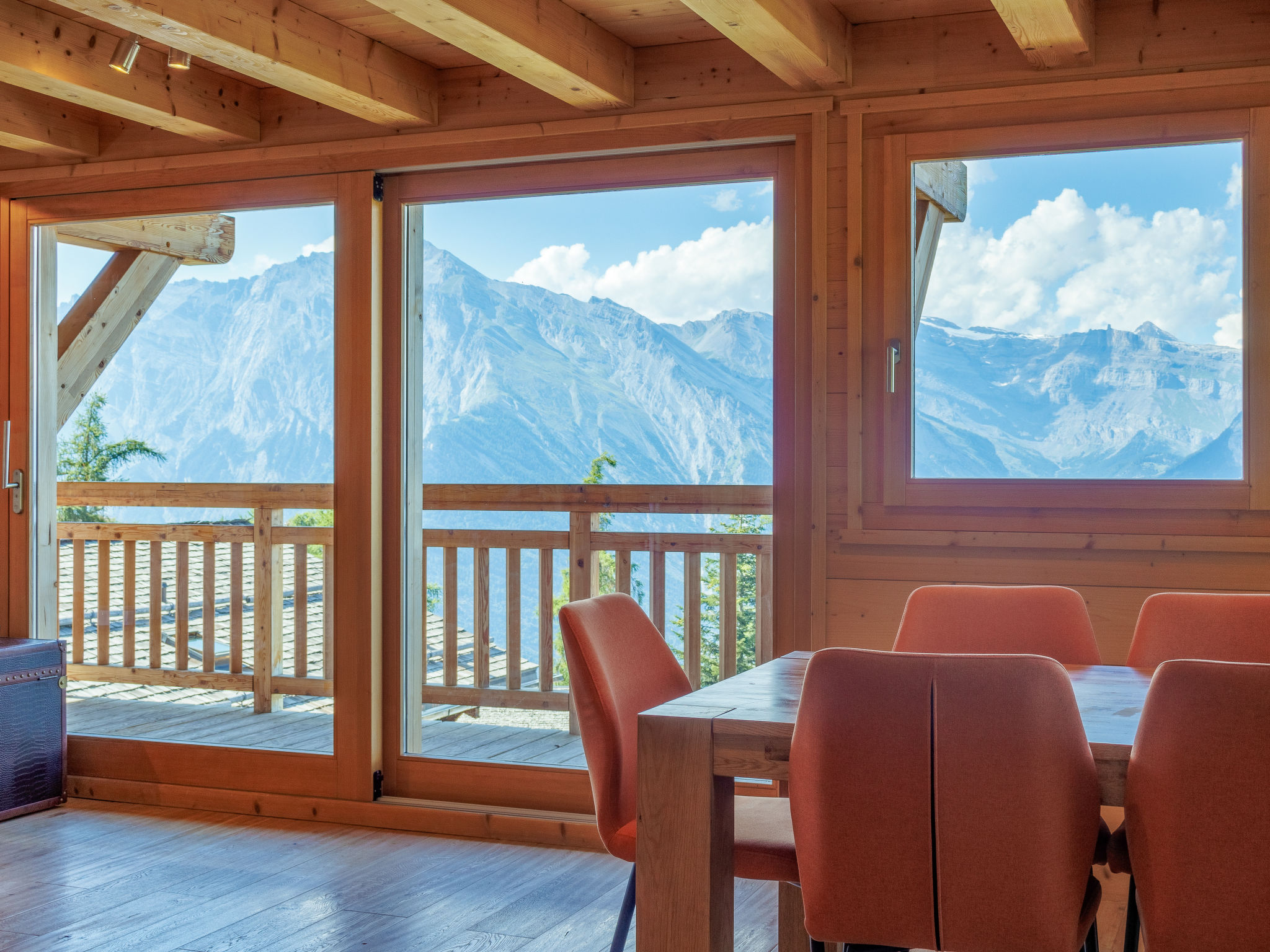 "Etoile", 6-Zimmer-Chalet 220 m2 auf 3 Stockwerken. Geräumig, komfortabel und geschmackvoll eingerichtet: Wohnzimmer mit offenem Kamin und Kabel-TV. Ausgang zur Terrasse, Richtung Osten. Wohn-/Esszimmer mit offenem Kamin und Kabel-TV. Ausgang zum Balkon, Richtung Norden. Offene Küche (Backofen, Geschirrspüler, 4 Induktionskochplatten, Toaster, Wasserkocher, Mikrowelle, elektrische Kaffeemaschine, Kapseln für die Kaffeemaschine (Nespresso) extra, Racletteofen, Fondue Set (Chinoise, Käse)). Unteres Geschoss: Eingang. 2 Zimmer, jedes Zimmer mit 2 Betten (90 cm, Länge 200 cm), Dusche/WC. Sep. WC. Fussbodenheizung. Obergeschoss: 2 Zimmer, jedes Zimmer mit 1 Doppelbett (2 x 90 cm, Länge 200 cm), Bad/Dusche/WC und Doppelwaschbecken. Ausgang zum Balkon, Richtung Norden. Balkon, Terrasse. Terrassenmöbel, Gartengrill. Herrliche Panoramasicht auf die Berge. Zur Verfügung: Waschmaschine, Wäschetrockner, Bügeleisen, Haartrockner. Internet (WLAN, gratis). Parkplatz (2 Autos), im Winter in 500 m. Bitte beachten: Nichtraucher-Unterkunft.