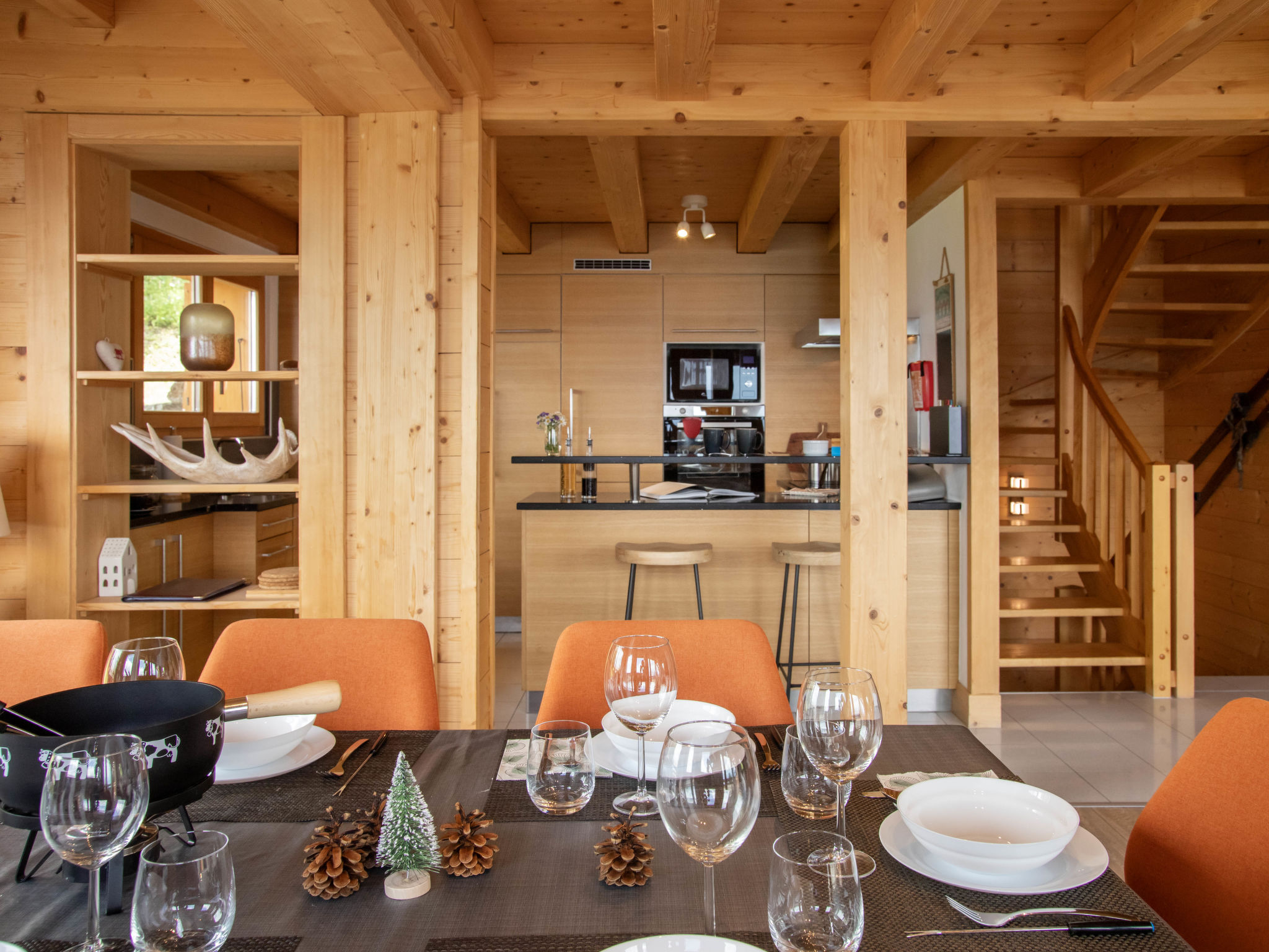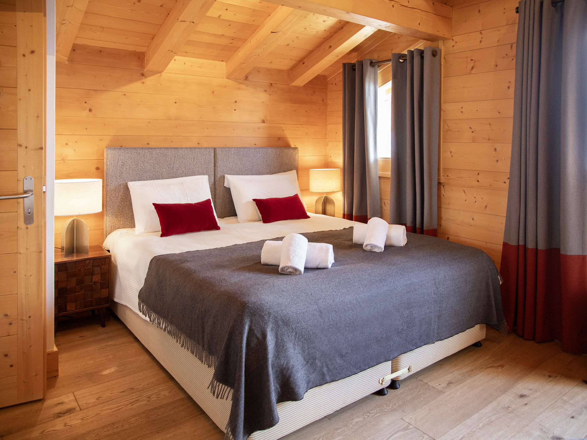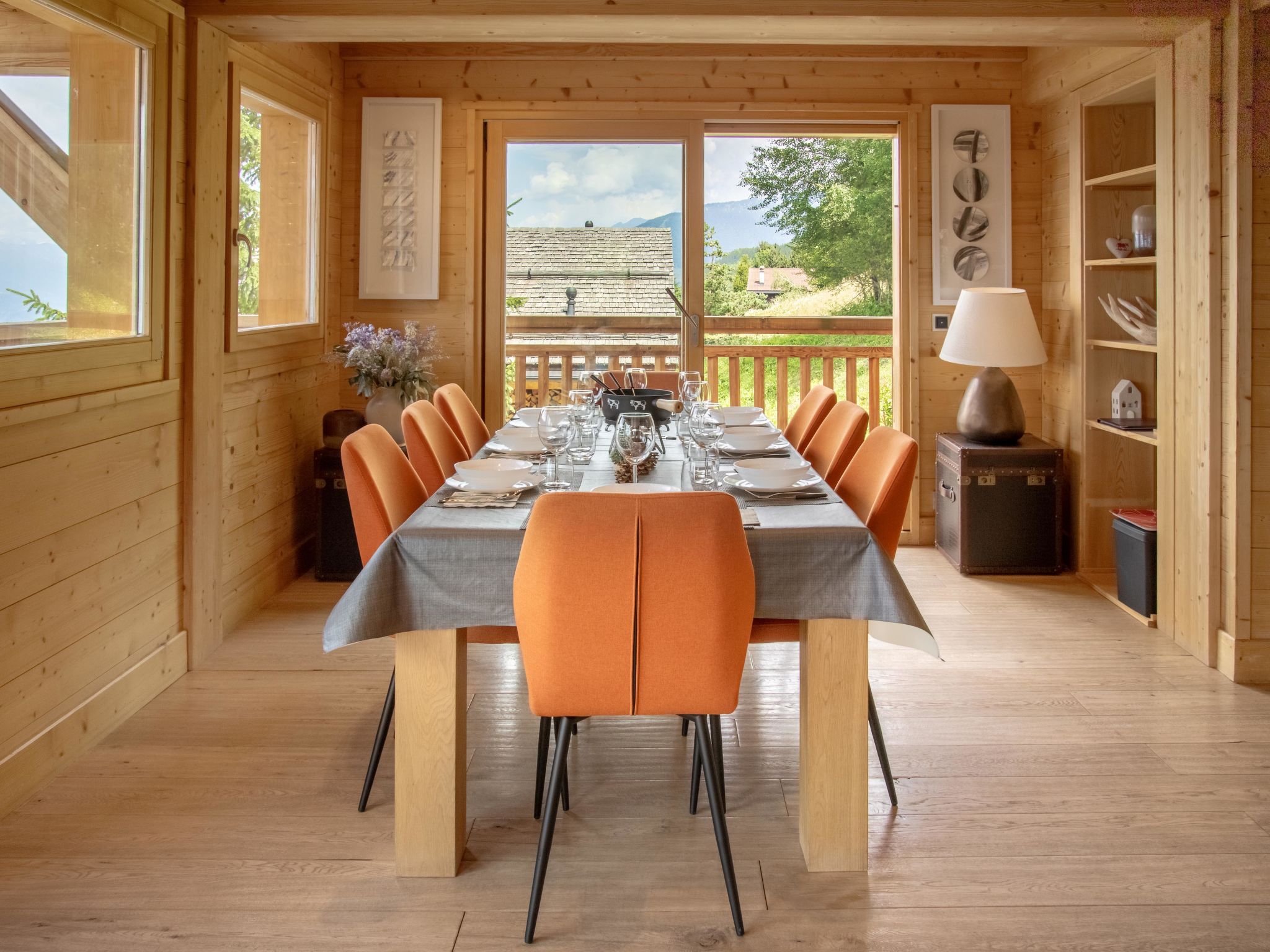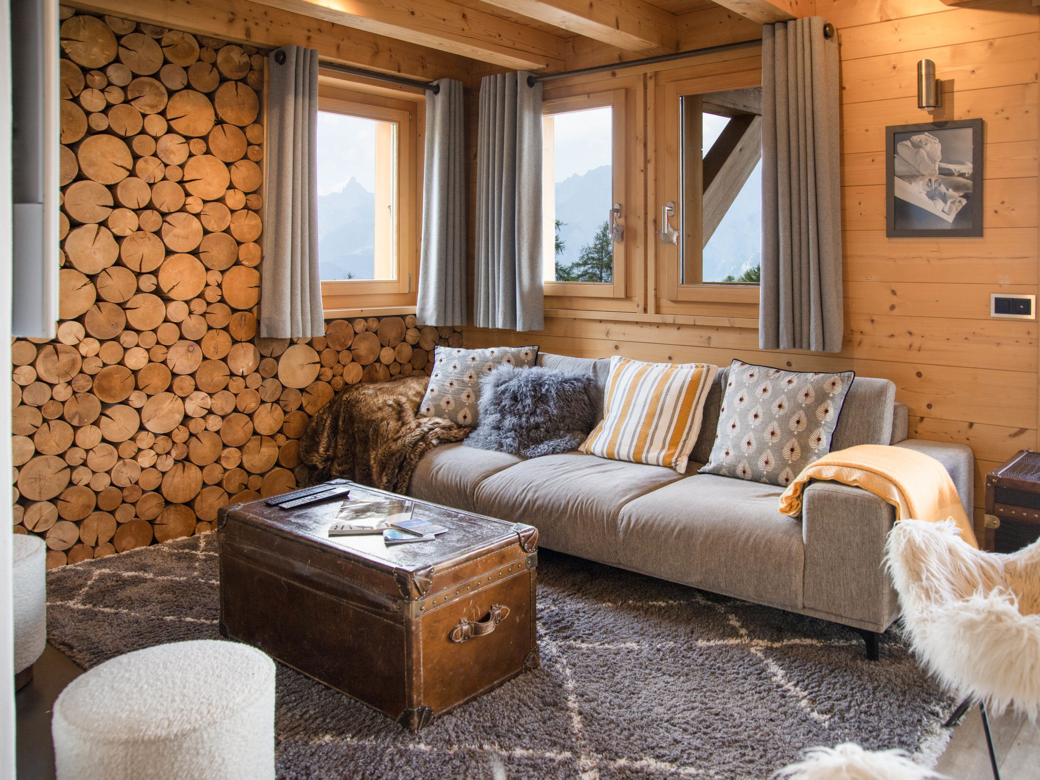 "Etoile", 6-Zimmer-Chalet 220 m2 auf 3 Stockwerken. Geräumig, komfortabel und geschmackvoll eingerichtet: Wohnzimmer mit offenem Kamin und Kabel-TV. Ausgang zur Terrasse, Richtung Osten. Wohn-/Esszimmer mit offenem Kamin und Kabel-TV. Ausgang zum Balkon, Richtung Norden. Offene Küche (Backofen, Geschirrspüler, 4 Induktionskochplatten, Toaster, Wasserkocher, Mikrowelle, elektrische Kaffeemaschine, Kapseln für die Kaffeemaschine (Nespresso) extra, Racletteofen, Fondue Set (Chinoise, Käse)). Unteres Geschoss: Eingang. 2 Zimmer, jedes Zimmer mit 2 Betten (90 cm, Länge 200 cm), Dusche/WC. Sep. WC. Fussbodenheizung. Obergeschoss: 2 Zimmer, jedes Zimmer mit 1 Doppelbett (2 x 90 cm, Länge 200 cm), Bad/Dusche/WC und Doppelwaschbecken. Ausgang zum Balkon, Richtung Norden. Balkon, Terrasse. Terrassenmöbel, Gartengrill. Herrliche Panoramasicht auf die Berge. Zur Verfügung: Waschmaschine, Wäschetrockner, Bügeleisen, Haartrockner. Internet (WLAN, gratis). Parkplatz (2 Autos), im Winter in 500 m. Bitte beachten: Nichtraucher-Unterkunft.