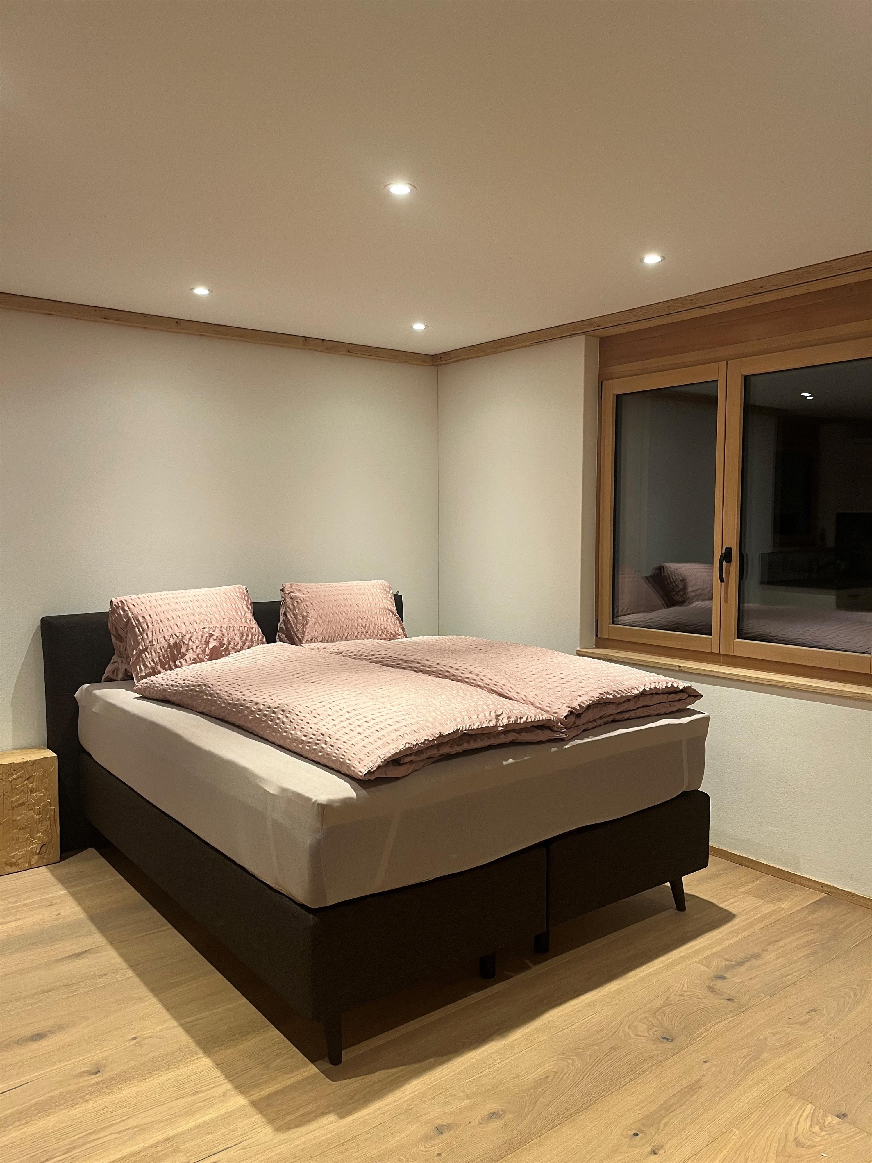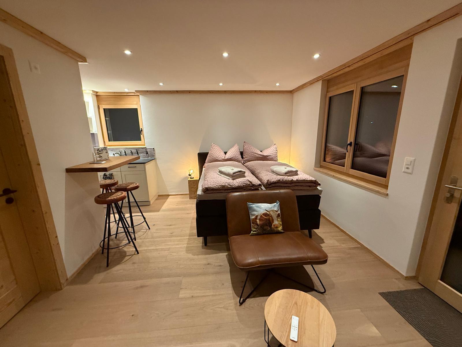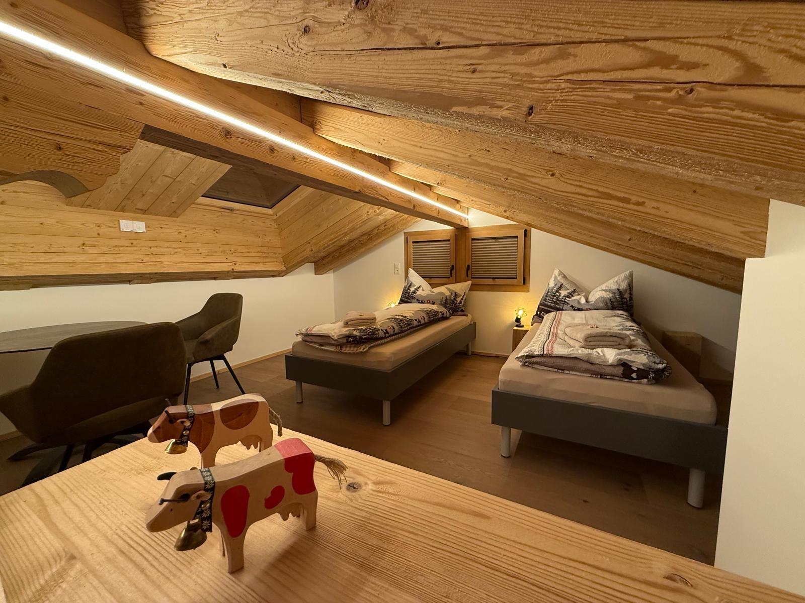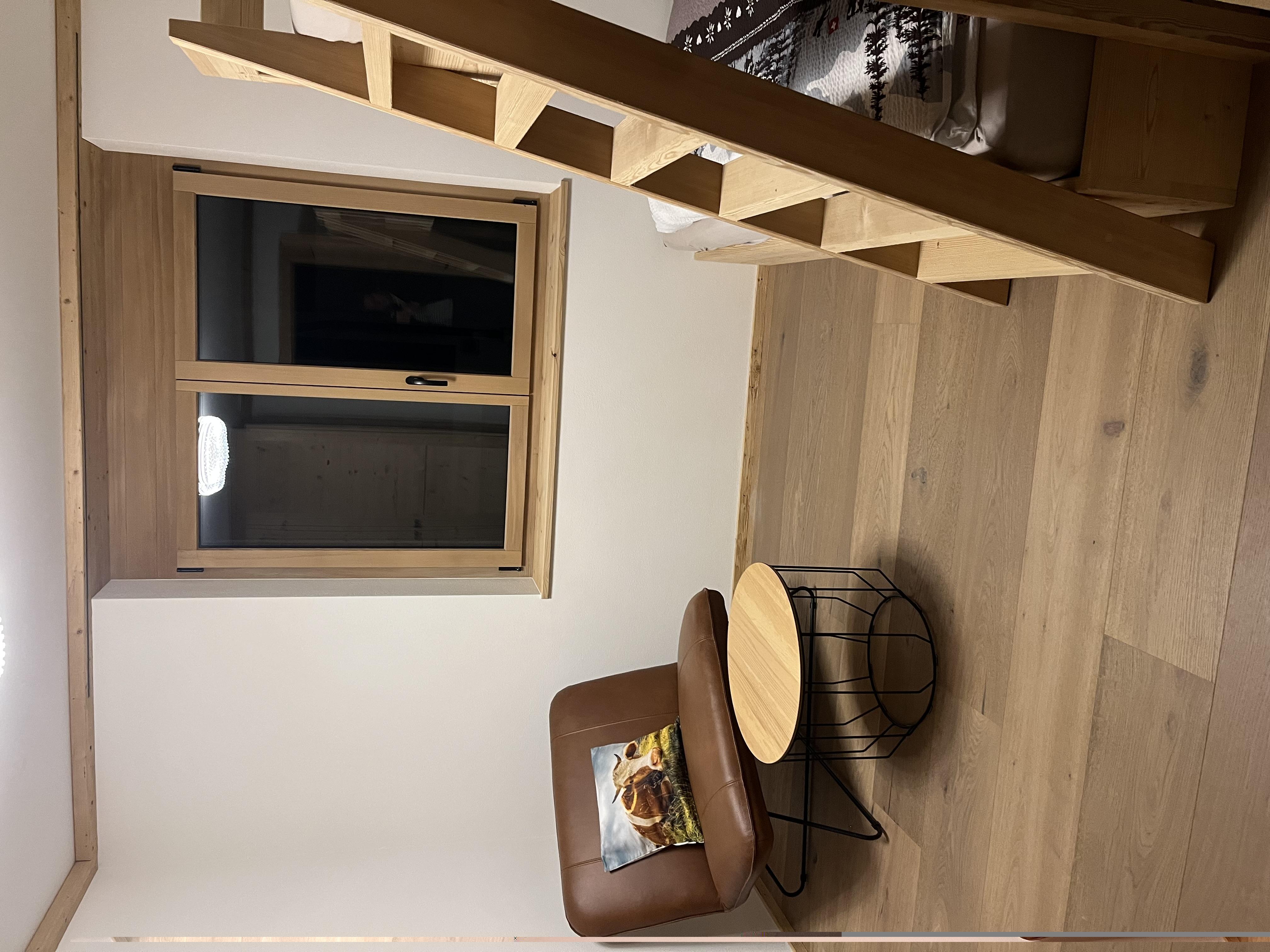Vom Autounterstand erreichen Sie über wenige Stufen den Eingang im Erdgeschoss. Dort befindet sich ein Zimmer, das mit einem halbhoch Stockbett (Alphüttli Style) ausgestattet ist. Von diesem Zimmer führt eine Balkontüre nach draussen auf den eigenen Sitzplatz.