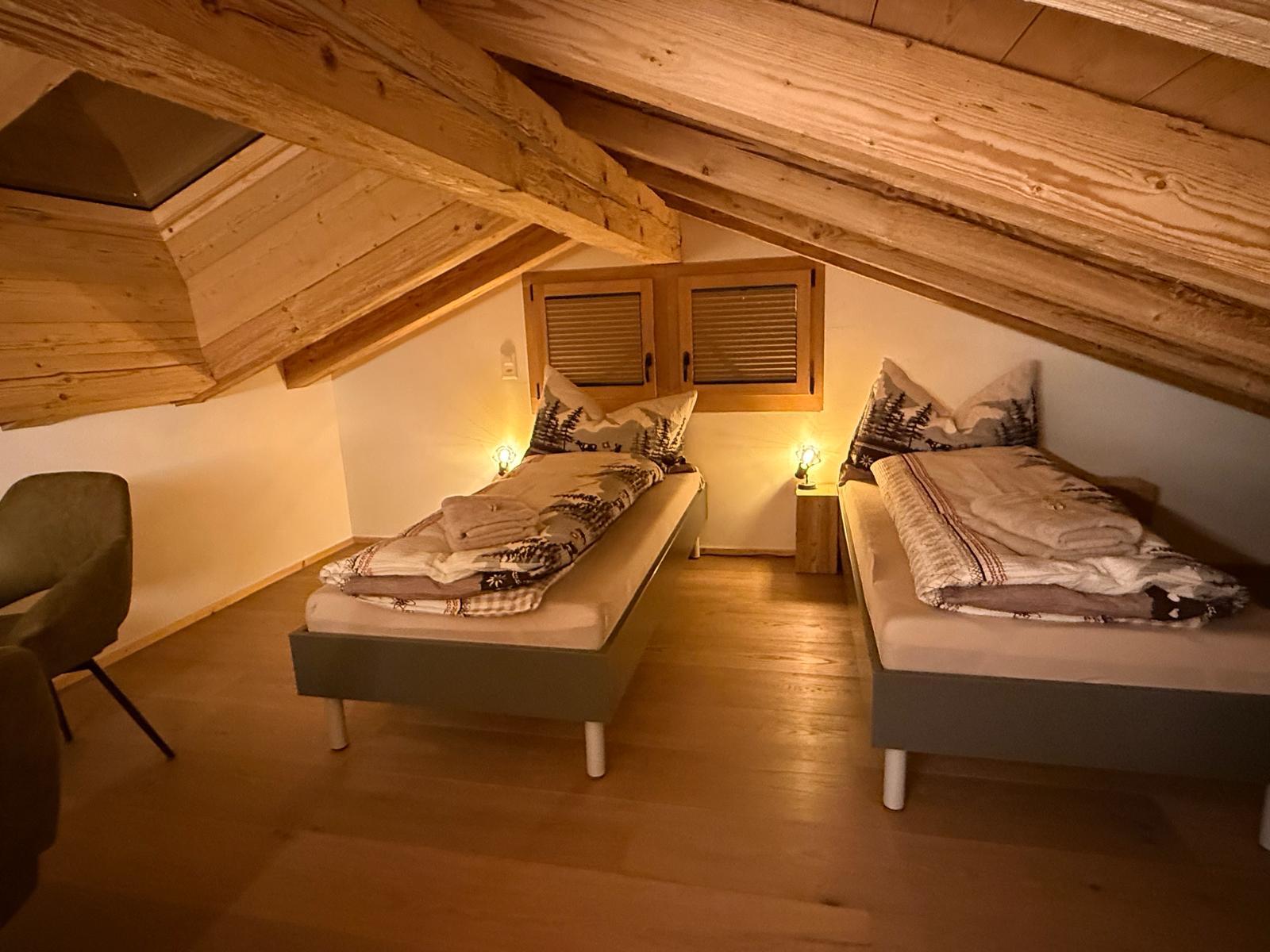 Auf die Galerie führt eine originelle Raumspar-Treppe mit Geländerlauf, wo sich zwei Einzelbetten, ein Tisch und zwei Sessel befinden. Sehr hell durch die zwei Dachfenster (können durch Rollstoren verdunkelt werden). Der Sichtschutz ist mit einer 90cm hohen Holzwand gewährleistet.