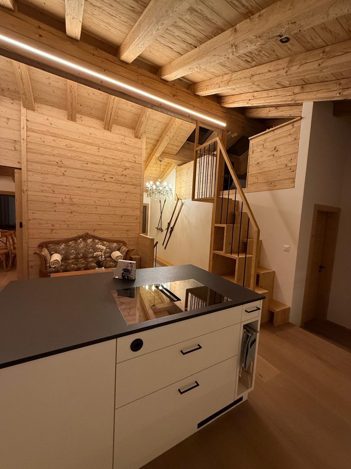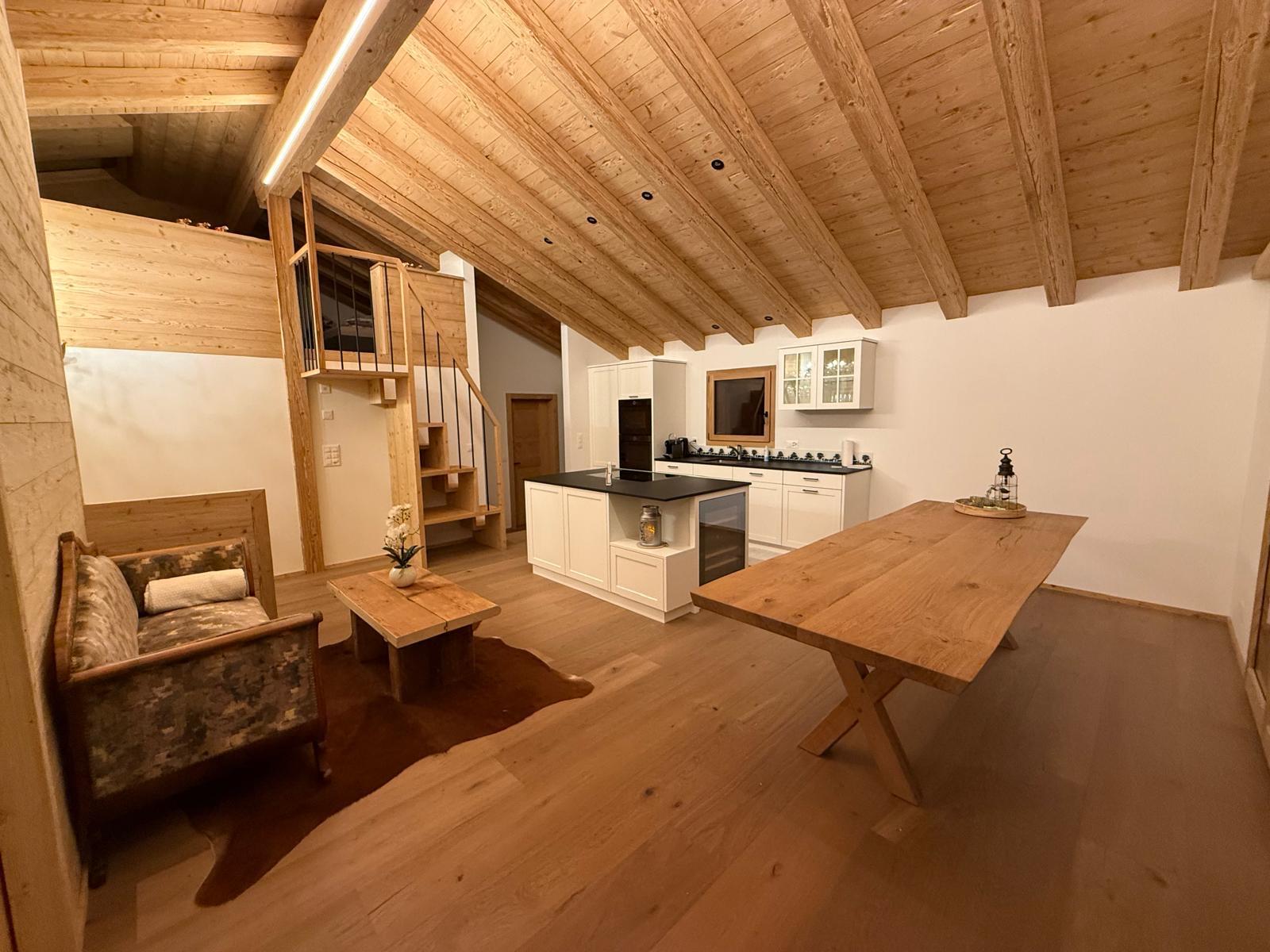 Über eine Holztreppe gelangen Sie ins Obergeschoss. Wunderschöne Landhausküche mit Kochinsel, integriertem Weinschrank, Kühl- und Gefrierschrank, Abwaschmaschine, Backofen und Steamer. Die Küche ist für 10 Personen voll ausgestattet inklusive zwei Fondue Caquelons und Racletteofen, Toaster, Nespresso Kaffeemaschine, diversen Gewürzen. Der Essbereich im selben Raum ist sehr hell, hat einen 2.80m langen Eichen-Massivholz-Tisch, direkter Ausgang auf den Balkon. Durch eine Trennwand-Türe wird der Wohnraum vergrössert oder Sie erhalten ein separates Schlafzimmer. Dieses kann durch umfunktionieren des Sofas in ein Schlafsofa 160x200 umgewandelt werden. Grosses Panoramafenster, Fernseher sowie Balkonzugang. Ein separates Zimmer befindet sich im hinteren Teil des Obergeschosses. Hochwertiges Boxspringbett 180x200, Fernseher, eigene Balkontüre und eigener Sitzplatz und via Aussentreppe links vom Haus erreichbar ist der Autounterstand. Ebenfalls im Obergeschoss ist eine grossräumige Nasszelle mit Dusche, Lavabo, Toilette.