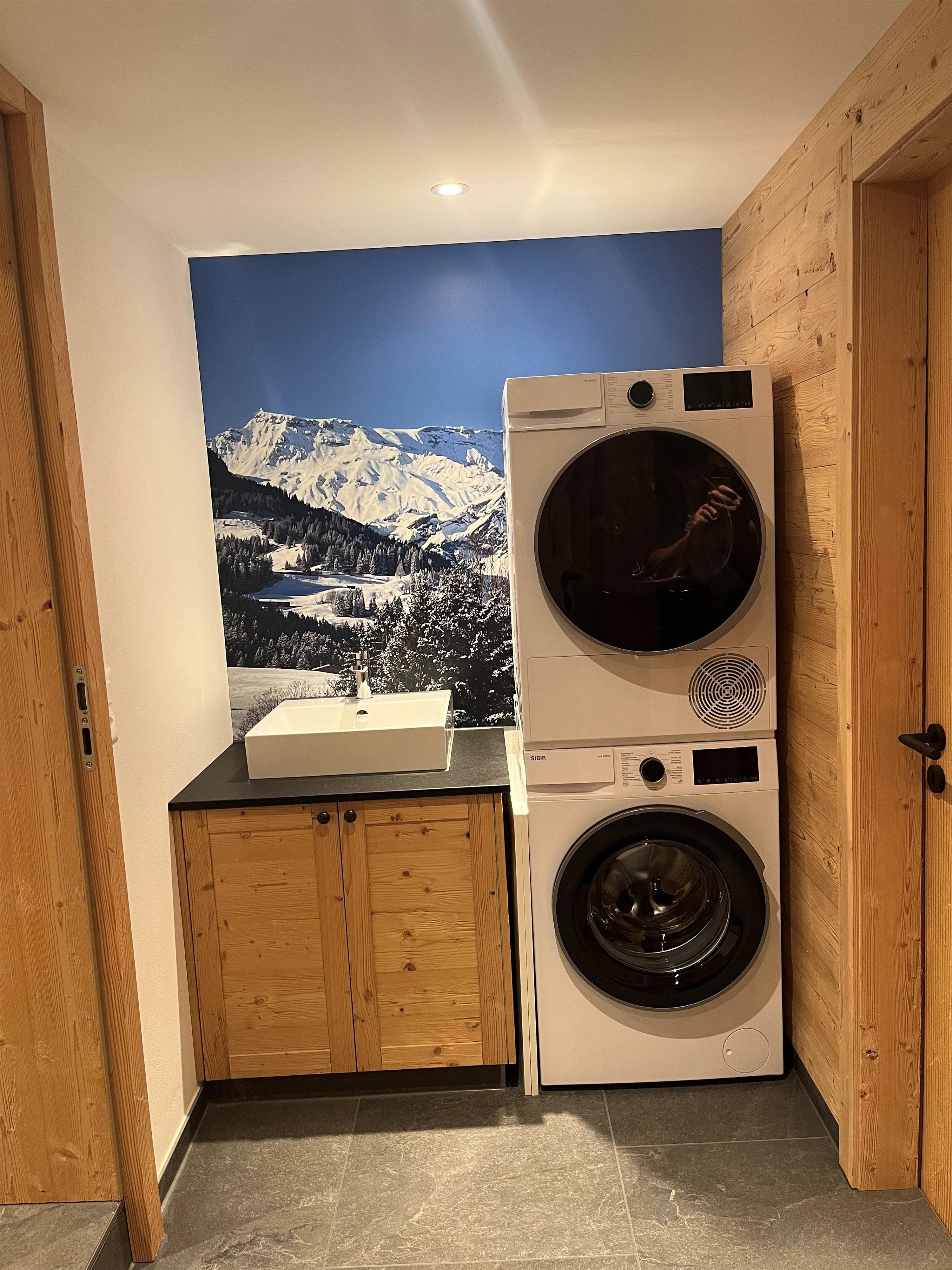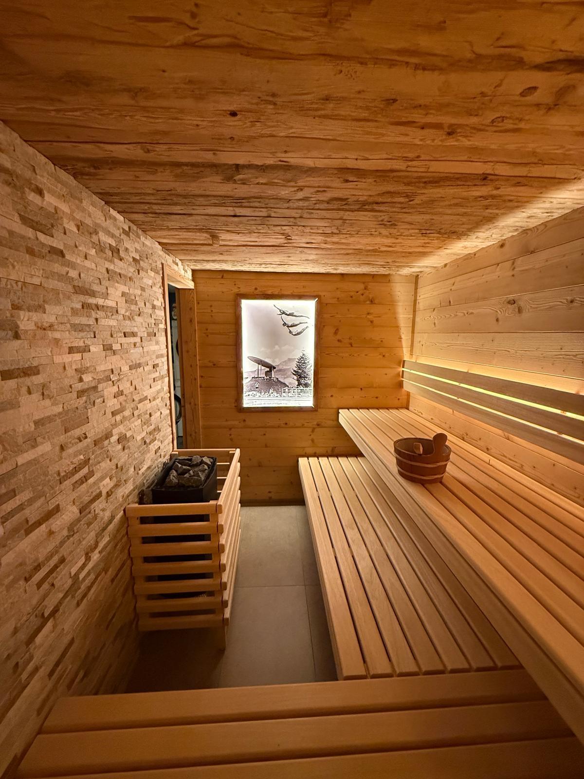 Im hinteren Teil befindet sich die Sauna, weiter ein Bad mit Dusche, Lavabo und Toilette. Ebenfalls gibt es einen separaten Skikeller mit Schuhheizung. Vor dem Keller gibt es einen Wäscheturm (Waschmaschine und Trockner) und ein Waschbecken.