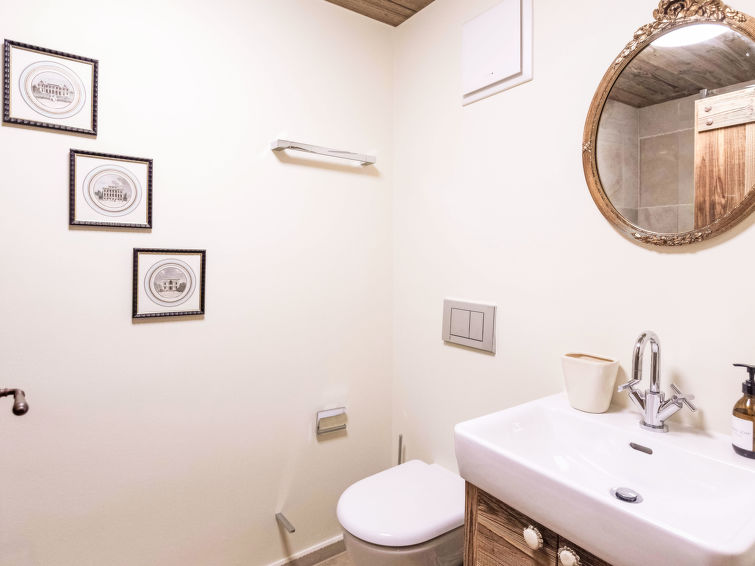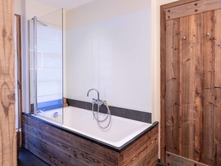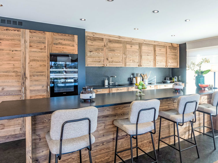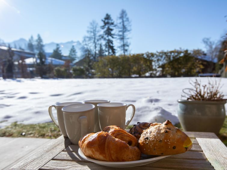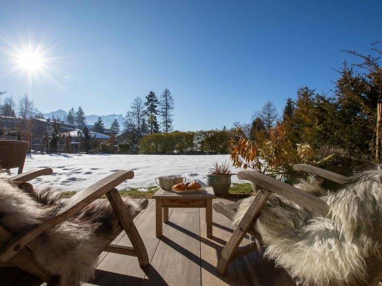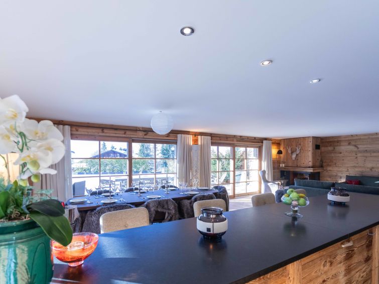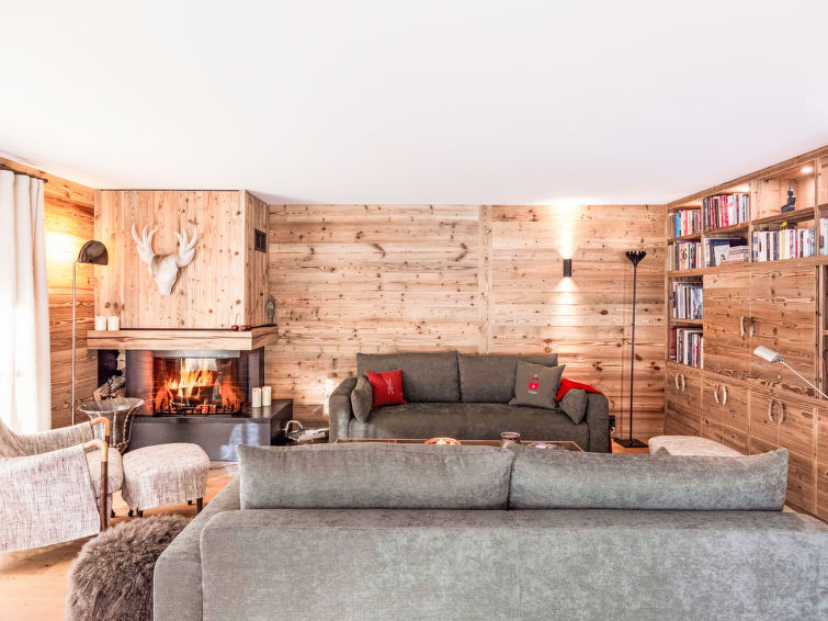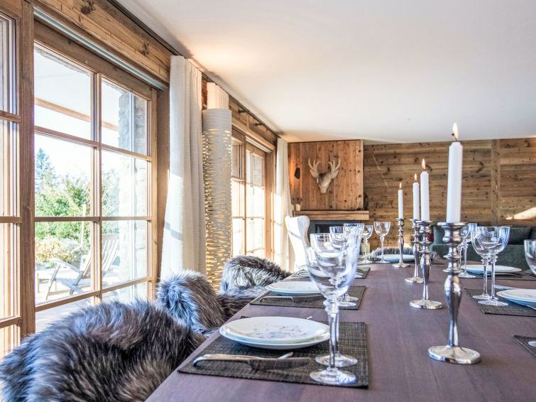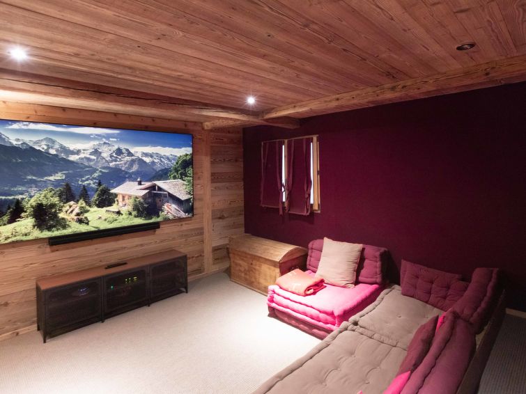 "Domaine du Roc 1 /2", 6-Zimmer-Wohnung 280 m2 auf 2 Stockwerken, im Erdgeschoss, Südlage. Objekt geeignet für 6 Erwachsene + 4 Kinder. Geräumig, luxuriös und geschmackvoll eingerichtet: grosses Wohn-/Esszimmer mit offenem Kamin, Esstisch, Sprudelbad und TV (Flachbildschirm). Ausgang zum Garten, Richtung Süden. 1 Zimmer mit 1 franz. Bett (1 x 180 cm, Länge 200 cm), Dusche/WC. Ausgang zum Garten, Richtung Osten. 1 Zimmer mit 1 franz. Bett (1 x 180 cm, Länge 200 cm), Bad/Dusche/WC. Ausgang zum Garten, Richtung Osten. 1 Zimmer mit 1 franz. Bett (1 x 180 cm, Länge 200 cm), Dusche/WC. Offene Küche (Geschirrspüler, 4 Induktionskochplatten, Toaster, Wasserkocher, Mikrowelle, Tiefkühler, elektrische Kaffeemaschine, Kapseln für die Kaffeemaschine (Nespresso) extra, Kochinsel). Sep. WC. Unteres Geschoss: 1 Zimmer mit 2 franz. Betten (2 x 180 cm, Länge 200 cm). Grosses Spielzimmer mit Heimkino. Dusche/WC. Grosser Garten, Südlage und Ostlage. Terrassenmöbel. Schöne Sicht auf die Berge. Zur Verfügung: Waschmaschine, Wäschetrockner, Sauna, Babybett. Internet (Wireless LAN, gratis). Parkplatz Nr. 4 (1 Auto). Bitte beachten: Nichtraucher-Unterkunft.