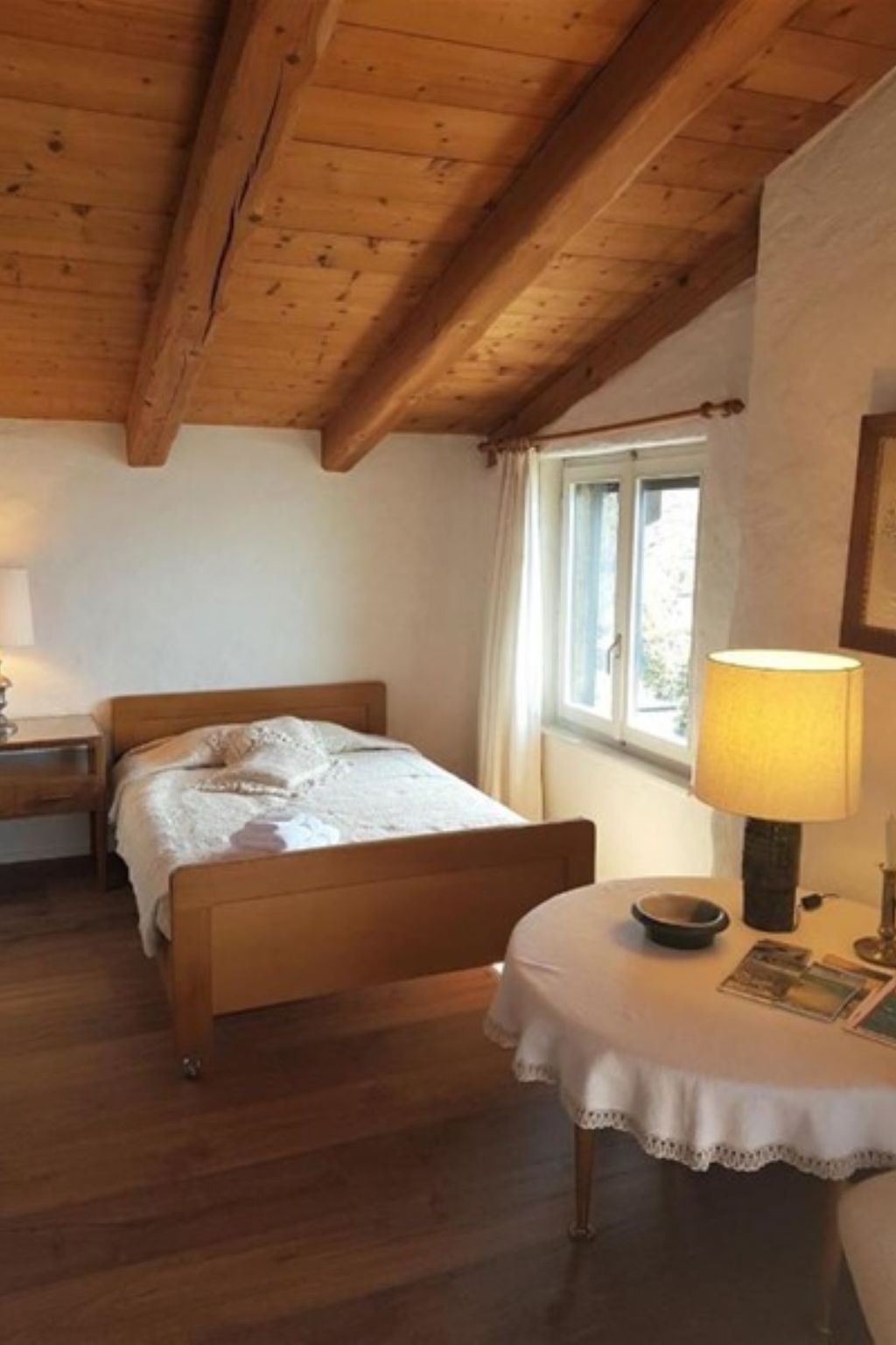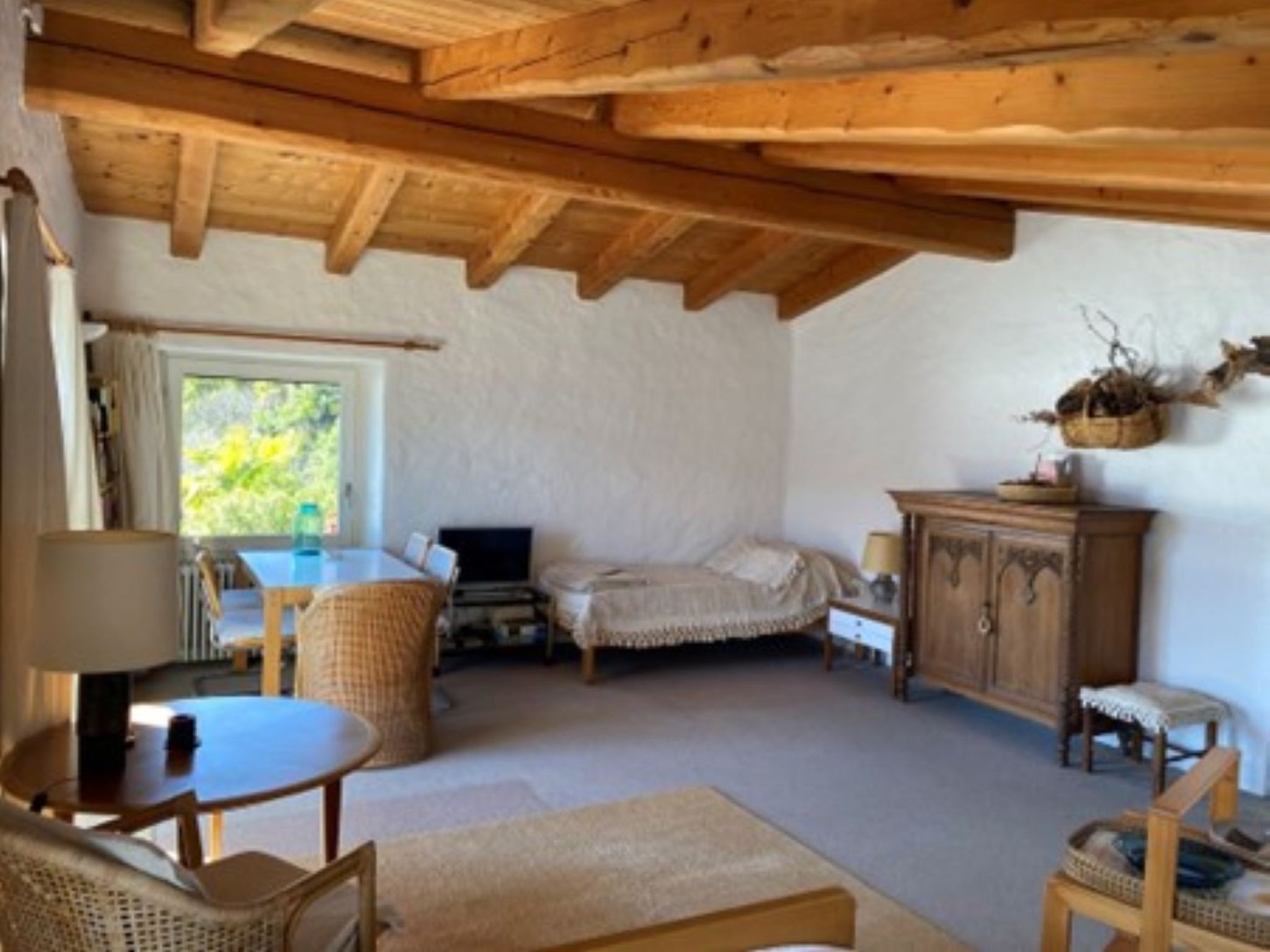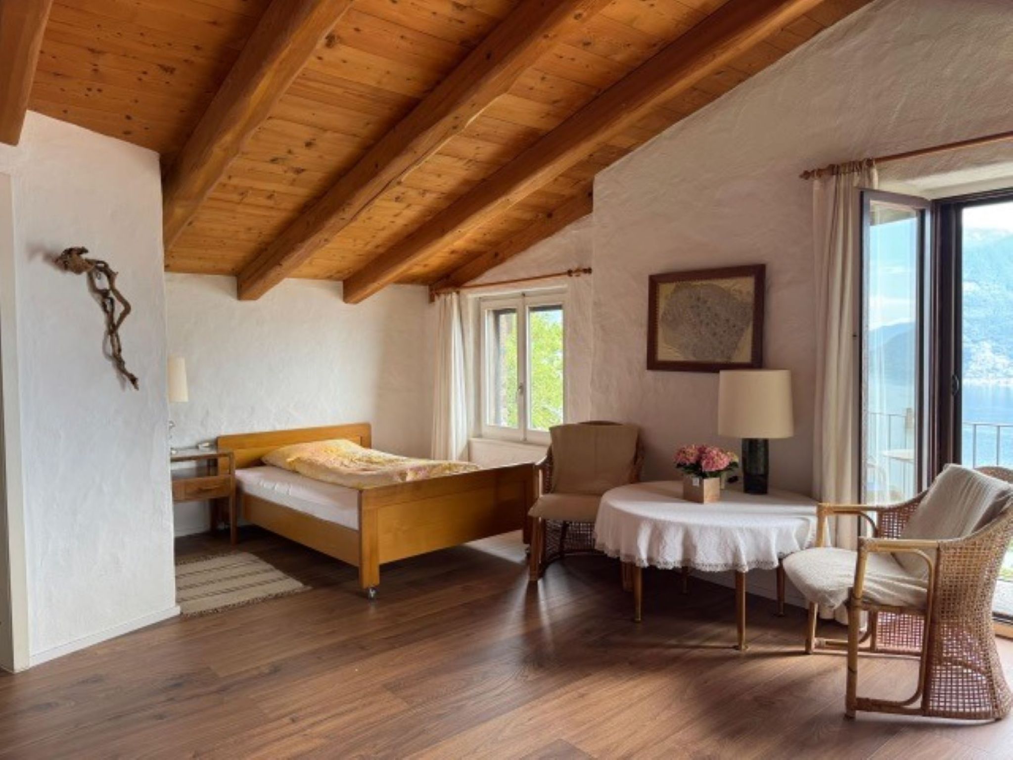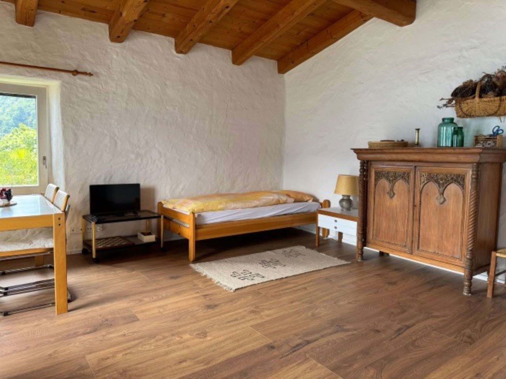 Willkommen in dieser bezaubernden 1,5-Zimmer-Ferienwohnung für zwei Personen in einem typischen Tessiner Haus in Ronco sopra Ascona. Der helle, großzügige Wohn-Schlafraum ist das Herzstück des Appartements und lädt zum Entspannen ein. Hier finden Sie zwei getrennte Betten (90 cm und 120 cm), einen gemütlichen Essbereich für vier Personen, ein gut sortiertes Bücherregal sowie Fernseher und WLAN – ideale Voraussetzungen für entspannte Stunden.