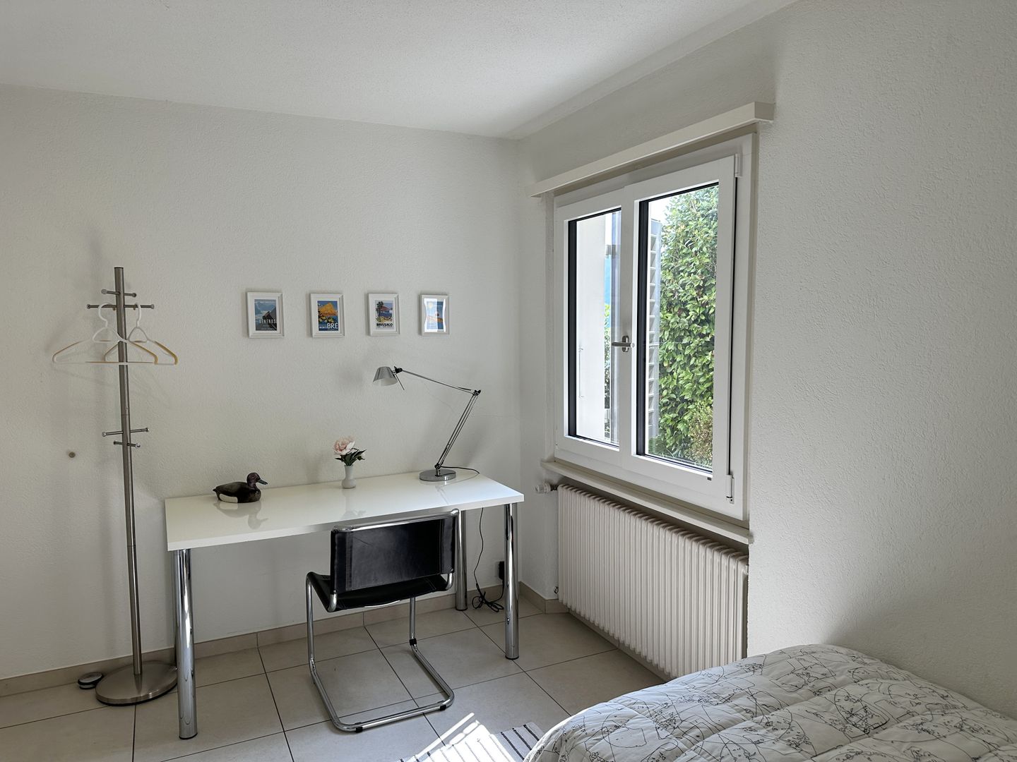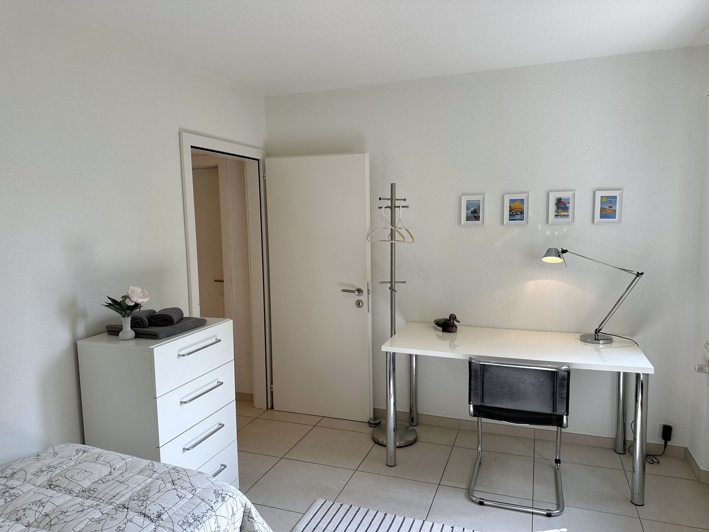 Diese geschmackvoll eingerichtete 3.5-Zimmer-Wohnung für bis zu 4 Personen befindet sich im ersten Stock eines freistehenden Dreifamilienhauses in ruhiger, sonniger Lage. Der Zugang zur Wohnung erfolgt über eine charmante Treppe, die durch einen liebevoll gepflegten, mediterranen Garten zum Hauseingang führt. Im Eingangsbereich empfängt Sie ein praktischer Garderobenschrank.