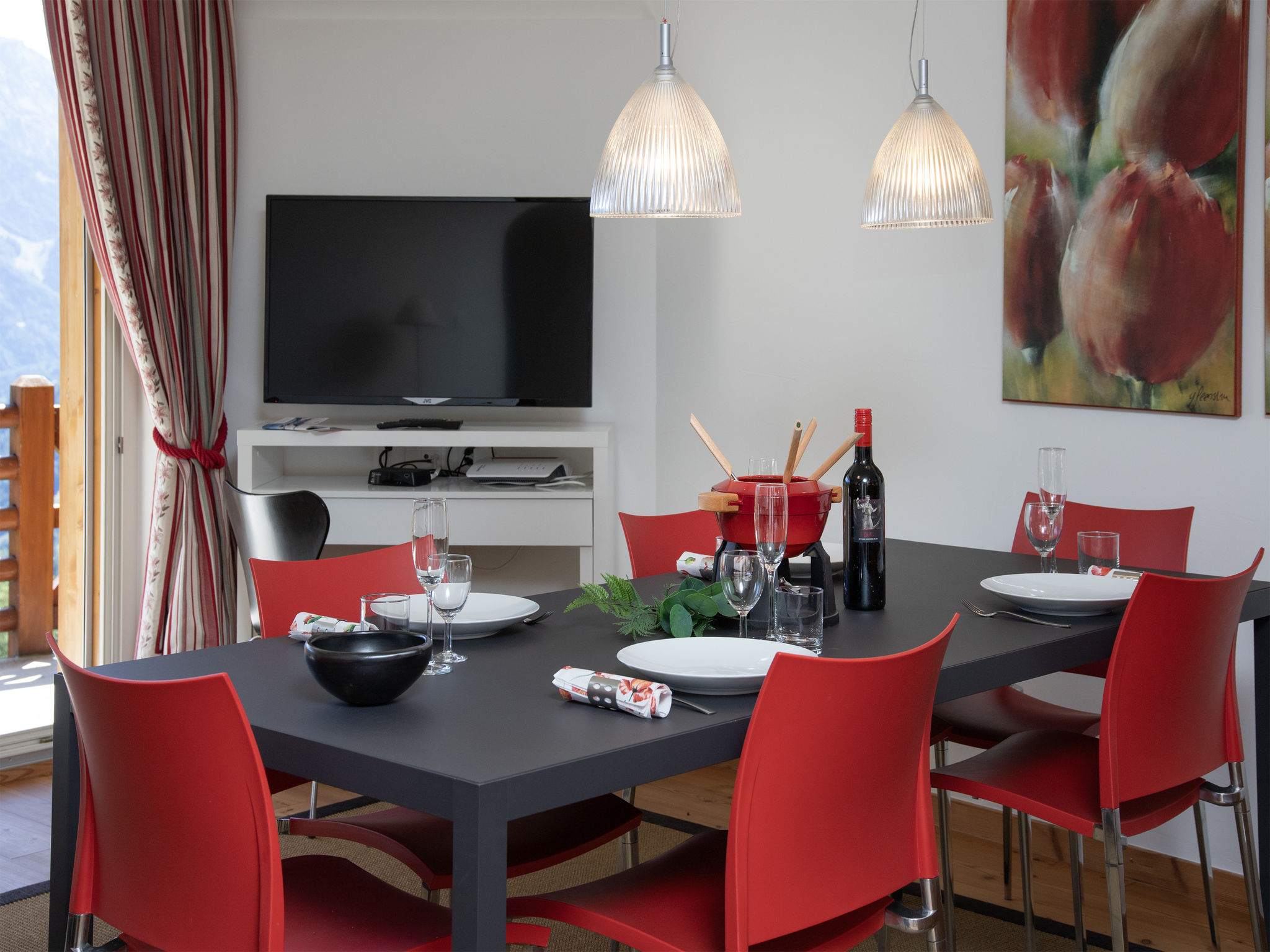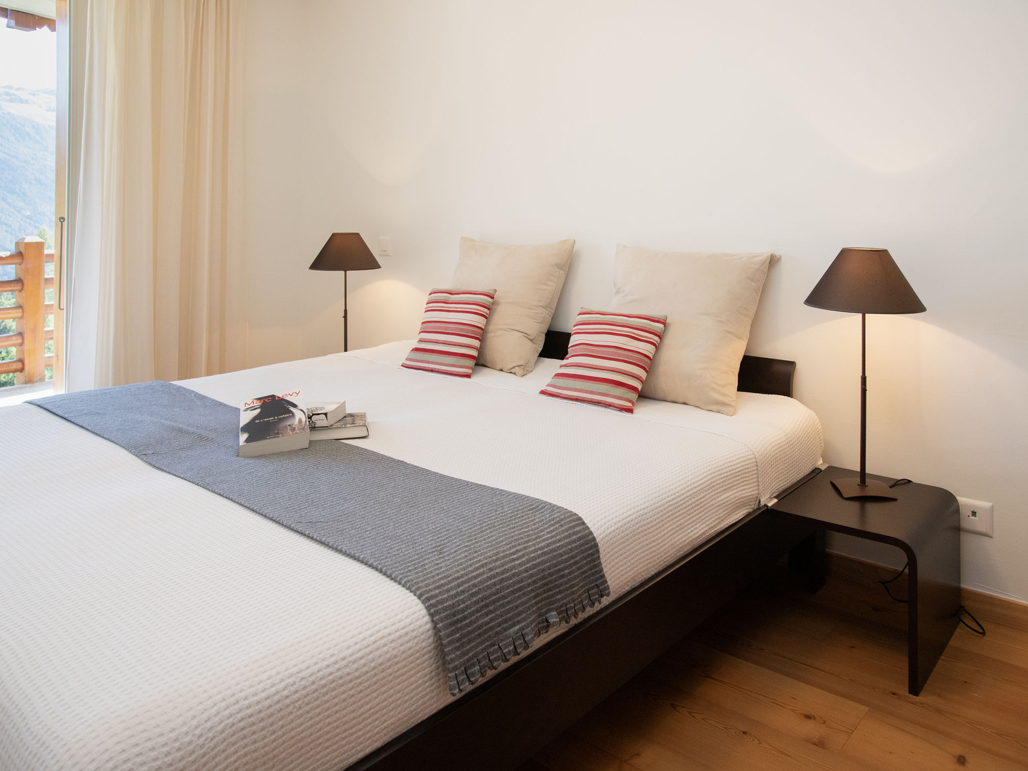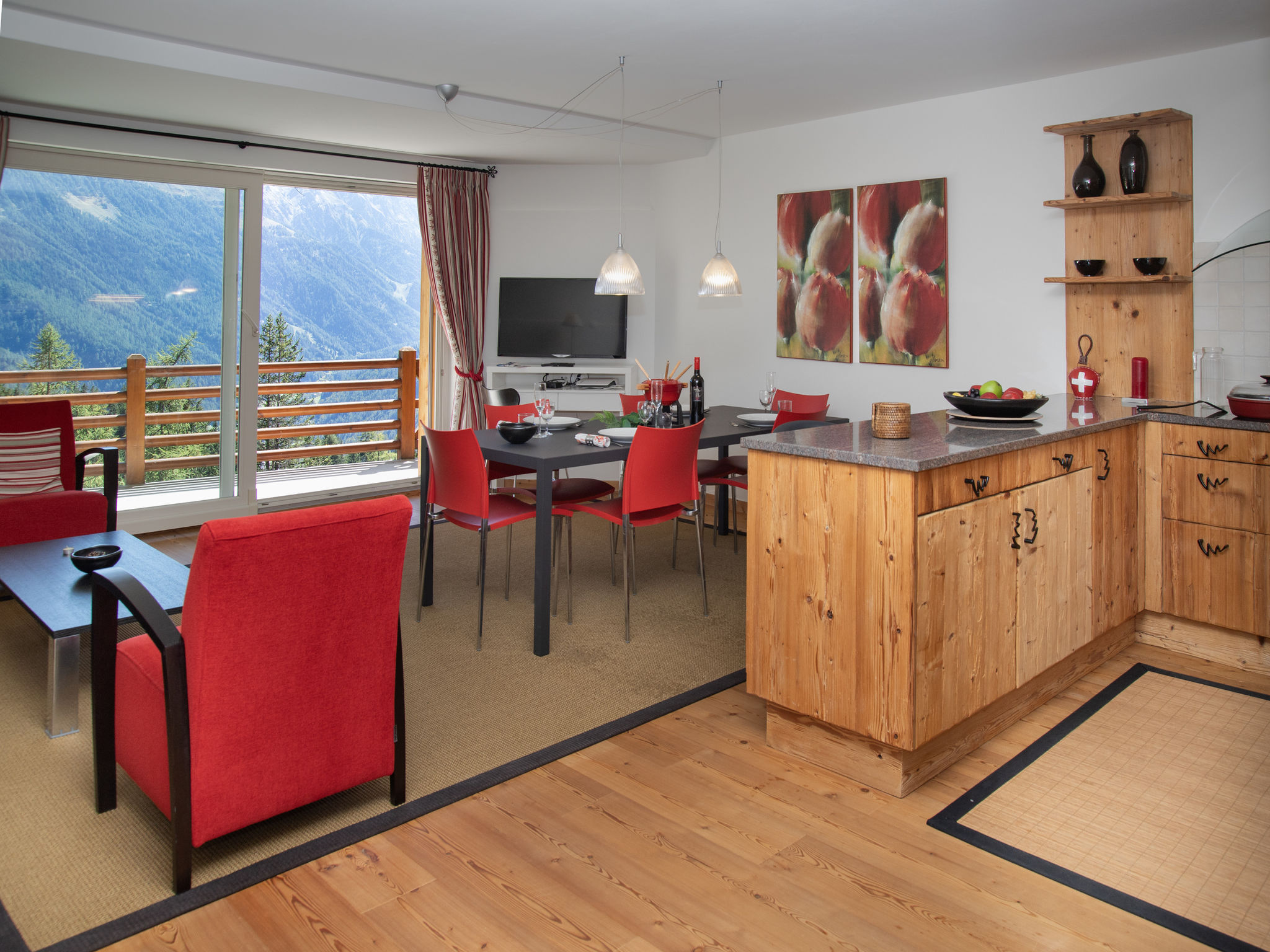 "Les Combins 30", 3-Zimmer-Wohnung 95 m2 im 3. Stock, Südlage. Geräumig und hell, schön und geschmackvoll eingerichtet: grosses Wohn-/Esszimmer mit TV und E-Heizung. 1 grosses Zimmer mit 1 Doppelbett (1 x 180 cm, Länge 200 cm). Ausgang zur Terrasse. 1 Zimmer mit 1 x 2 Etagenbetten (90 cm, Länge 200 cm). Ausgang zur Terrasse. Offene Küche (4 Glaskeramikplatten, Toaster, Wasserkocher, Mikrowelle, Tiefkühler, elektrische Kaffeemaschine). Bad/WC, Dusche/WC. Parkettboden. Grosse Terrasse, Südlage. Terrassenmöbel, Liegestühle (1). Sehr schöne Panoramasicht auf die Berge. Zur Verfügung: Haartrockner. Internet (Wireless LAN, gratis). Parkplatz (überdacht). Bitte beachten: Nichtraucher-Unterkunft.
