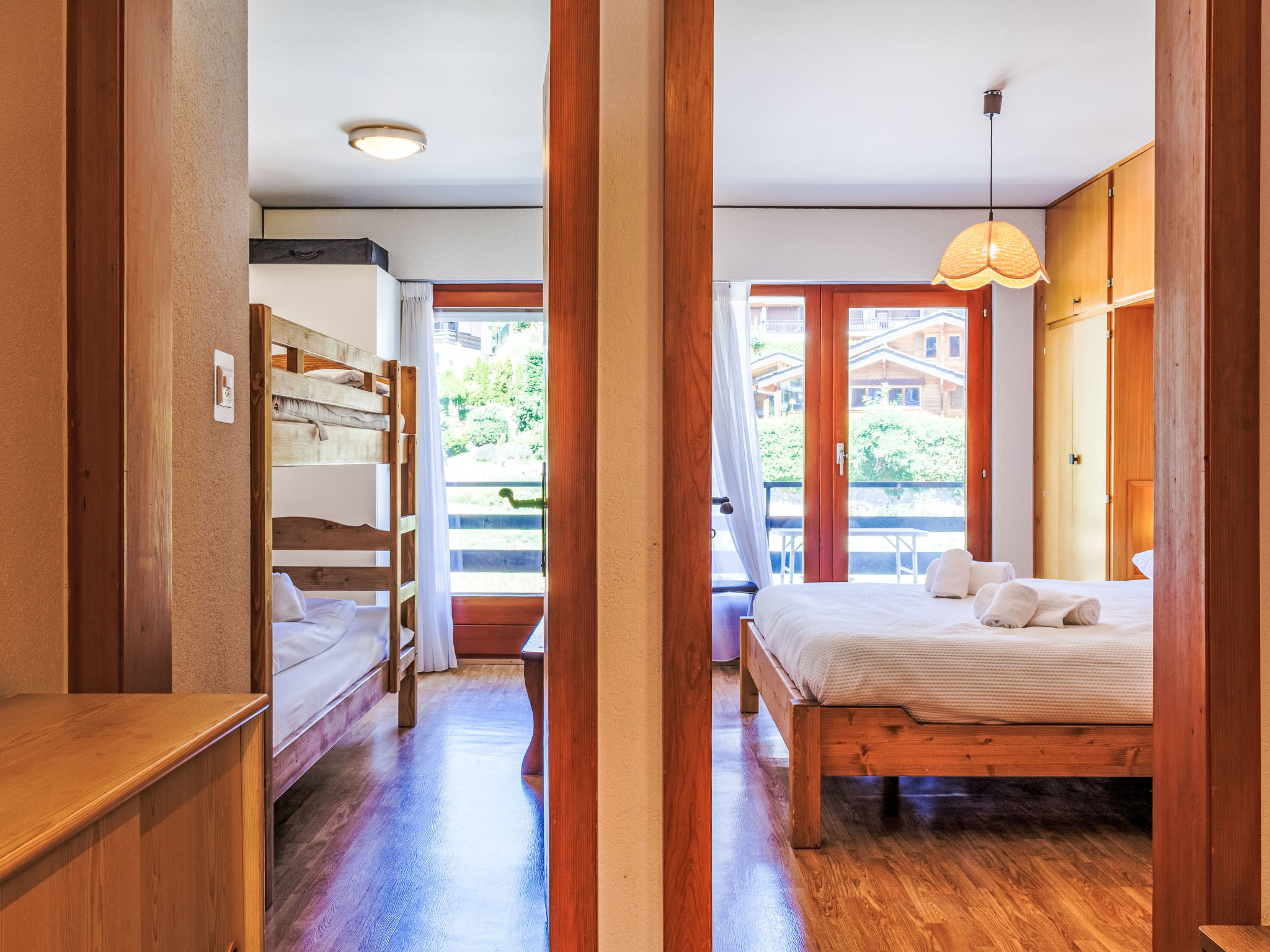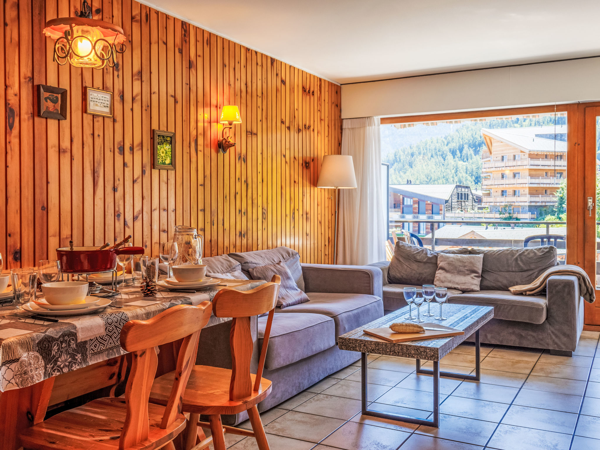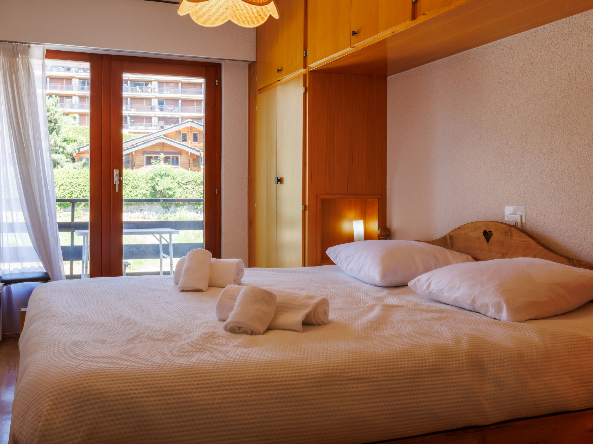 "Les Platanes E3", 3-Zimmer-Wohnung 64 m2 im 3. Stock. Zweckmässig eingerichtet: Wohn-/Schlafzimmer mit 1 Doppeldiwanbett (1 x 140 cm, Länge 180 cm), offenem Kamin (nur Deko), Kabel-TV und DVD. Ausgang zum Balkon, Richtung Süden. 1 Zimmer mit 1 franz. Bett (180 cm, Länge 200 cm). Ausgang zum Balkon, Richtung Norden. 1 Zimmer mit 1 x 2 Etagenbetten (90 cm, Länge 190 cm). Ausgang zum Balkon, Richtung Norden. Küche (Backofen, Geschirrspüler, 4 Glaskeramikplatten, Toaster, Wasserkocher, Mikrowelle, elektrische Kaffeemaschine, Kapseln für die Kaffeemaschine (nespresso) extra, Racletteofen, Fondue Set (Käse)). Bad/WC, sep. WC. 2 Balkone. Balkonmöbel. Schöne Sicht auf die Ortschaft. Zur Verfügung: Internet (WLAN, gratis). Parkplatz Nr. 29 Les Sorbiers. Bitte beachten: Nichtraucher-Unterkunft. Maximal 1 Haustier/Hund erlaubt.