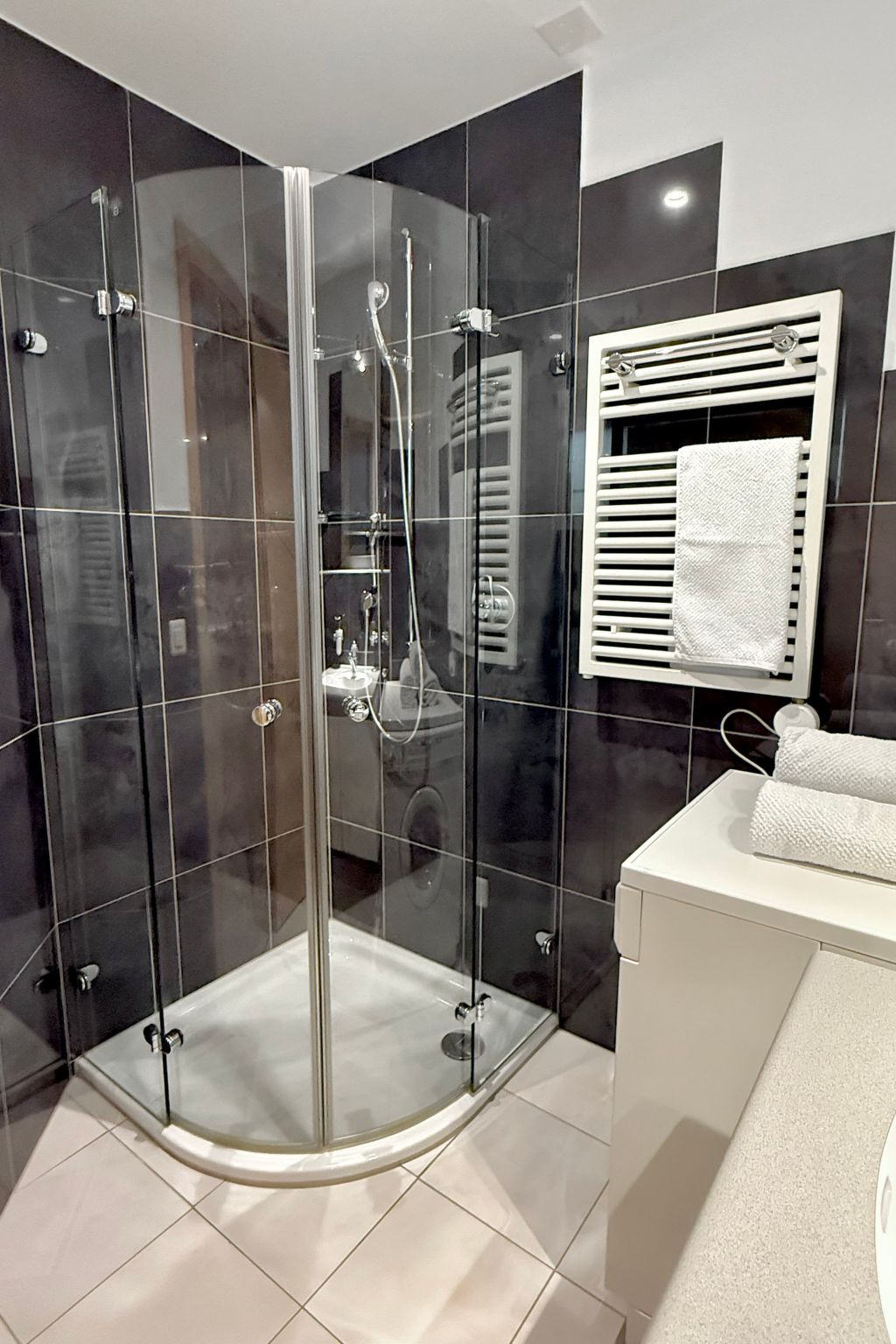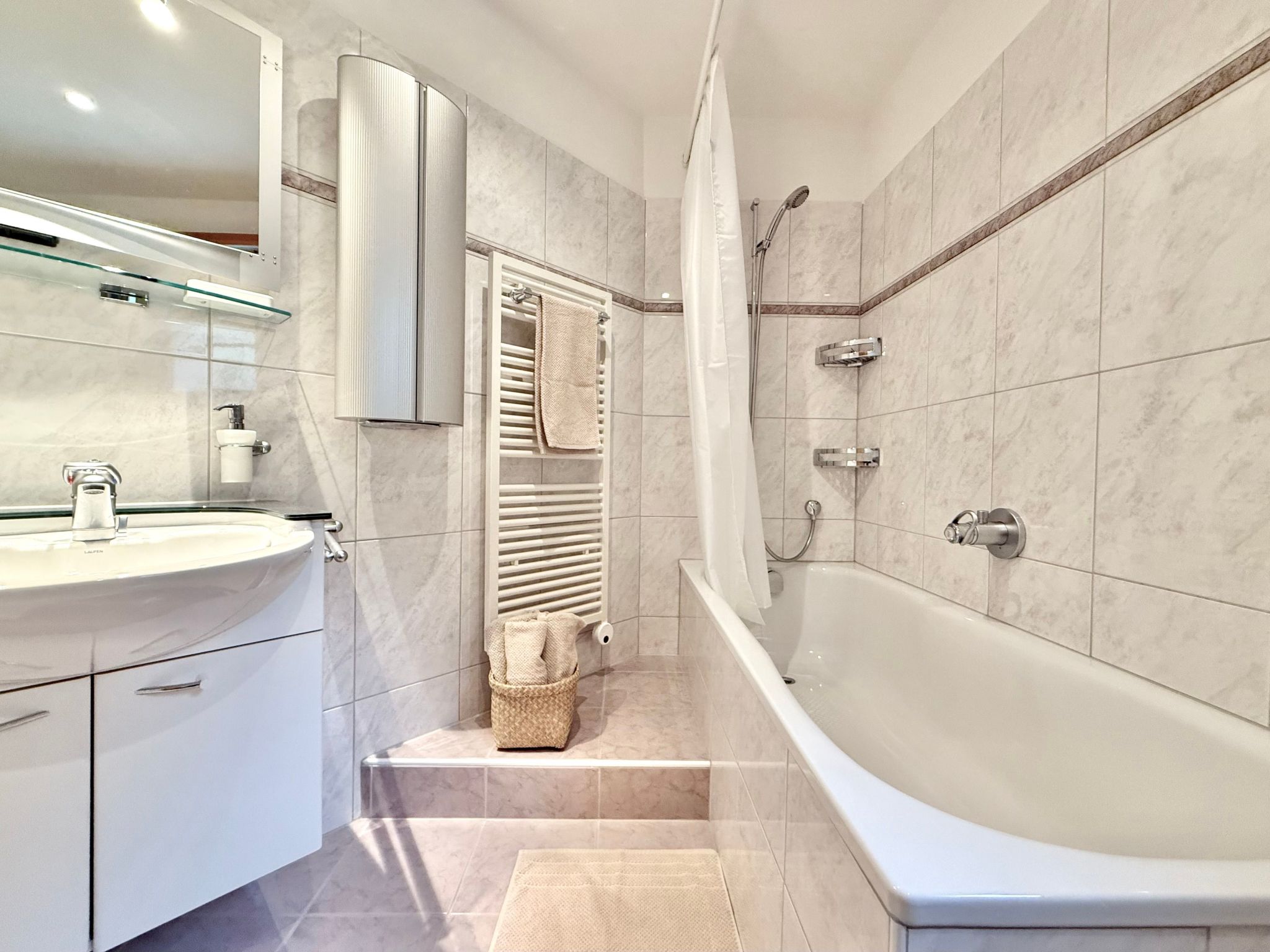 Im Inneren bietet die Wohnung eine praktische und dennoch ästhetisch ansprechende Einrichtung mit zwei gemütlichen Schlafzimmern und zwei Badezimmern, die Privatsphäre und Komfort für alle Gäste gewährleisten. Die Fußbodenheizung sorgt für eine warme und einladende Umgebung, unabhängig vom Wetter draußen. Die voll ausgestattete und geräumige Küche bietet alles, was Sie brauchen, um nach einem Tag voller Aktivitäten in den Bergen eine gute Mahlzeit zuzubereiten.