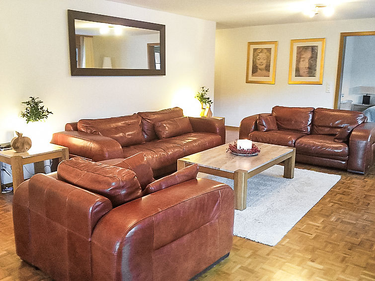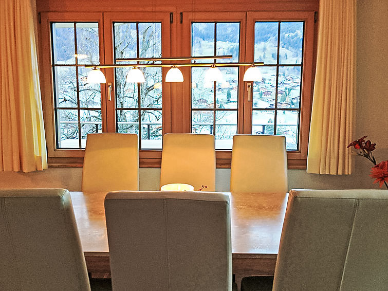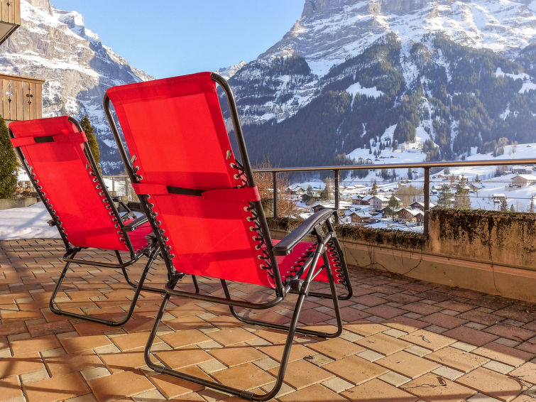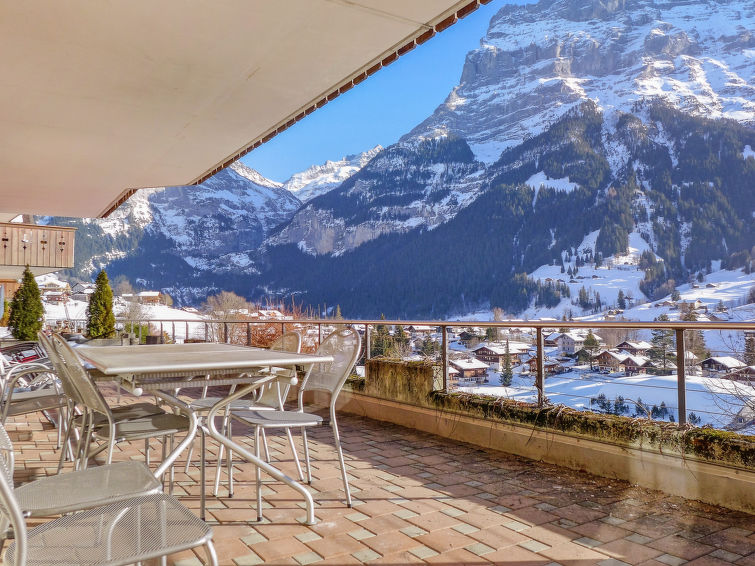 5-Zimmer-Wohnung 140 m2, im erhöhten Erdgeschoss, Südlage. Geschmackvoll und gemütlich eingerichtet: Wohn-/Esszimmer mit Digital-TV und Flachbildschirm. Ausgang zur Terrasse, Richtung Süden und Richtung Westen. 2 Zimmer, jedes Zimmer mit 2 Betten (90 cm, Länge 200 cm). 1 Zimmer mit 1 Doppelbett (180 cm, Länge 200 cm). 1 Zimmer mit 1 franz. Bett (150 cm, Länge 200 cm). Offene Küche (Backofen, Geschirrspüler, 4 Glaskeramikplatten, Toaster, Wasserkocher, Mikrowelle, elektrische Kaffeemaschine, Racletteofen, Fondue Set (Käse)). Bad/WC, Dusche/WC, sep. WC. Bodenheizung. Holzdielenboden. Grosse Terrasse, Südlage und Westlage. Terrassenmöbel, Liegestühle (2), Abstellkammer. Herrliche Sicht auf die Berge und Eigernordwand. Zur Verfügung: Waschmaschine, Wäschetrockner, Haartrockner. Internet (Wireless LAN, gratis). Parkplatz Nr. EG 5 (1 Auto). Bitte beachten: Nichtraucher-Unterkunft. Feuerlöscher.