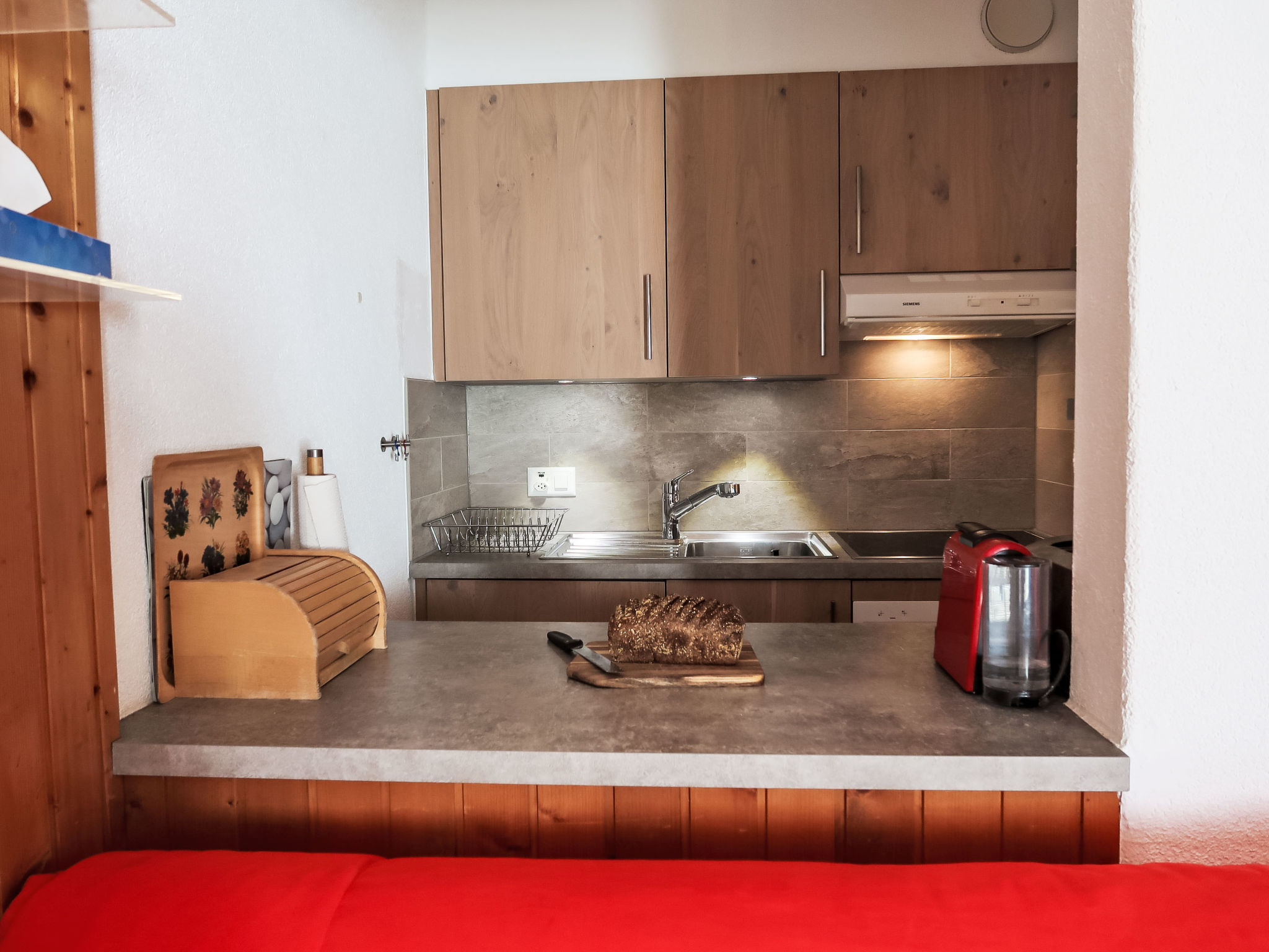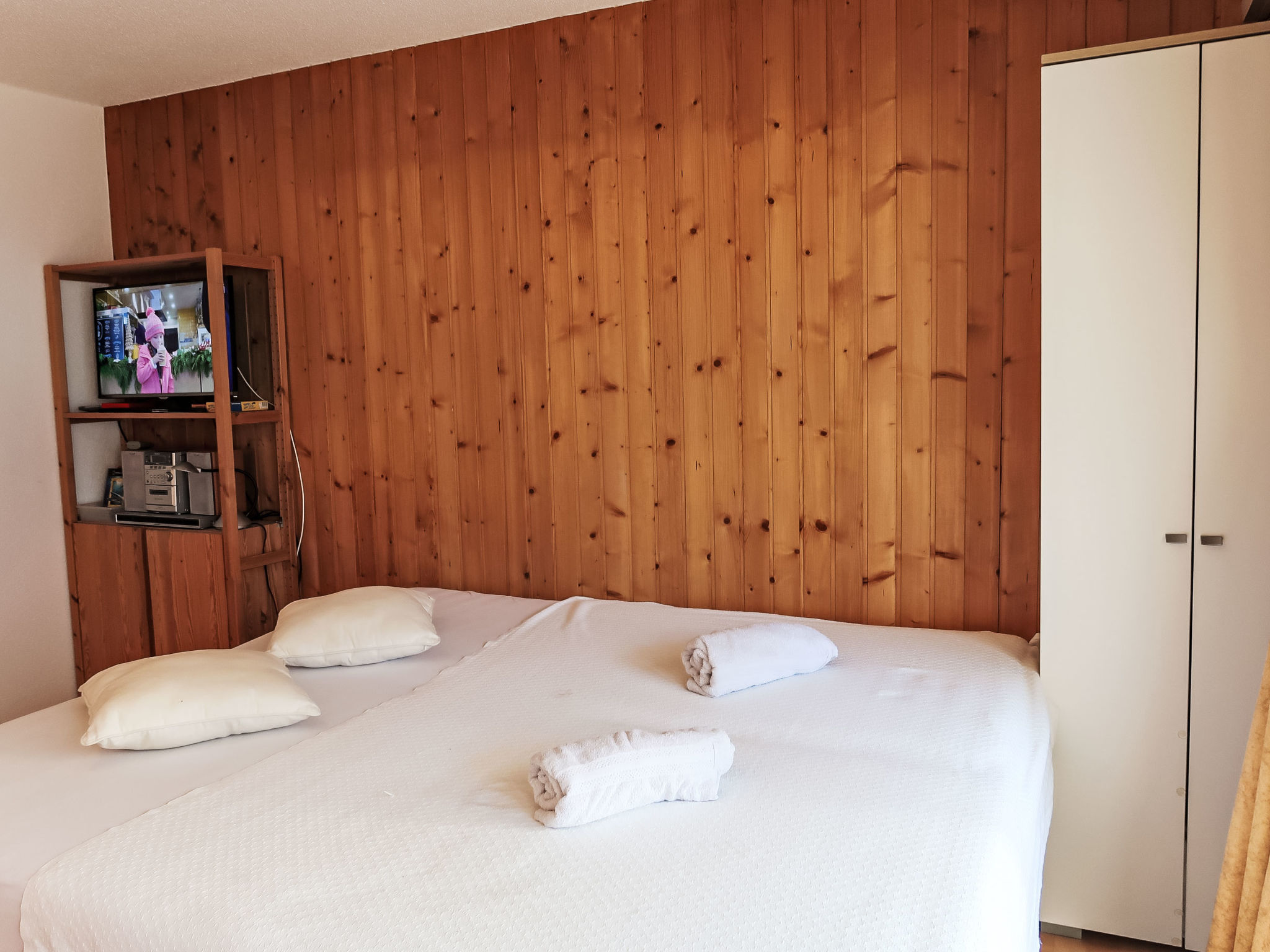 "Neige et Soleil Nr 13", 1-Zimmer-Studio 40 m2 im 3. Stock, Südostlage. Zweckmässig und gemütlich eingerichtet: Wohn-/Schlafzimmer mit 1 Ausziehbett (2 Pers. 2 x 90 cm, Länge 200 cm), Kabel-TV. Ausgang zum Balkon. Offene Küche (4 Kochplatten, Backofen, Toaster, Wasserkocher, elektrische Kaffeemaschine, Kapseln für die Kaffeemaschine (Nespresso), Fondue Set (Käse)). Dusche/WC. Balkon, Südostlage. Balkonmöbel, Liegestühle (2). Schöne, auf die Berge, die Landschaft und die Ortschaft. Zur Verfügung: Internet (WLAN). Garage Nr. 24 auf dem Grundstück (1 Auto), Höhe 195 cm. Bitte beachten: Nichtraucher-Unterkunft.