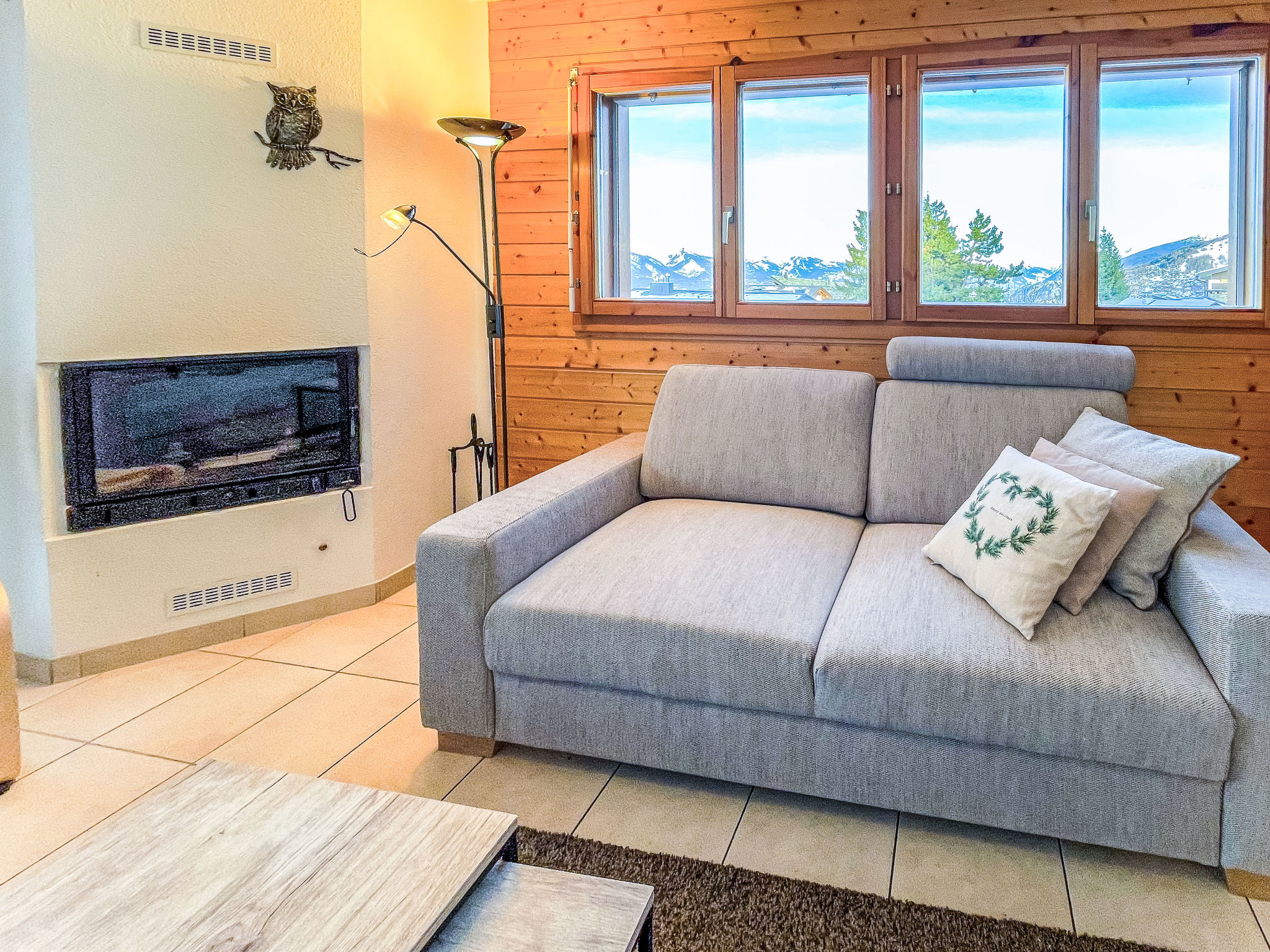 "Les Chouettes 11", 3-Zimmer-Wohnung 80 m2 im 1. Stock. Komfortabel eingerichtet: Wohn-/Esszimmer mit offenem Kamin und Kabel-TV. Ausgang zur Terrasse, Richtung Norden. Esszimmer. Ausgang zur Terrasse, Richtung Süden. 1 Zimmer mit 1 Doppelbett (2 x 80 cm, Länge 200 cm). 1 Zimmer mit 1 Doppelbett (2 x 80 cm, Länge 200 cm). Kochnische (Backofen, Geschirrspüler, 4 Glaskeramikplatten, Toaster, Wasserkocher, Mikrowelle, elektrische Kaffeemaschine, Kapseln für die Kaffeemaschine (Nespresso) extra, Racletteofen, Fondue Set (Käse)). Bad/WC, Dusche/WC. Schöne Sicht auf die Berge und das Tal. Zur Verfügung: Internet (Wireless LAN, gratis). Parkplatz, Garage Nr. 1, Höhe 210 cm, Breite 230 cm. Bitte beachten: Nichtraucher-Unterkunft.