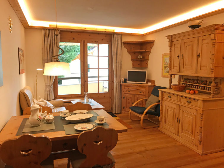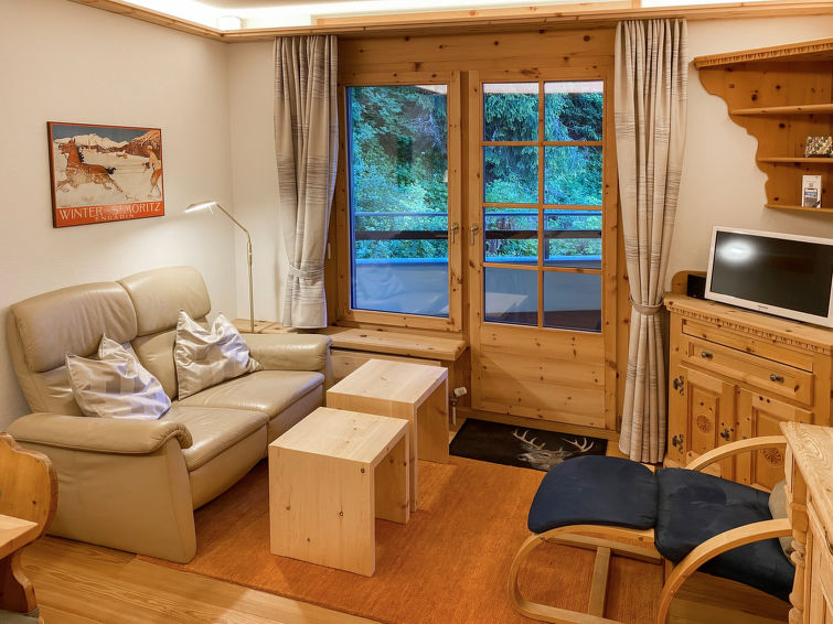 "Chesa Alvetern 5", 1-Zimmer-Wohnung 35 m2 im 1. Stock. Teilweise renoviert im Jahre 2016, komfortabel und mit viel Holz eingerichtet: Wohn-/Schlafzimmer mit 1 Doppelbett (2 x 80 cm, Länge 200 cm), Essecke und TV (Flachbildschirm). Ausgang zum Balkon, Richtung Süden. Offene Küche im Eingang (4 Kochplatten, Backofen, Geschirrspüler, Toaster, Wasserkocher, Mikrowelle, elektrische Kaffeemaschine, Kapseln für die Kaffeemaschine (Nespresso) extra, Fondue Set (Käse)). Bad/WC. Heizung. Balkon. Balkonmöbel. Eingeschränkte Sicht auf die Ortschaft. Zur Verfügung: Haartrockner. Internet (Wireless LAN, gratis). Garage Nr. 5, Höhe 200 cm, Breite 250 cm. Bitte beachten: Nichtraucher-Unterkunft. Maximal 1 Haustier/Hund erlaubt.