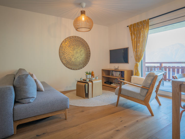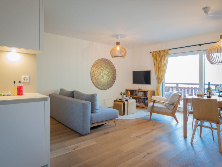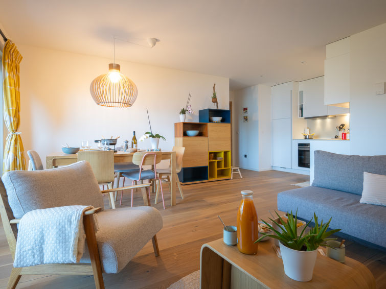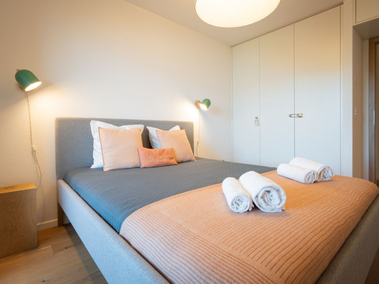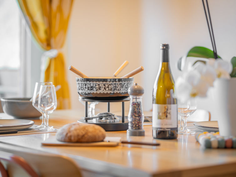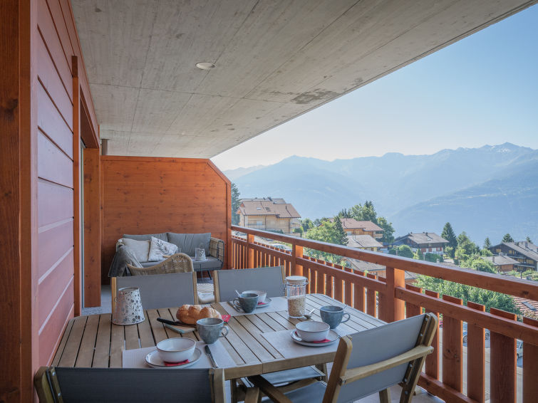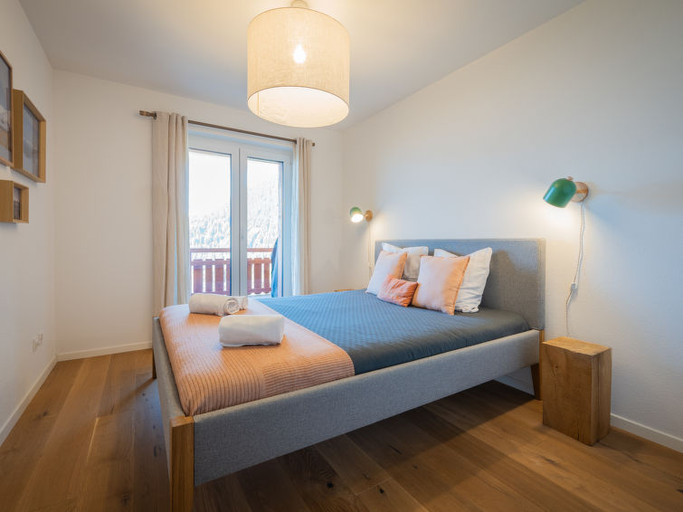 "Diolinoir 34", 2-Zimmer-Wohnung 50 m2 im 3. Stock, Südlage. Modern und geschmackvoll eingerichtet: Eingang. Wohn-/Esszimmer 30 m2 mit Kabel-TV. Ausgang zum Balkon, Richtung Süden. 1 grosses Zimmer 11 m2 mit 1 franz. Bett (1 x 160 cm, Länge 200 cm). Ausgang zum Balkon, Richtung Süden. Grosse, offene Küche (Backofen, Geschirrspüler, 4 Induktionskochplatten, Toaster, Wasserkocher, elektrische Kaffeemaschine, Kapseln für die Kaffeemaschine (Nespresso) extra, Racletteofen, Fondue Set (Chinoise, Käse)) mit Esstisch. Dusche/WC. Bodenheizung. Grosser Balkon 18 m2, Südlage. Balkonmöbel, Gartengrill. Sehr schöne Panoramasicht auf die Berge und das Tal. Zur Verfügung: Waschmaschine, Wäschetrockner, Haartrockner. Internet (WLAN, gratis). Garage Nr. 27 (1 Auto), Höhe 220 cm, Breite 240 cm. E-Ladestation. Bitte beachten: Nichtraucher-Unterkunft.
