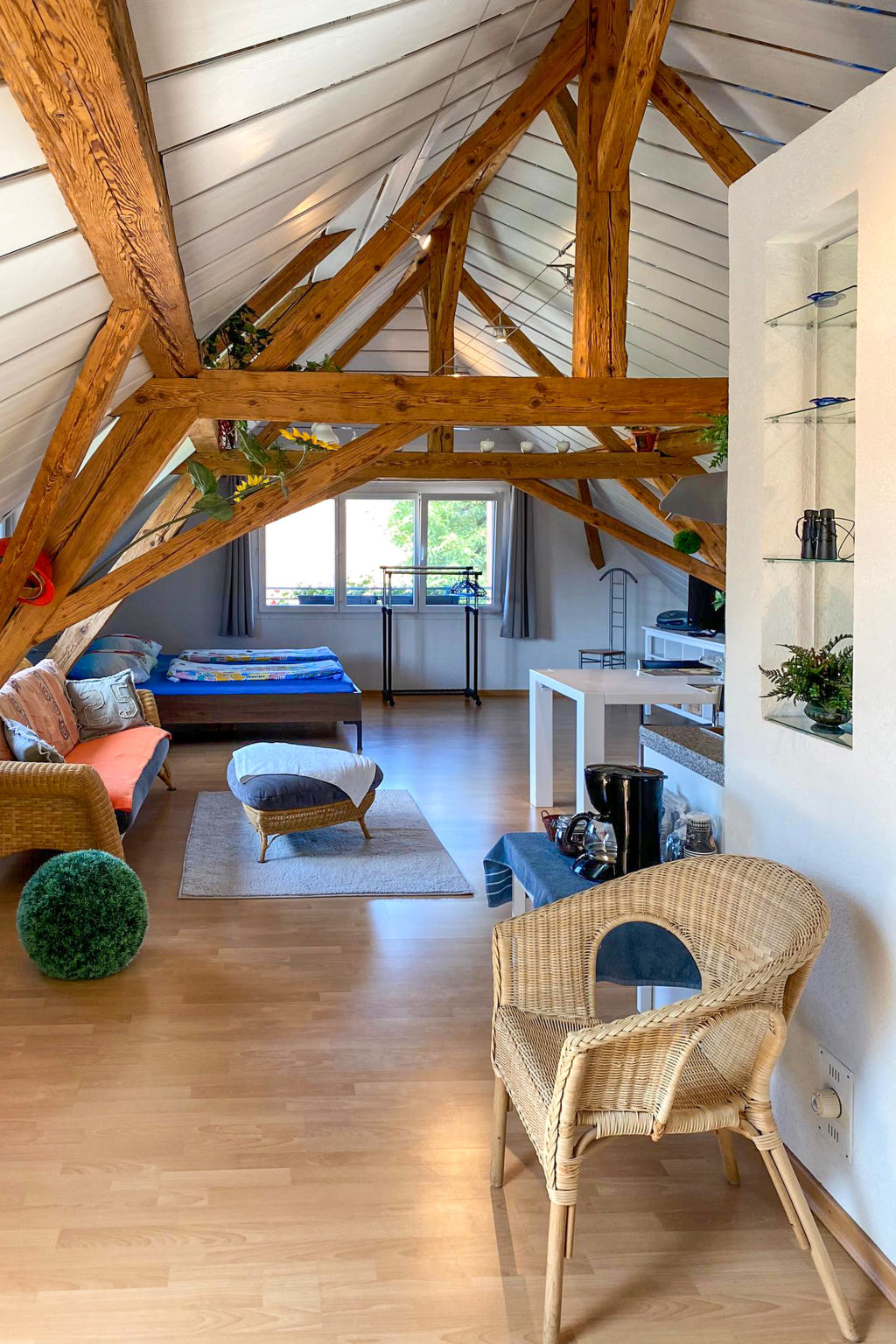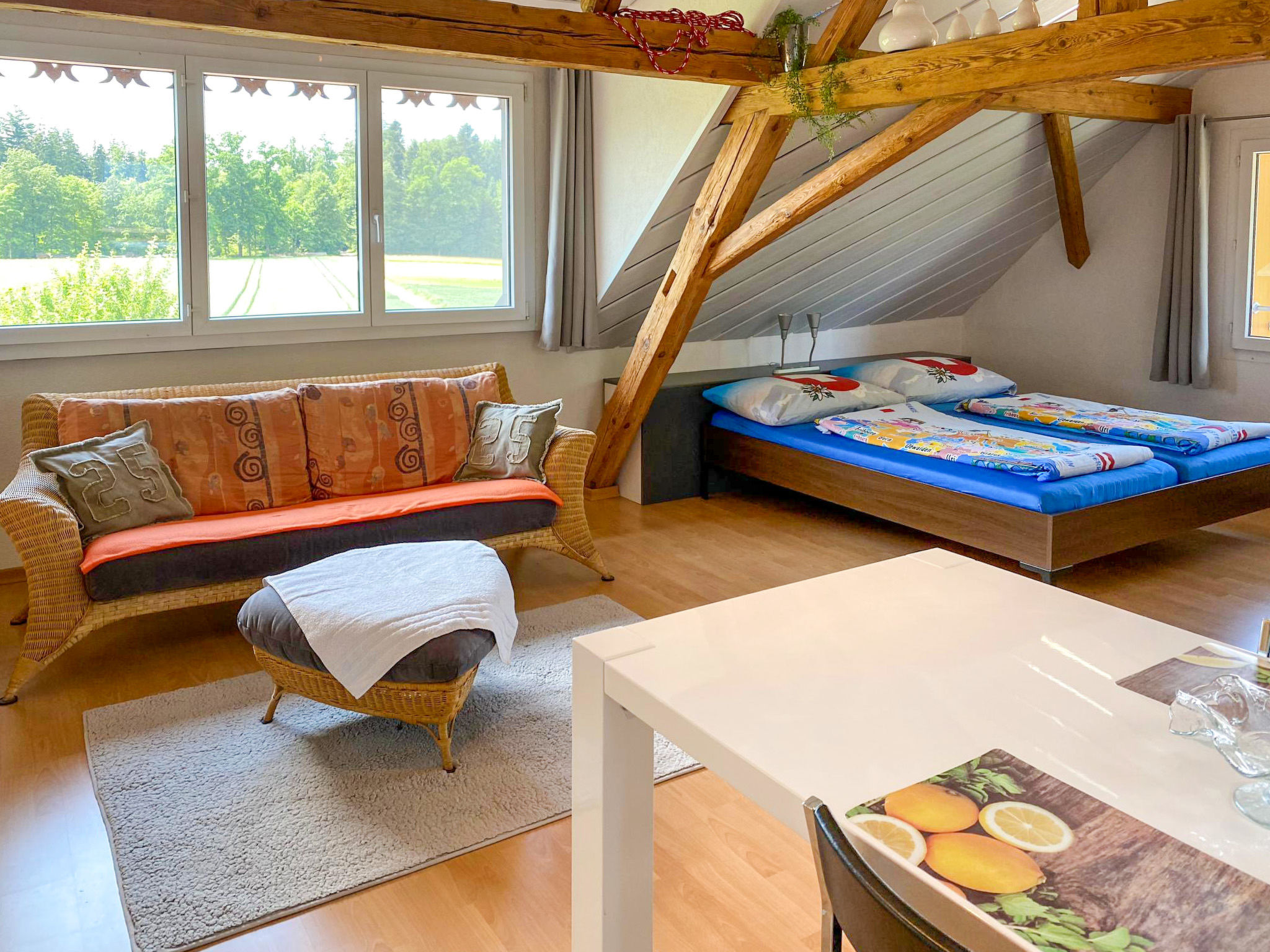 "Arn's Dachstudio", 1-Zimmer-Studio 63 m2 im 3. Stock. Geschmackvoll und gemütlich eingerichtet: Wohn-/Esszimmer mit 1 Doppelbett und Sat-TV (Flachbildschirm). Offene Küche (2 Glaskeramikplatten, Kombinationsmikrowelle) mit Esstisch. Dusche/WC. Sicht auf die Landschaft und die Ortschaft. Zur Verfügung: Internet (Wireless LAN, gratis). Parkplatz (1 Auto) beim Haus. Bitte beachten: nicht geeignet für Kinder unter 10 Jahren. Nichtraucher-Unterkunft. aus Sicherheitsgründen wird das Dachstudio nur an Nichtraucher vermietet.