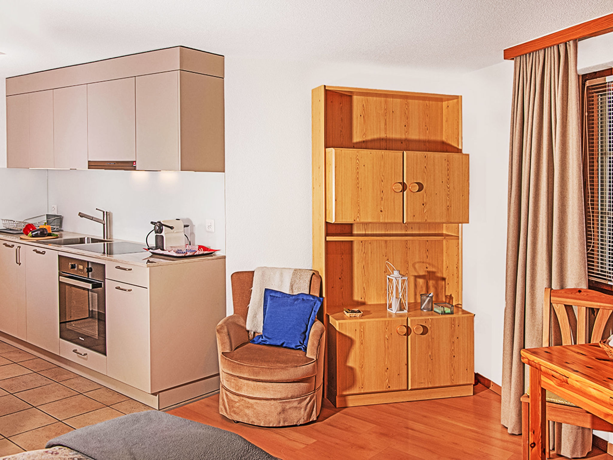 "Laurin", 1-Zimmer-Wohnung 30 m2 im 1. Stock, Südlage. Hell, teilweise renoviert, komfortabel eingerichtet: Wohn-/Schlafzimmer mit 1 Doppelbett (2 x 90 cm, Länge 200 cm), Esstisch und Digital-TV. Offene Küche (Backofen, 4 Glaskeramikplatten, Toaster, Wasserkocher, Tiefkühler, elektrische Kaffeemaschine, Racletteofen, Fondue Set (Käse)). Dusche/WC. Sicht auf die Berge. Zur Verfügung: Haartrockner. Internet (WLAN, gratis). Bitte beachten: Nichtraucher-Unterkunft.