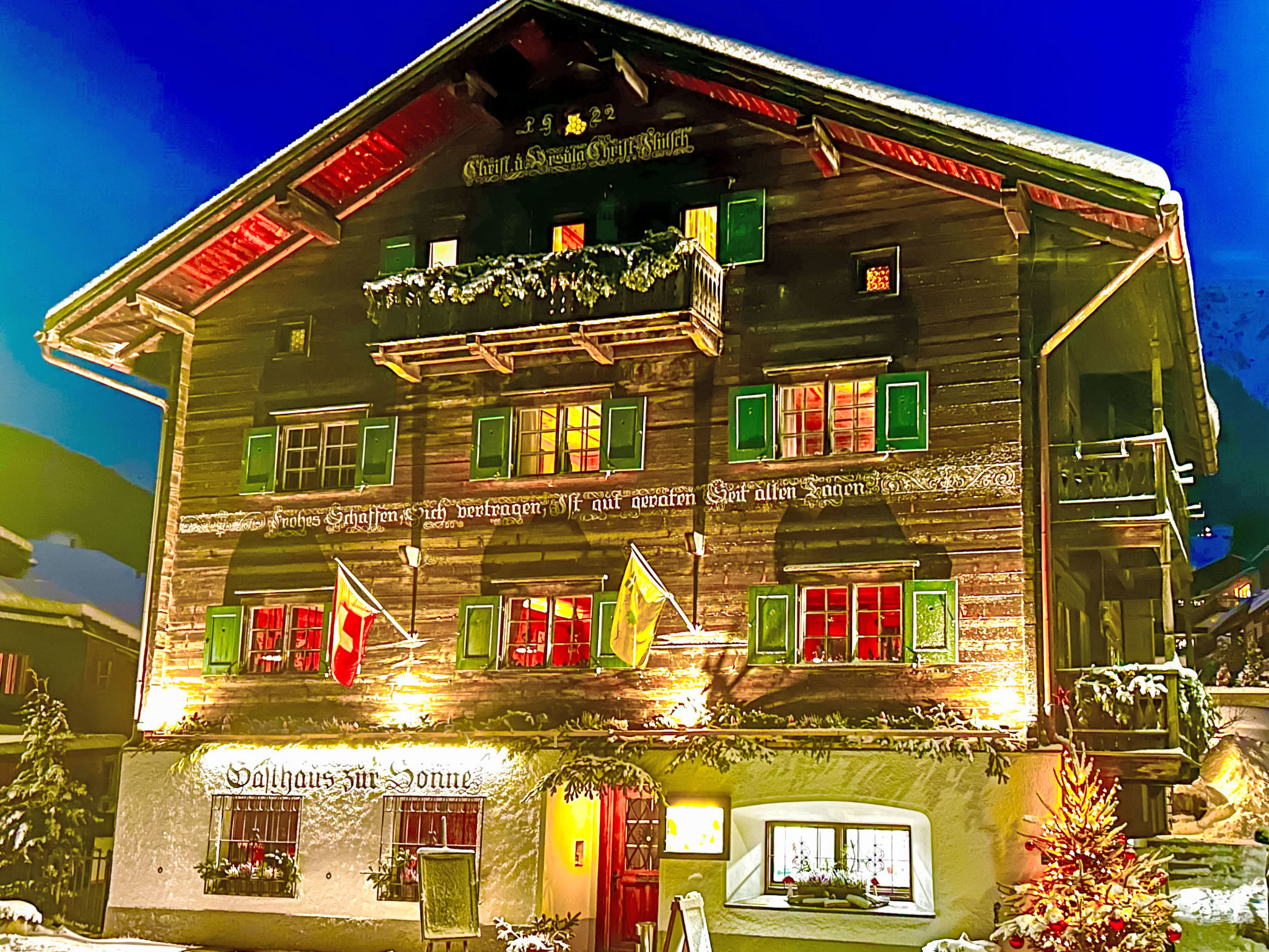 Gemütliches, rustikales Chalet "Gasthaus Sonne", 1'200 m.ü.M., auf 3 Stockwerken. Im Ortszentrum, zentrale Lage, 300 m vom Skigebiet. Im Hause: Restaurant, Skiraum, Zentralheizung. Parkplatz beim Haus. Einkaufsgeschäft, Lebensmittelgeschäft, Supermarkt 300 m, Bushaltestelle "Klosters Kirchplatz" 100 m, Bahnstation "Klosters" 300 m. Luftseilbahn, Skisportanlagen, Skipisten, Skiverleih 300 m, Skibushaltestelle 100 m, Skischule 300 m. Bekannte Skigebiete sind gut erreichbar: Davos-Klosters Gotschna/Parsenn 300 m, Klosters Madrisa 1.5 km. Altes rustikales und charmantes, aber auch hellhöriges Walser-Chalet. Restaurant mit Betrieb bis 24:00 Uhr im Erdgeschoss.