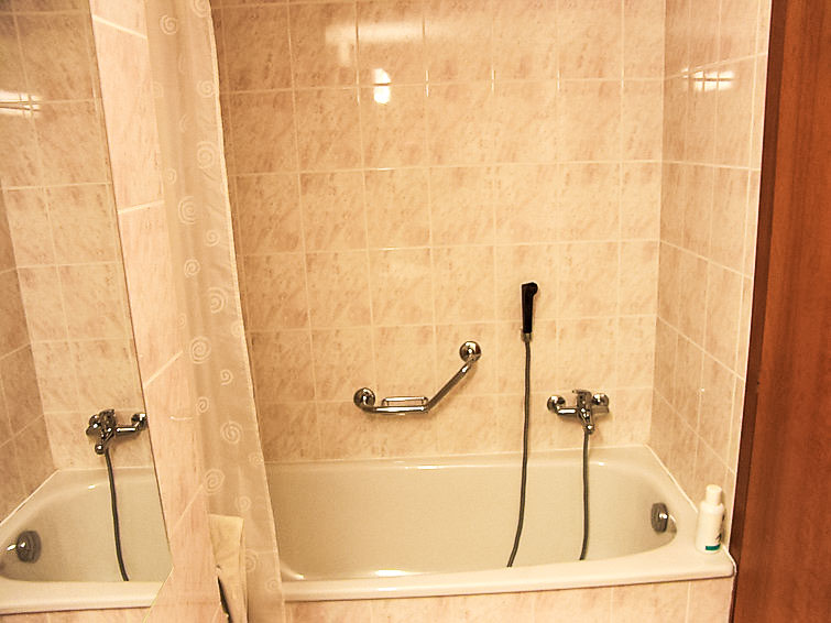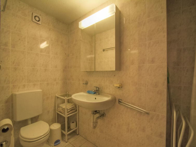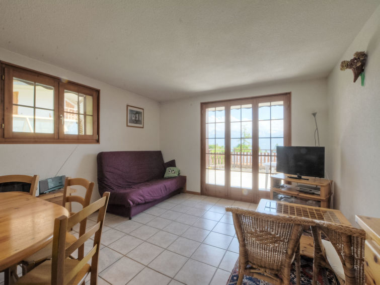 3-Zimmer-Wohnung 70 m2, im erhöhten Erdgeschoss. Zweckmässig eingerichtet: Wohn-/Esszimmer mit Esstisch, Kabel-TV und Radio. 2 Zimmer, jedes Zimmer mit 2 Betten. Offene Küche (4 Kochplatten, Backofen). Bad/WC. Grosse Terrasse, Südlage. Terrassenmöbel. Schöne Sicht auf die Berge und die Landschaft. Garage Nr. 3. Bitte beachten: Nichtraucher-Unterkunft.
