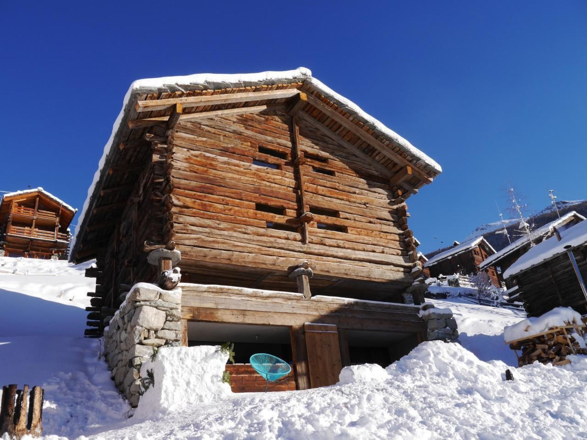 Dieser alte Dachboden war zum Abriss vorgesehen. Er wurde geborgen und umgebaut, um ihm eine neue Funktion innerhalb des Anakolodge-Komplexes zu verleihen. Dieses Maiensäss hat die Besonderheit, dass es bis zu 12 Personen beherbergen kann. Es besteht aus zwei Doppelzimmern, die sich im Sockel befinden, sowie aus einem separaten Badezimmer. Das Badezimmer wird durch einen in den Boden gehauenen Schlitz beleuchtet, der ein diffuses Licht ermöglicht.