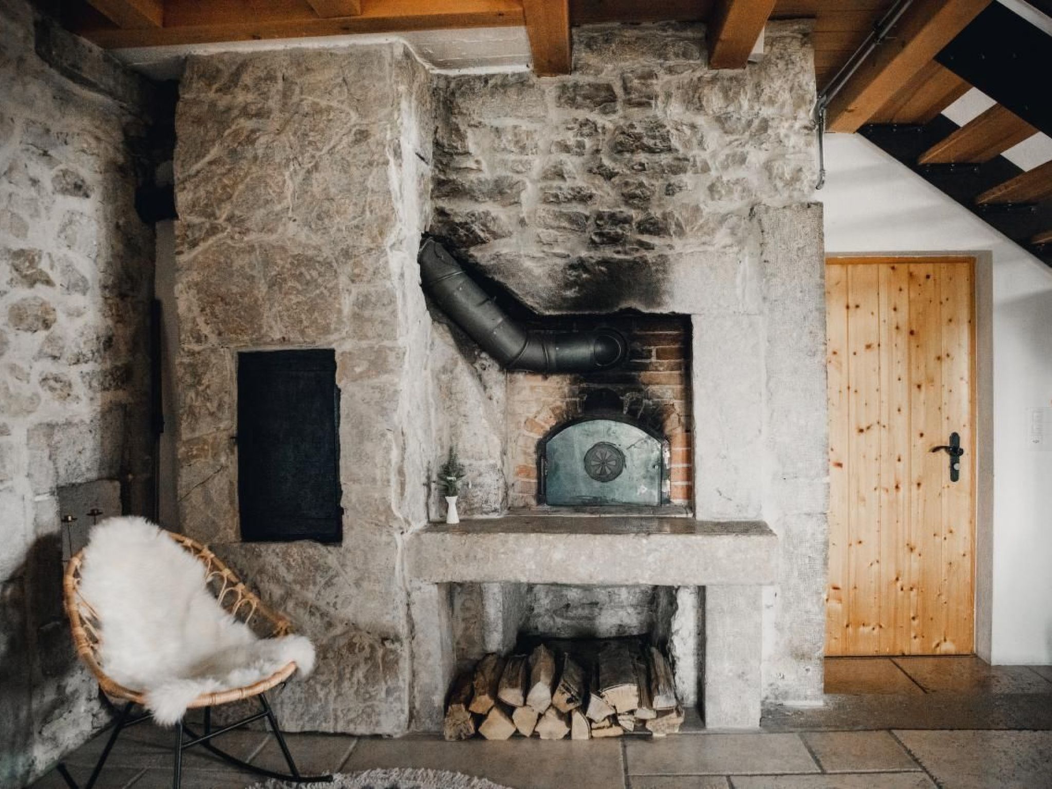 Die voll ausgestattete Küche umfasst Geschirrspüler, Induktionskochfeld, Dampfgarer und einen alten Brotbackofen, der sich perfekt für Pizzen eignet. Das Wohnzimmer mit seinem Holzofen lädt zu gemütlichen Stunden ein. Die Wohnung verfügt über zwei komplette Badezimmer und drei gemütliche Schlafzimmer, von denen zwei mit großen Boxspringbetten und eines mit Einzelbetten ausgestattet sind. Ein Babybett kann auf Anfrage hinzugefügt werden.