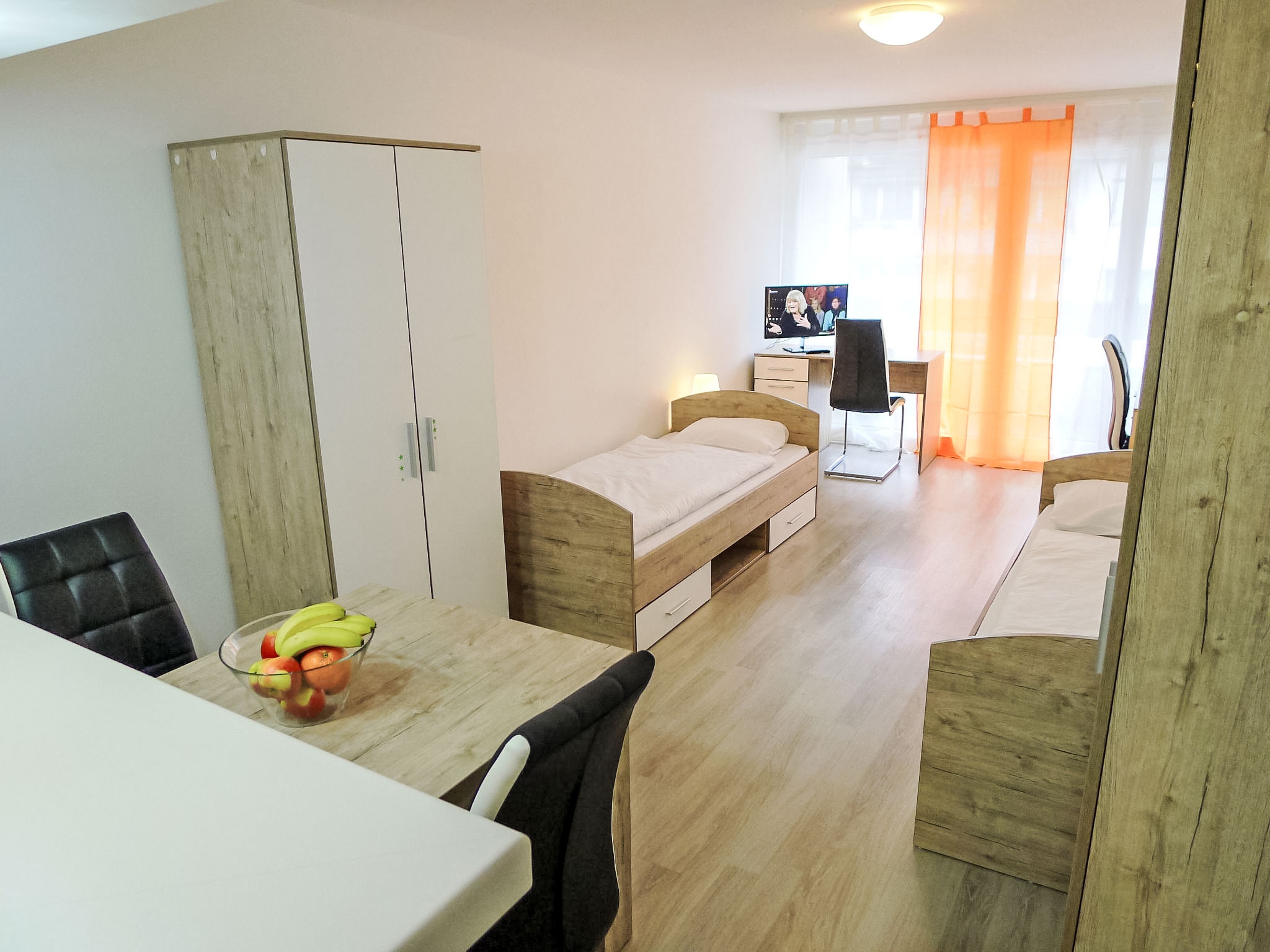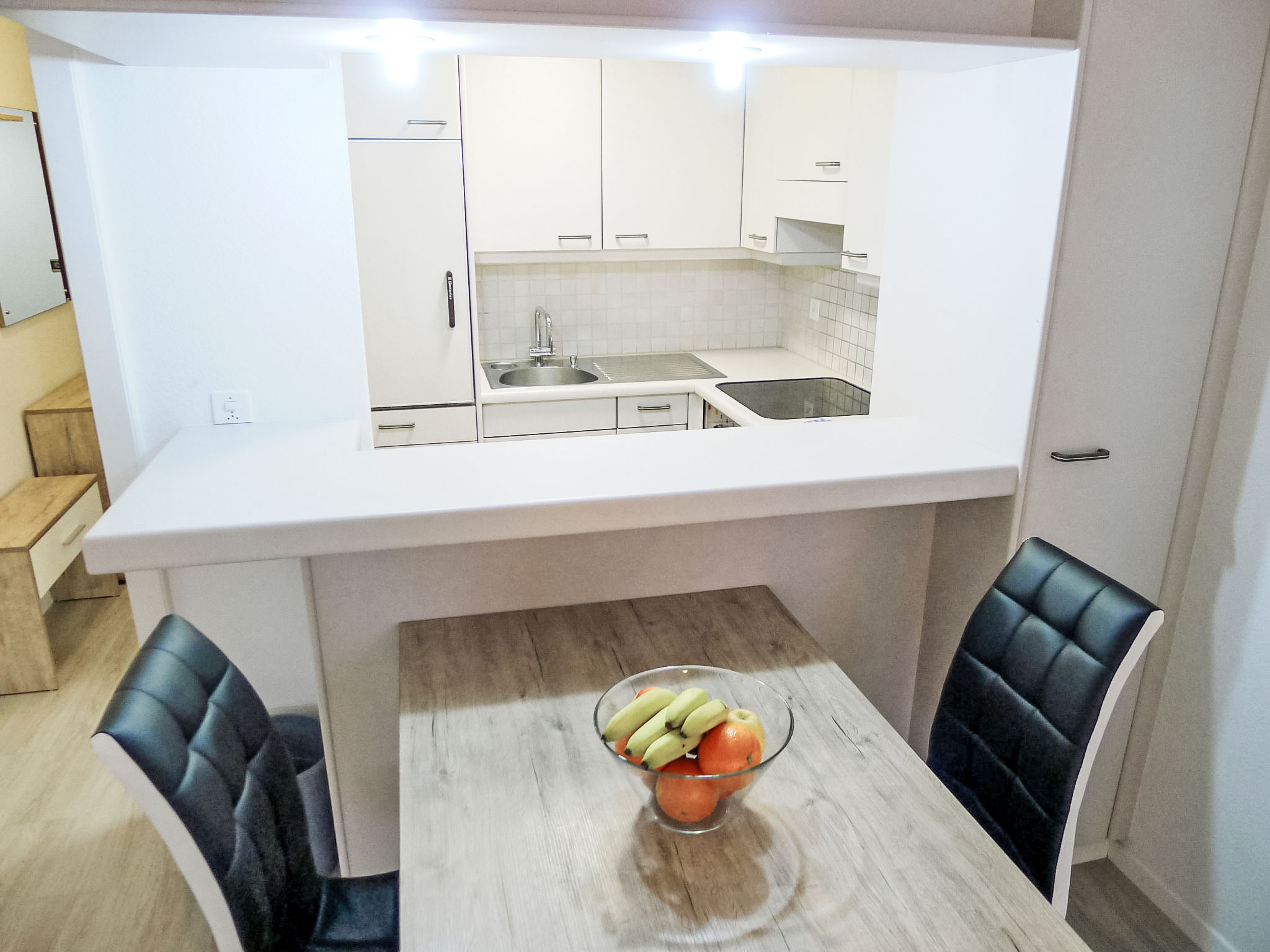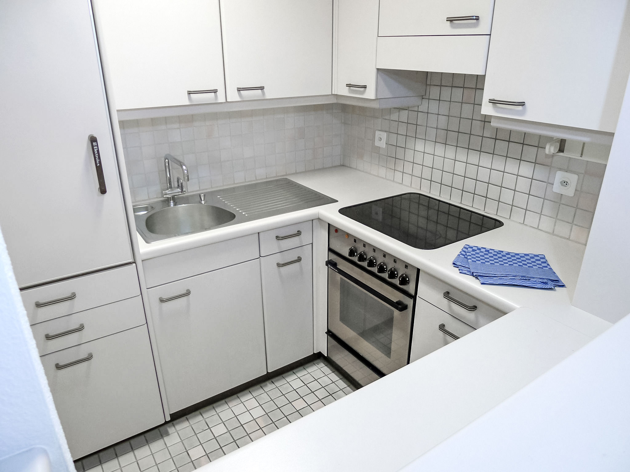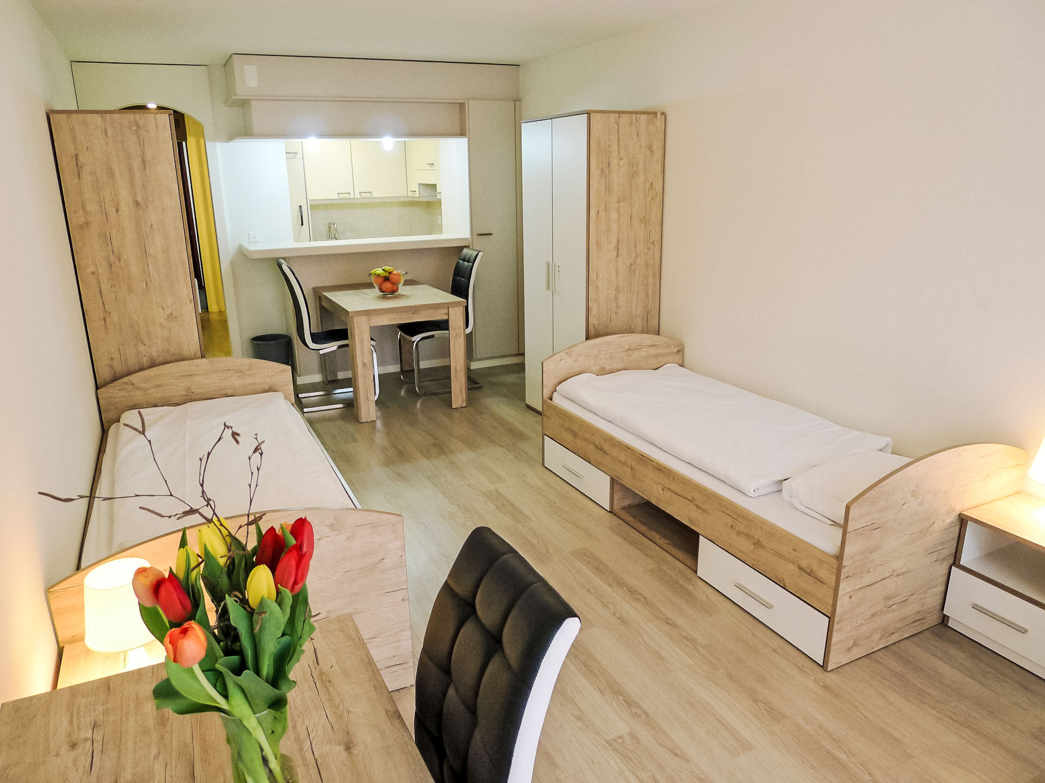 1-Zimmer-Wohnung 21 m2. Zweckmässig und gemütlich eingerichtet: Wohn-/Esszimmer mit 2 Betten (90 cm, Länge 200 cm). Ausgang zum Balkon. Offene Küche (4 Kochplatten, Backofen, elektrische Kaffeemaschine, Kapseln für die Kaffeemaschine (Nespresso) extra). Bad oder Dusche/WC. Balkon. Zur Verfügung: Internet (Wireless LAN, gratis). Bitte beachten: Nichtraucher-Unterkunft.