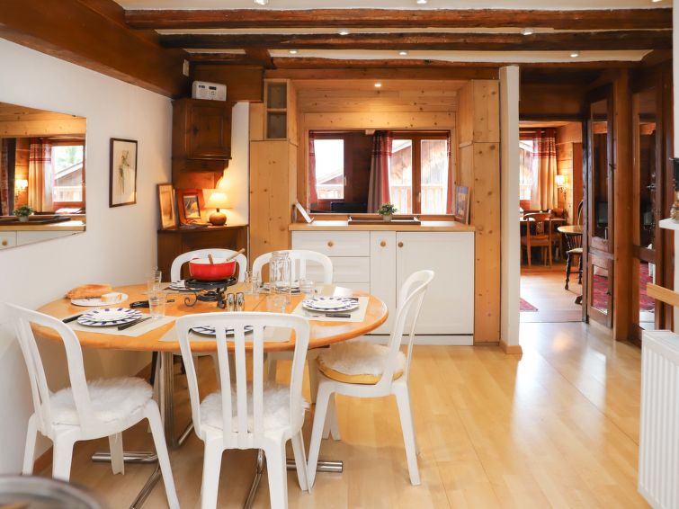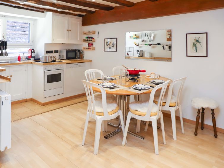"Les Moulins", 3-Zimmer-Wohnung 71 m2 im 1. Stock. Teilweise renoviert im Jahre 2022, gemütlich und mit viel Holz eingerichtet: 1 Zimmer mit 1 franz. Bett (140 cm, Länge 200 cm). 1 kleines Zimmer mit 1 franz. Bett (1 x 140 cm, Länge 195 cm). Wohnzimmer mit 1 Diwanbett (140 cm, Länge 200 cm). Ausgang zum Balkon. Küche (Backofen, Geschirrspüler, Mikrowelle) mit Esstisch. Dusche/WC. Balkon, Südlage. Eingeschränkte Sicht auf die Berge. Zur Verfügung: Internet (Wireless LAN, gratis). Bitte beachten: Nichtraucher-Unterkunft. Maximal 1 Haustier/Hund erlaubt.