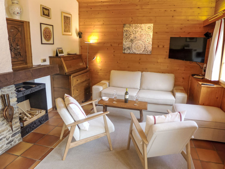 "Les Clarines", 4-Zimmer-Chalet 100 m2 auf 2 Stockwerken. Geschmackvoll und mit viel Holz eingerichtet: Wohn-/Esszimmer mit offenem Kamin, Esstisch, Essecke, Kabel-TV und Radio. Offene Küche (Backofen, Geschirrspüler, 4 Glaskeramikplatten, Mikrowelle, Tiefkühler, elektrische Kaffeemaschine, Kapseln für die Kaffeemaschine (Nespresso) extra, Racletteofen, Fondue Set (Käse)). Ausgang zum Balkon. Sep. WC. Unteres Geschoss: 1 Zimmer mit 1 franz. Bett (160 cm, Länge 200 cm). Ausgang zur Terrasse. 2 Zimmer, jedes Zimmer mit 2 Betten (90 cm, Länge 190 cm). Bad/WC, Dusche. E-Heizung. Balkon, Südlage und Ostlage, kleine Terrasse, Südlage. Balkonmöbel, Abstellkammer. Schöne Panoramasicht auf die Berge, die Landschaft und die Ortschaft. Zur Verfügung: Bügeleisen, Haartrockner. Internet (WLAN, gratis). Garage (1 Auto), Höhe 180 cm. Bitte beachten: Nichtraucher-Haus. Maximal 2 Haustiere/Hunde erlaubt.