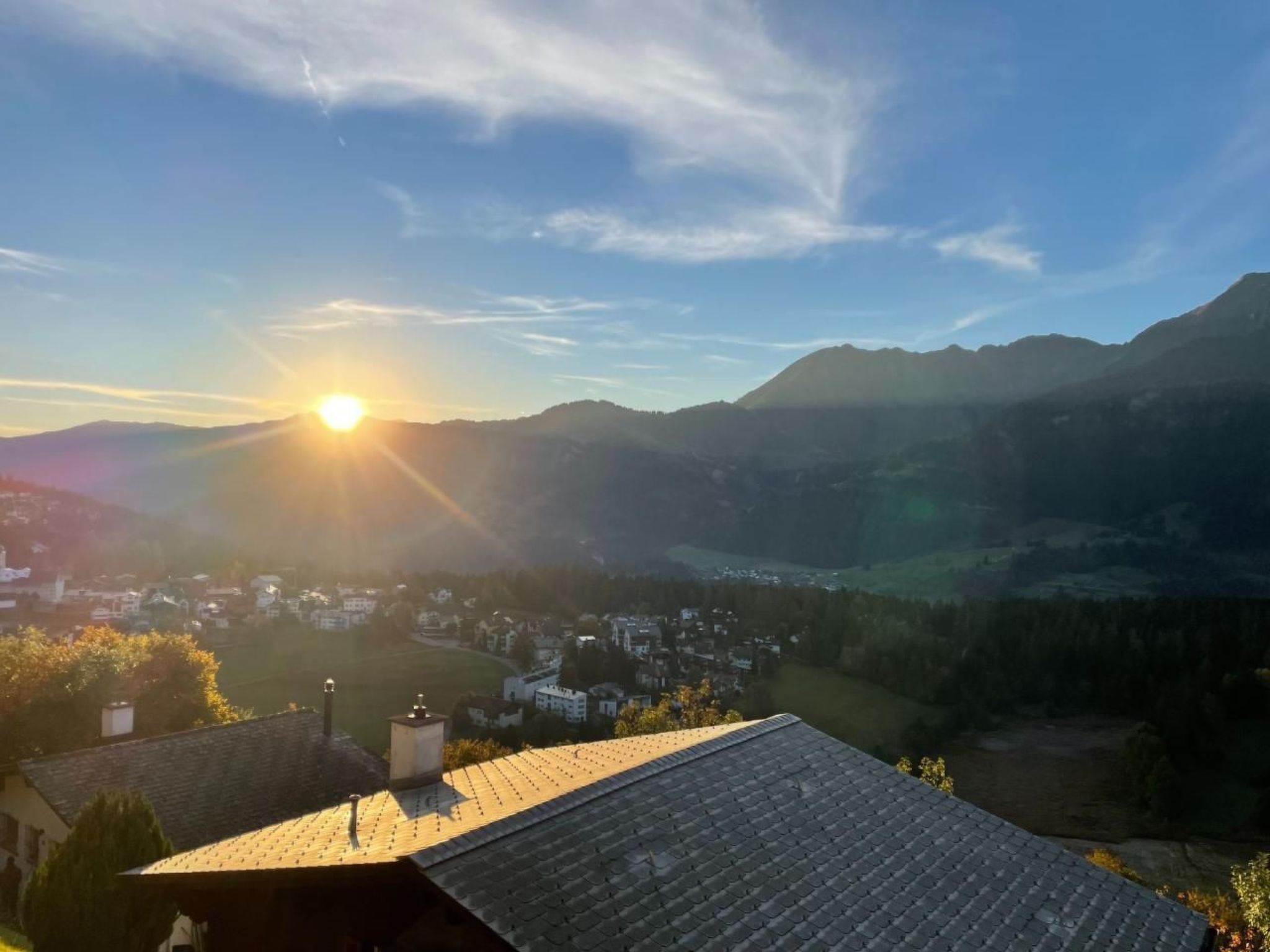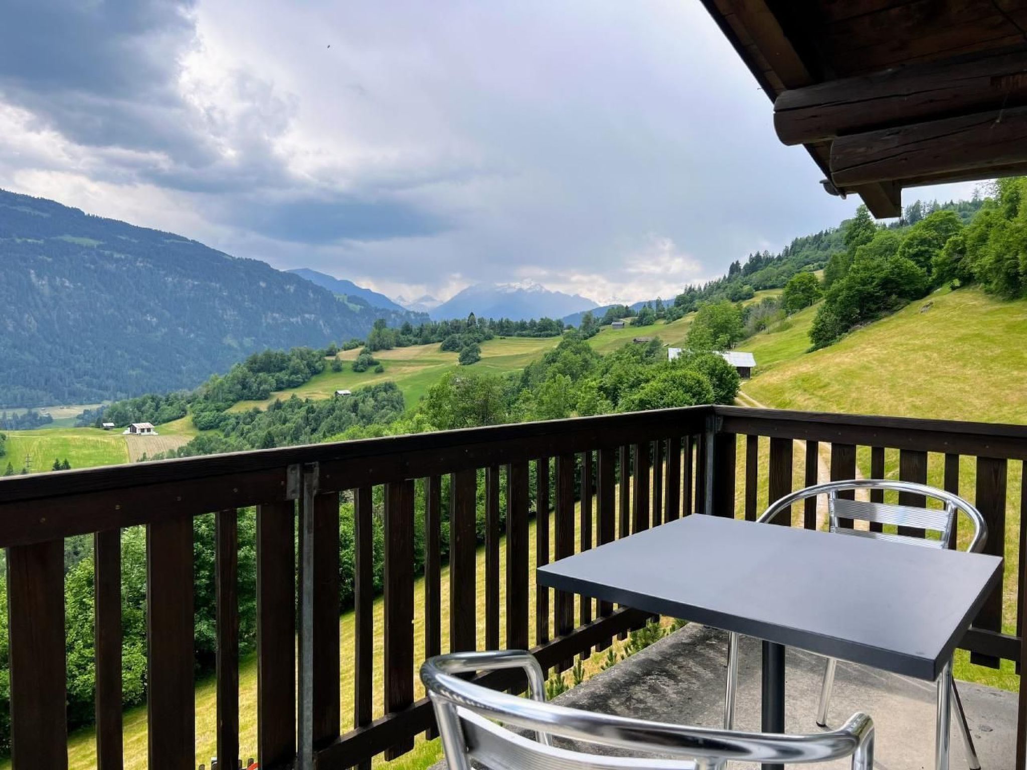 Im Obergeschoss befinden sich der Haupteingang, 3 Schlafzimmer, 2 Bäder und der kürzlich kombinierte Küchen-/Wohnbereich mit übergroßen Fenstern, die einen spektakulären Blick auf die umliegenden Berge bieten. Ein 200 Jahre alter Massivholztisch bietet Platz für 10 Personen und ein 65-Zoll-4K-Fernseher sorgt für gute Unterhaltung. Von diesem Raum aus gelangt man auch auf den Balkon und die Terrasse, die beide absolute Privatsphäre (keine Nachbarn im Westen...) und einen atemberaubenden Blick auf die Berge und das darunter liegende Tal bieten.
