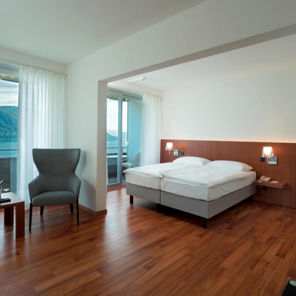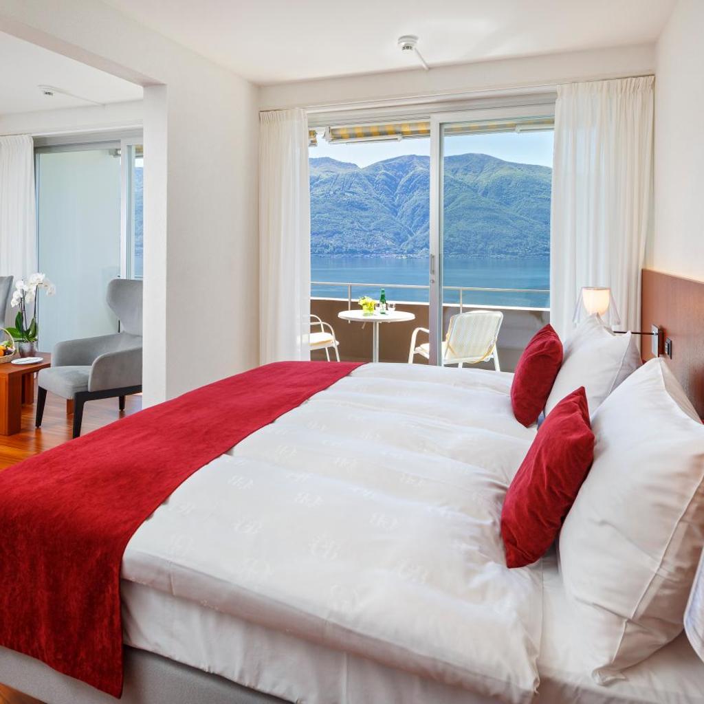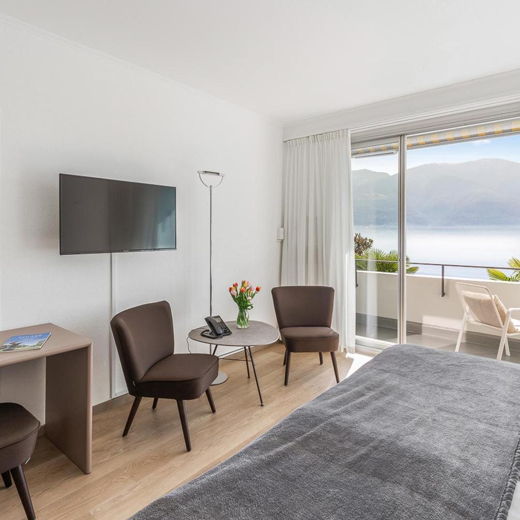 Die Zimmer verfügen alle über eine Minibar, Sat-TV und ein Badezimmer mit Bademänteln und einem Haartrockner. Alle Zimmer im Hauptgebäude bieten einen Balkon mit Panoramablick auf den See.