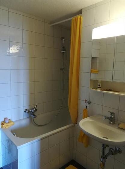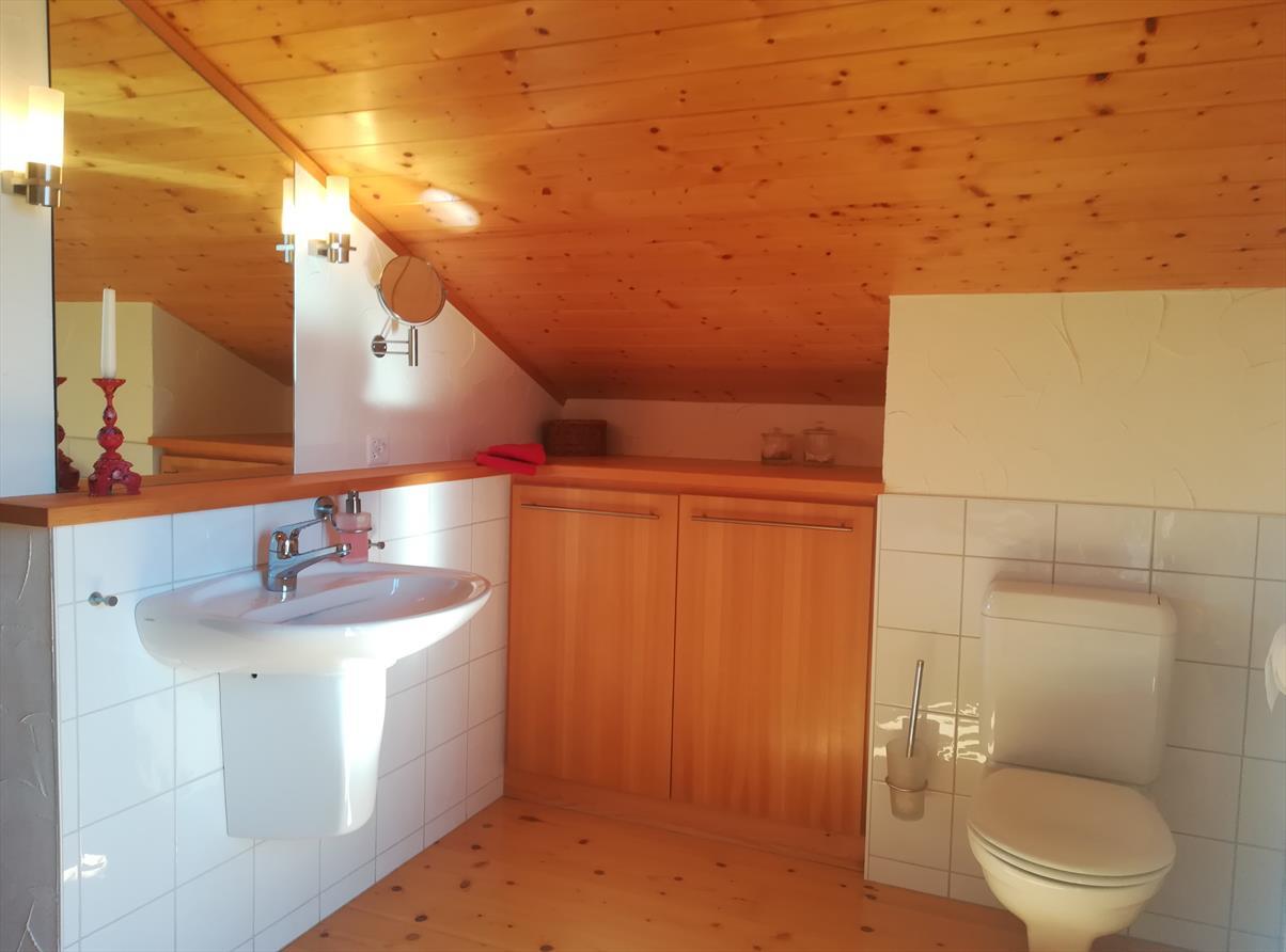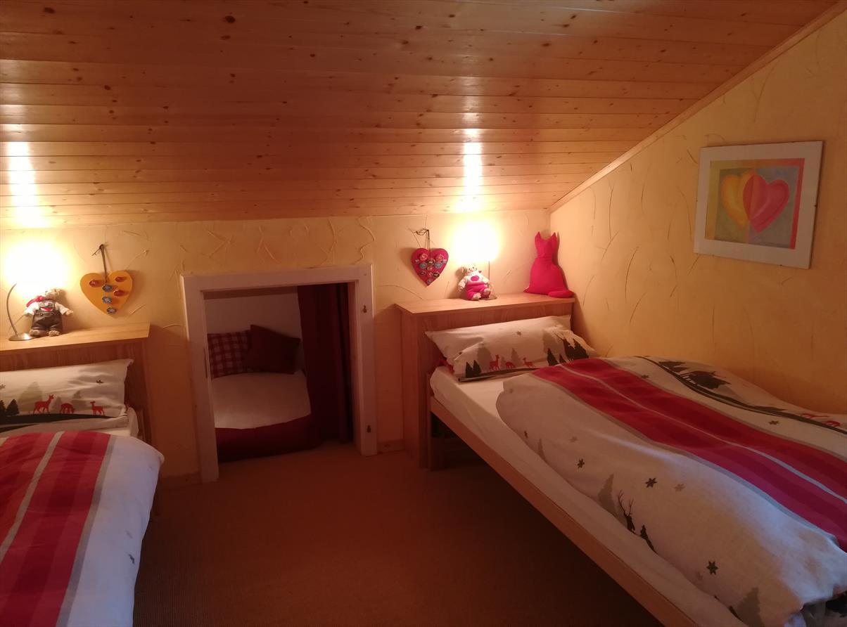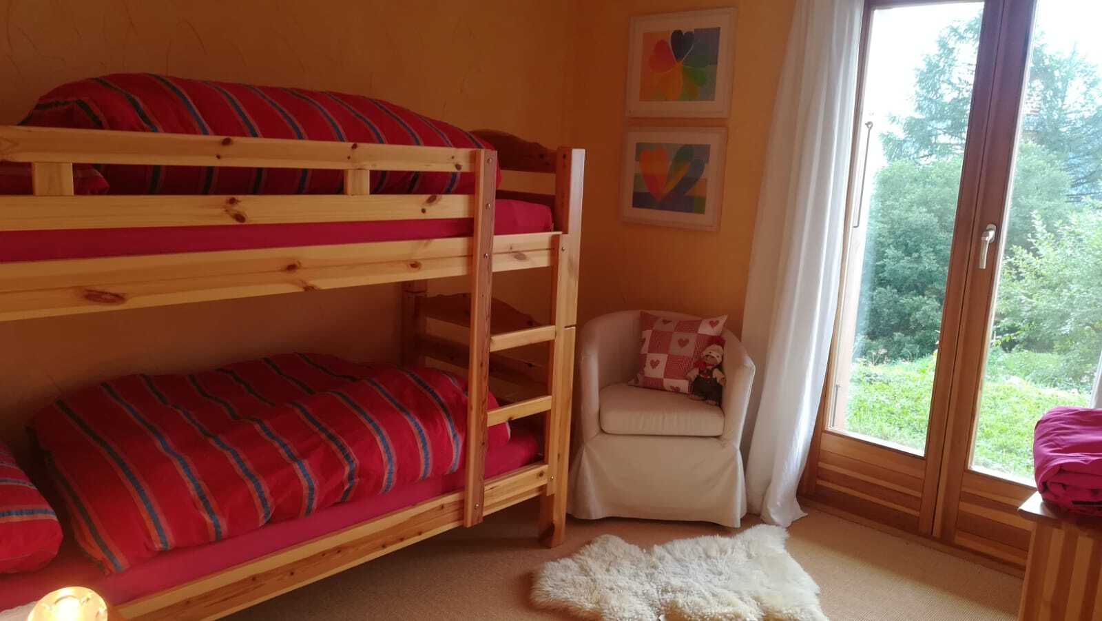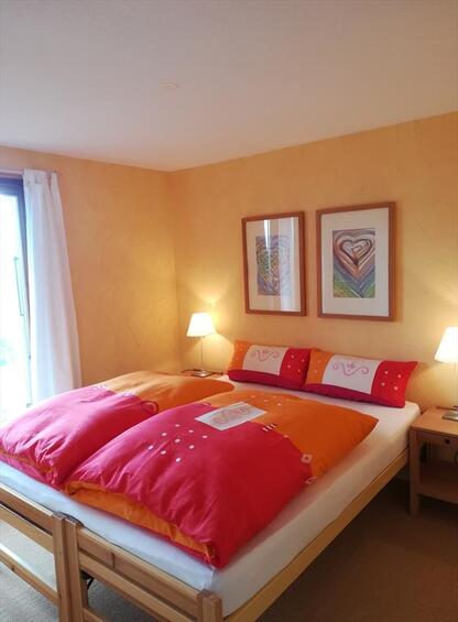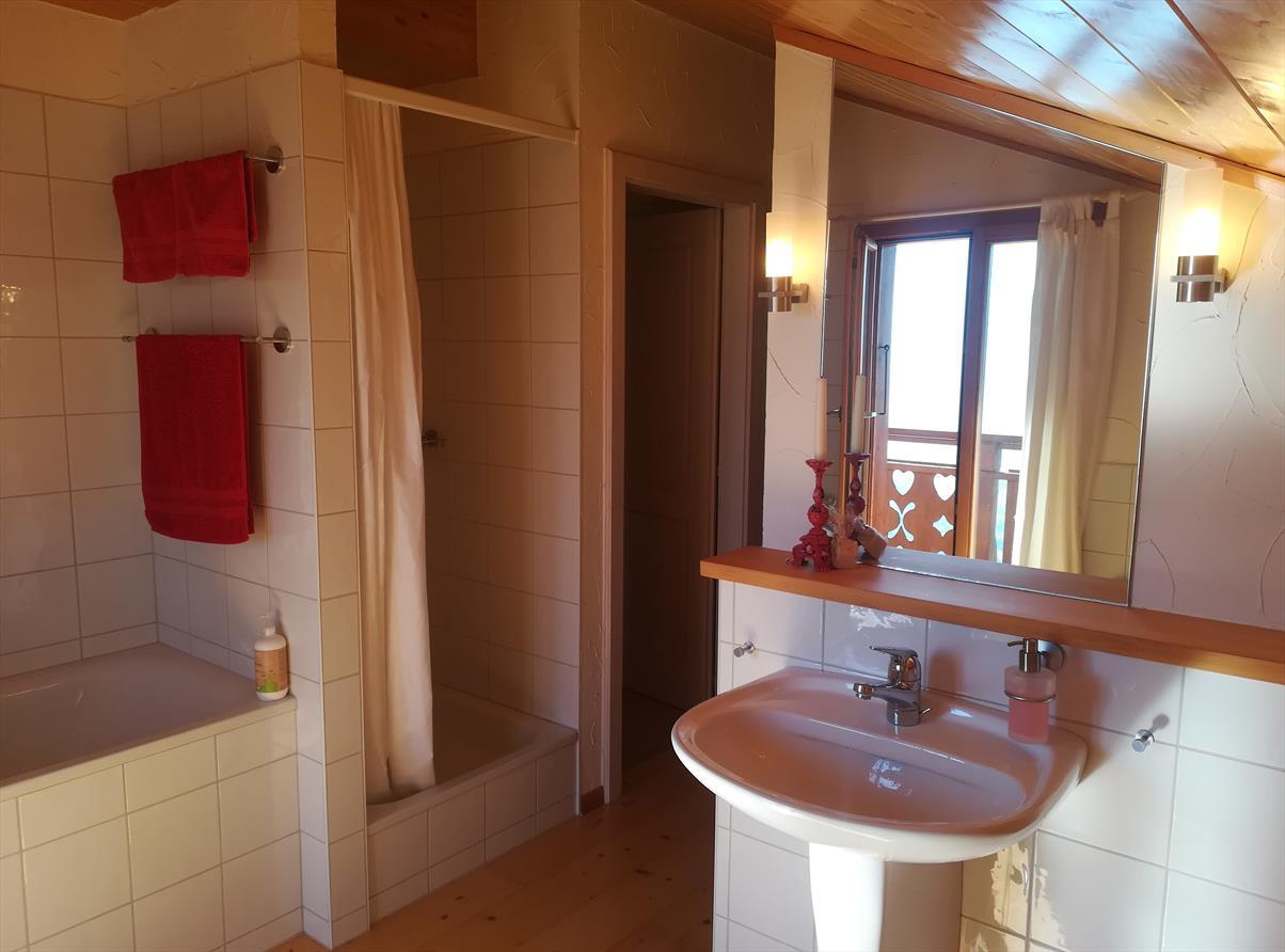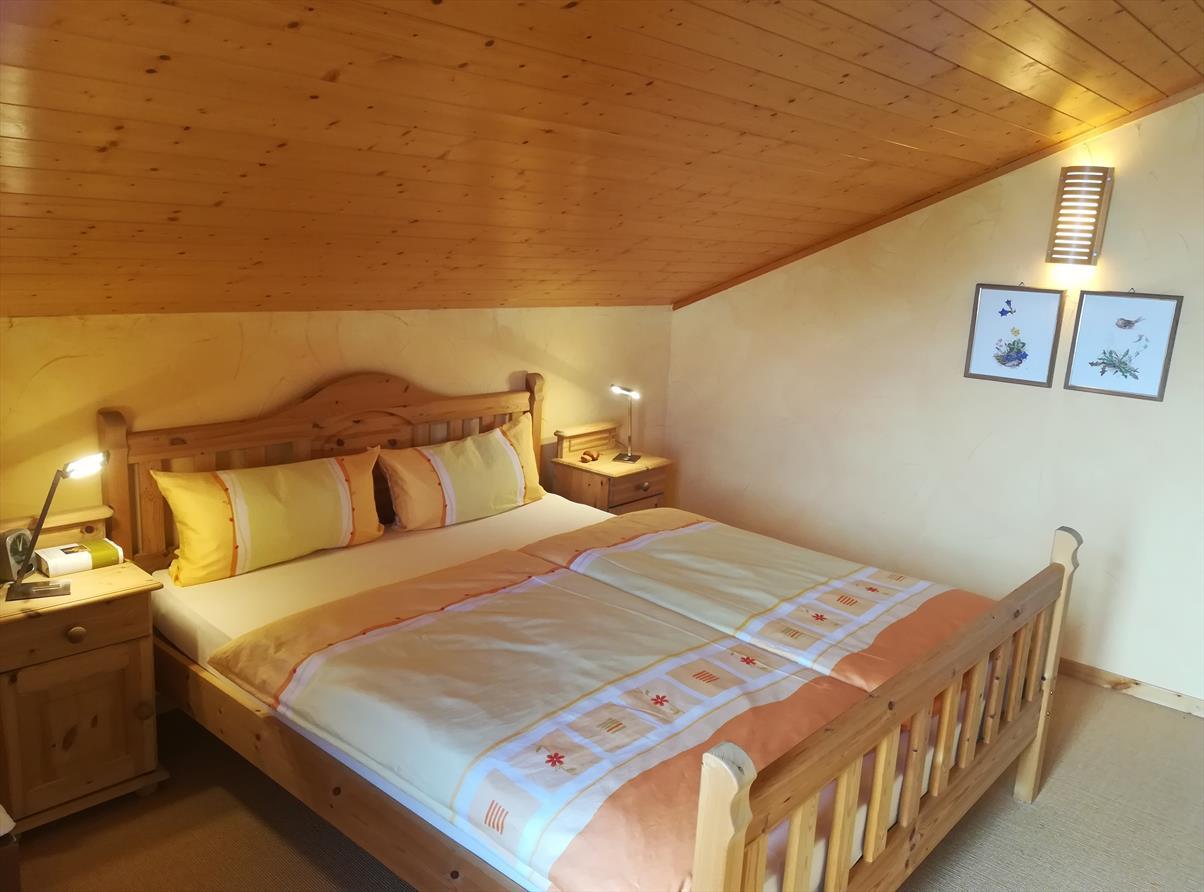Obergeschoss: 1 Zimmer mit Doppelbett (160 cm), 1 Zimmer mit zwei Einzelbetten, Badezimmer mit Badewanne/Dusche/WC/Waschbecken. Untergeschoss: 1 Zimmer mit zwei Betten nebeneinander, 1 Zimmer mit 1 Etagenbetten, Badezimmer mit Badewanne/WC/Waschbecken, Skiraum. Südostterrasse, Balkone im Osten, Autostellplatz