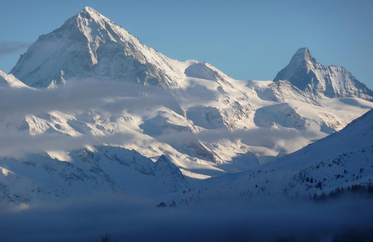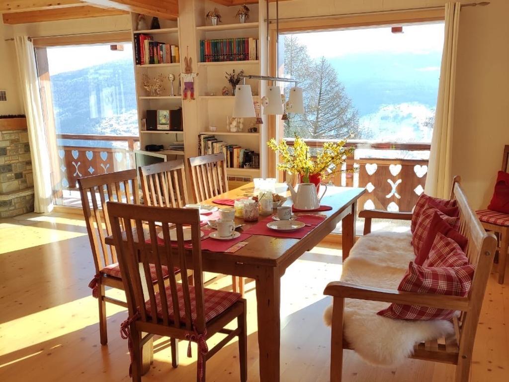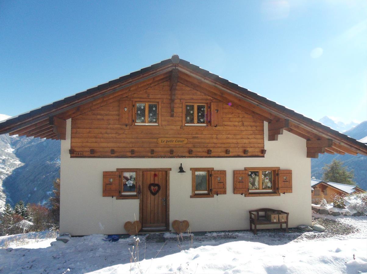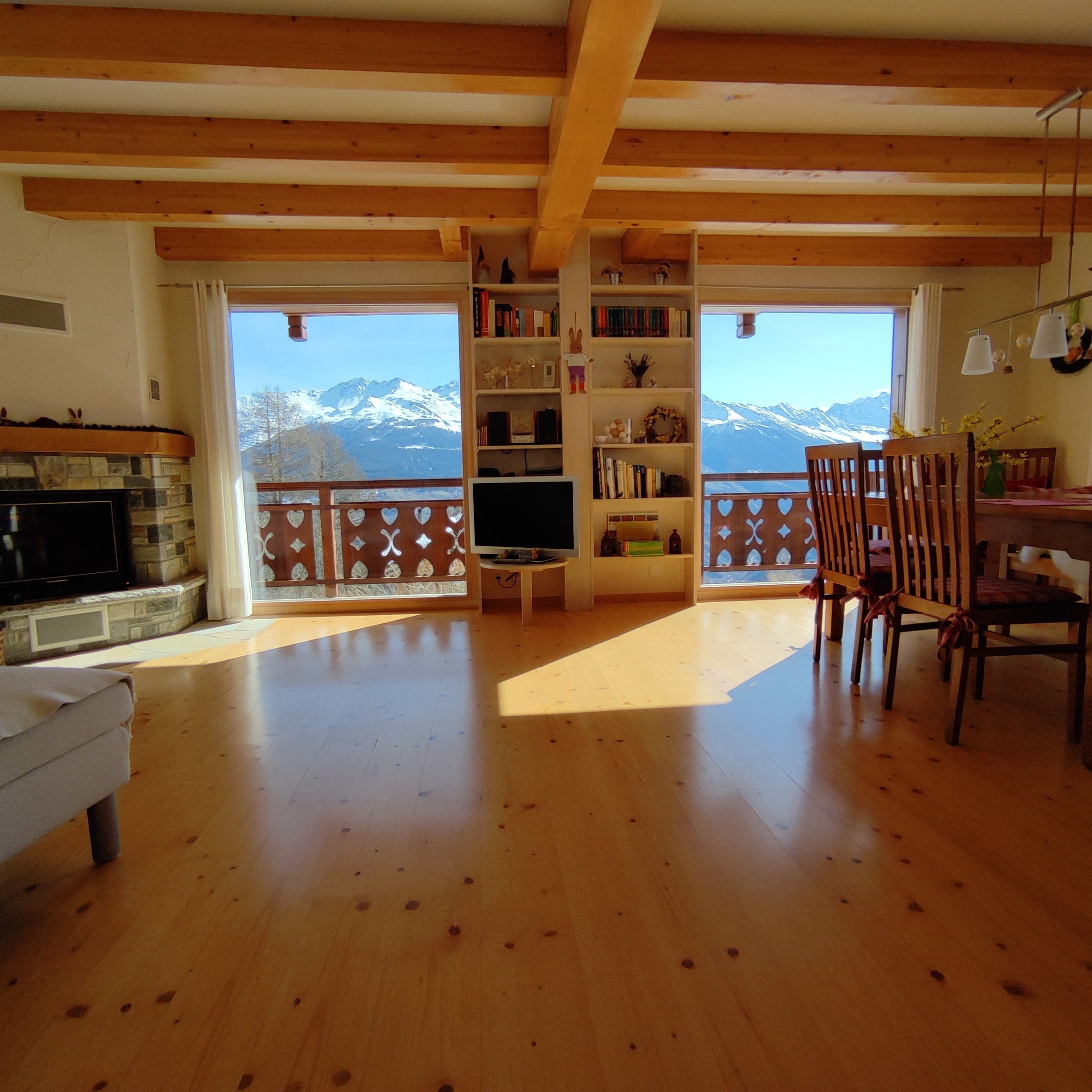 5 Zimmer Chalet auf 3 Etagen (8 Personen), liebevolle Einrichtung, grandioser Ausblick auf die Walliser Alpen mit Matterhorn und Dent Blanche. Erdgeschoss: Großzügiger Wohn- und Essraum, Küche, sep. WC/Waschbecken