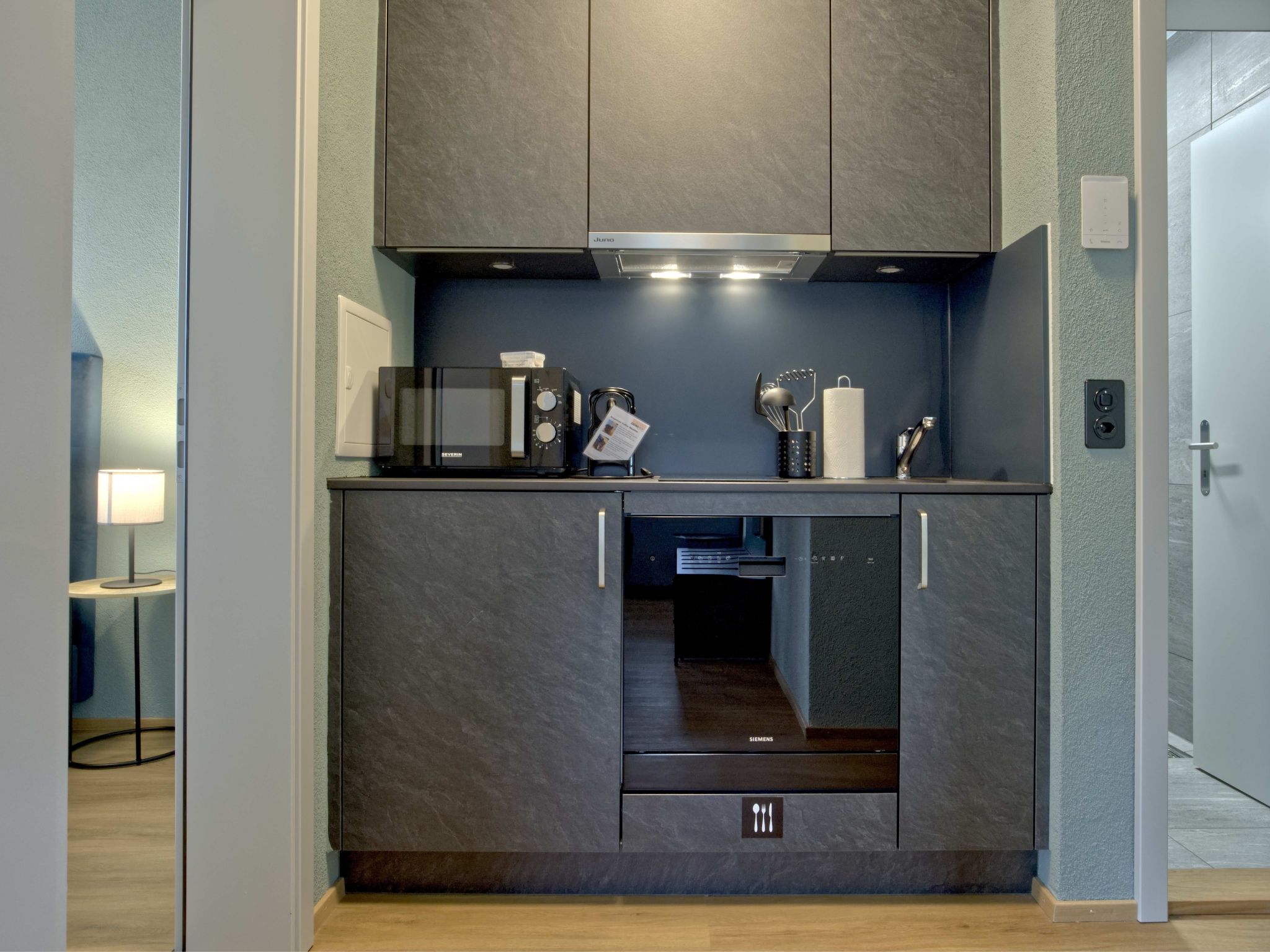 Der gemütliche Wohnbereich ist liebevoll eingerichtet und lädt zum Verweilen ein. Hier findest Du eine bequeme Sofaecke und einen kleinen Essbereich, an dem Du deine Mahlzeiten geniessen kannst. Das Schlafsofa bietet Platz für zwei weitere Personen, sodass auch kleinere Gruppen oder Familien einen angenehmen Aufenthalt haben. Die moderne Küche mit Kochmöglichkeit, Mikrowelle, Geschirrspüler und Nespresso Kaffeemaschine ist komplett ausgestattet mit allem, was Du für deinen Aufenthalt benötigst. Die Unterkunft bietet kostenlose, mitbenutzte Wäschemöglichkeiten.