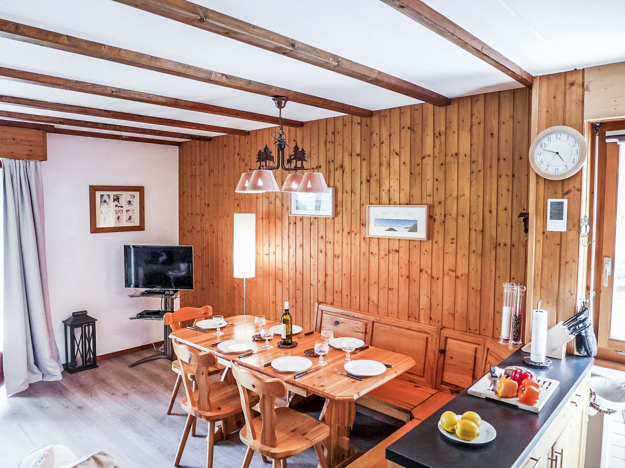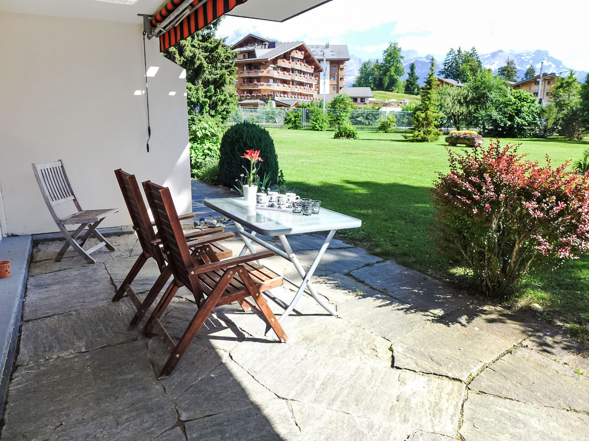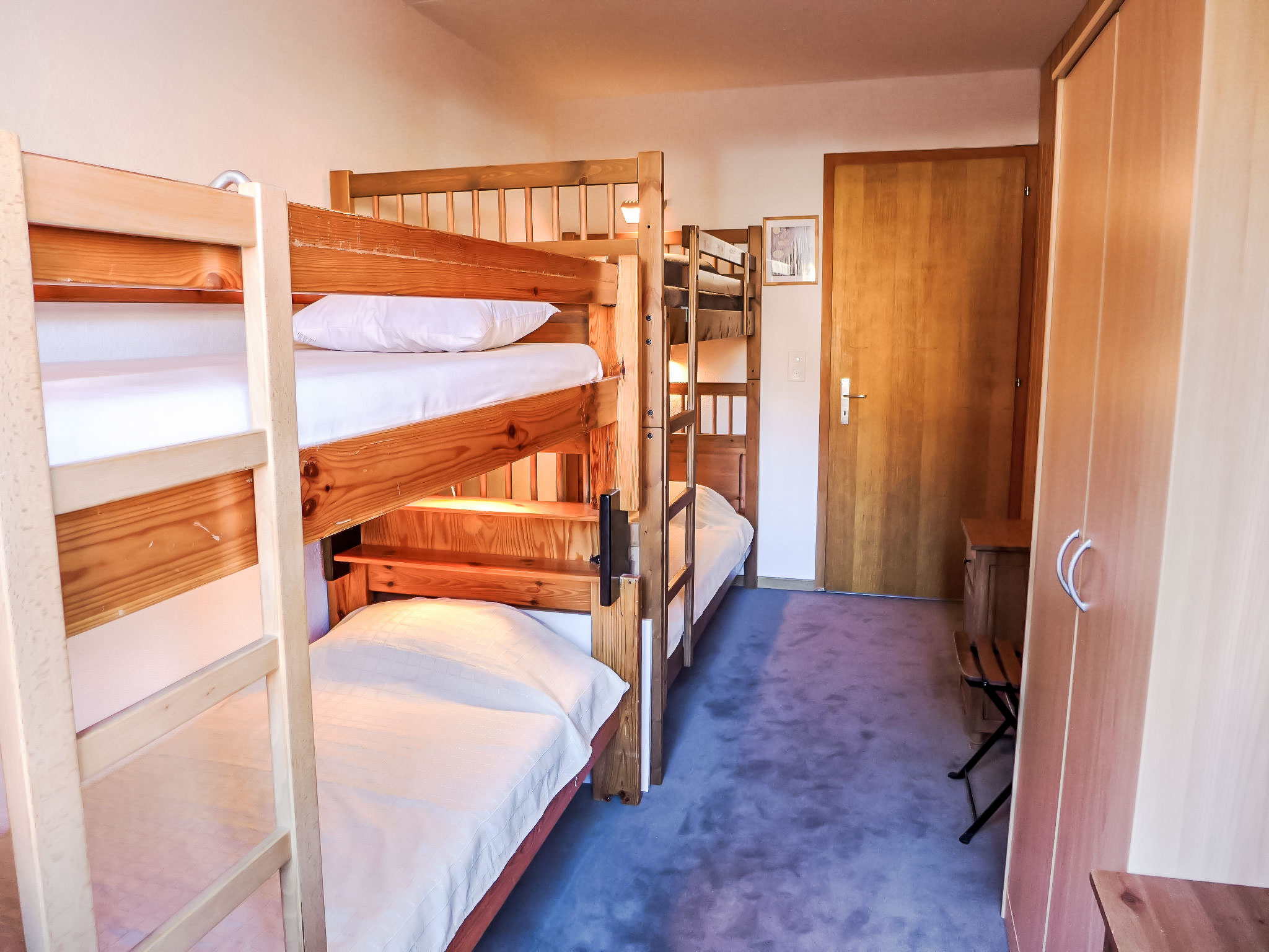 "Diamant 1", 3-Zimmer-Wohnung 70 m2, im Erdgeschoss, Südlage. Renoviert im Jahre 2016, komfortabel und schön eingerichtet: Wohn-/Esszimmer mit Esstisch und TV (Flachbildschirm), DVD. Ausgang zum Garten, Richtung Süden. 1 Kinderzimmer mit 2 x 2 Etagenbetten. 1 Zimmer mit 2 Betten (90 cm, Länge 200 cm). Offene Küche (Backofen, Geschirrspüler, 4 Glaskeramikplatten, Toaster, Wasserkocher, elektrische Kaffeemaschine, Kapseln für die Kaffeemaschine (Nespresso), Racletteofen, Fondue Set (Käse)). Bad/WC, sep. WC, Doppelwaschbecken. Terrasse 10 m2. Schöne Panoramasicht auf die Berge. Zur Verfügung: Haartrockner. Internet (WLAN, gratis). Garage Nr. 12. Maximal 2 Haustiere/Hunde erlaubt.