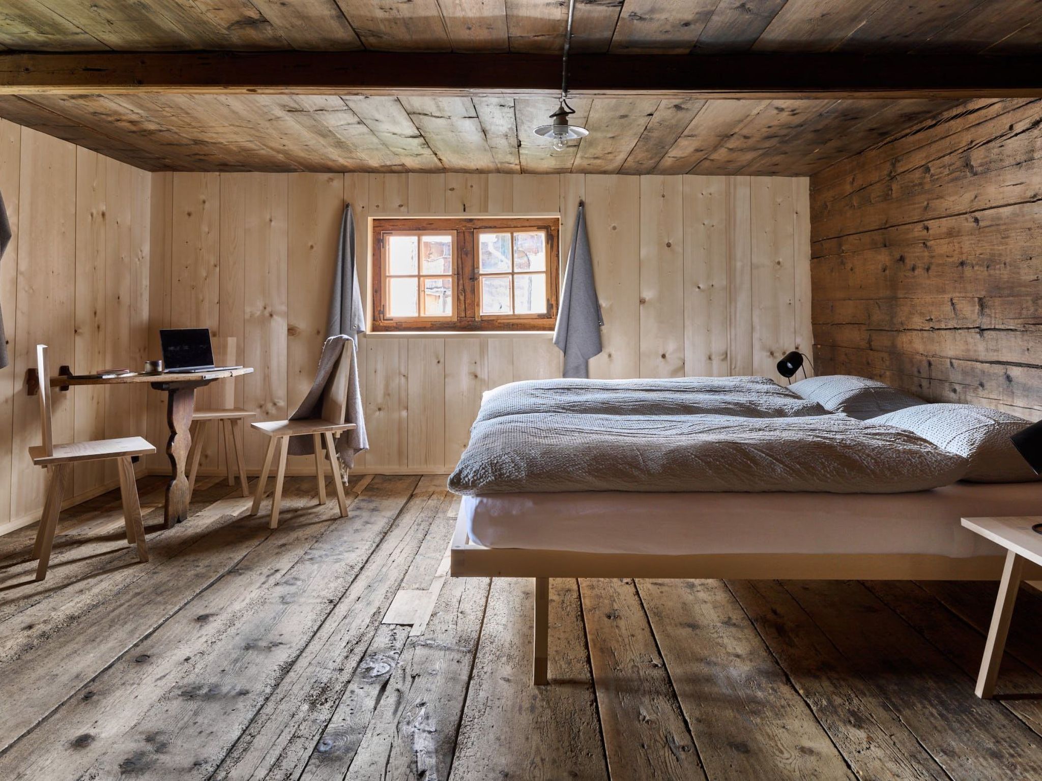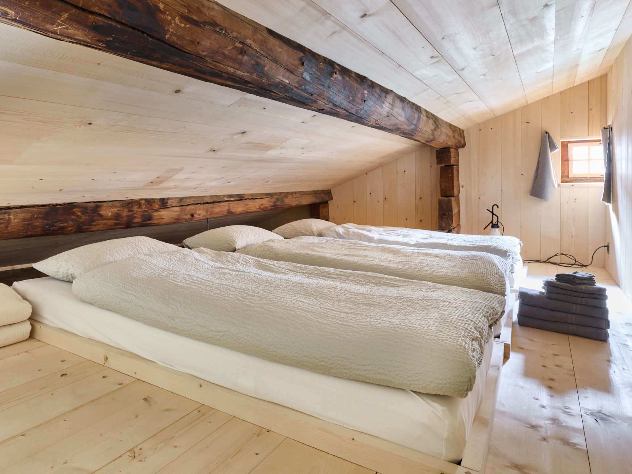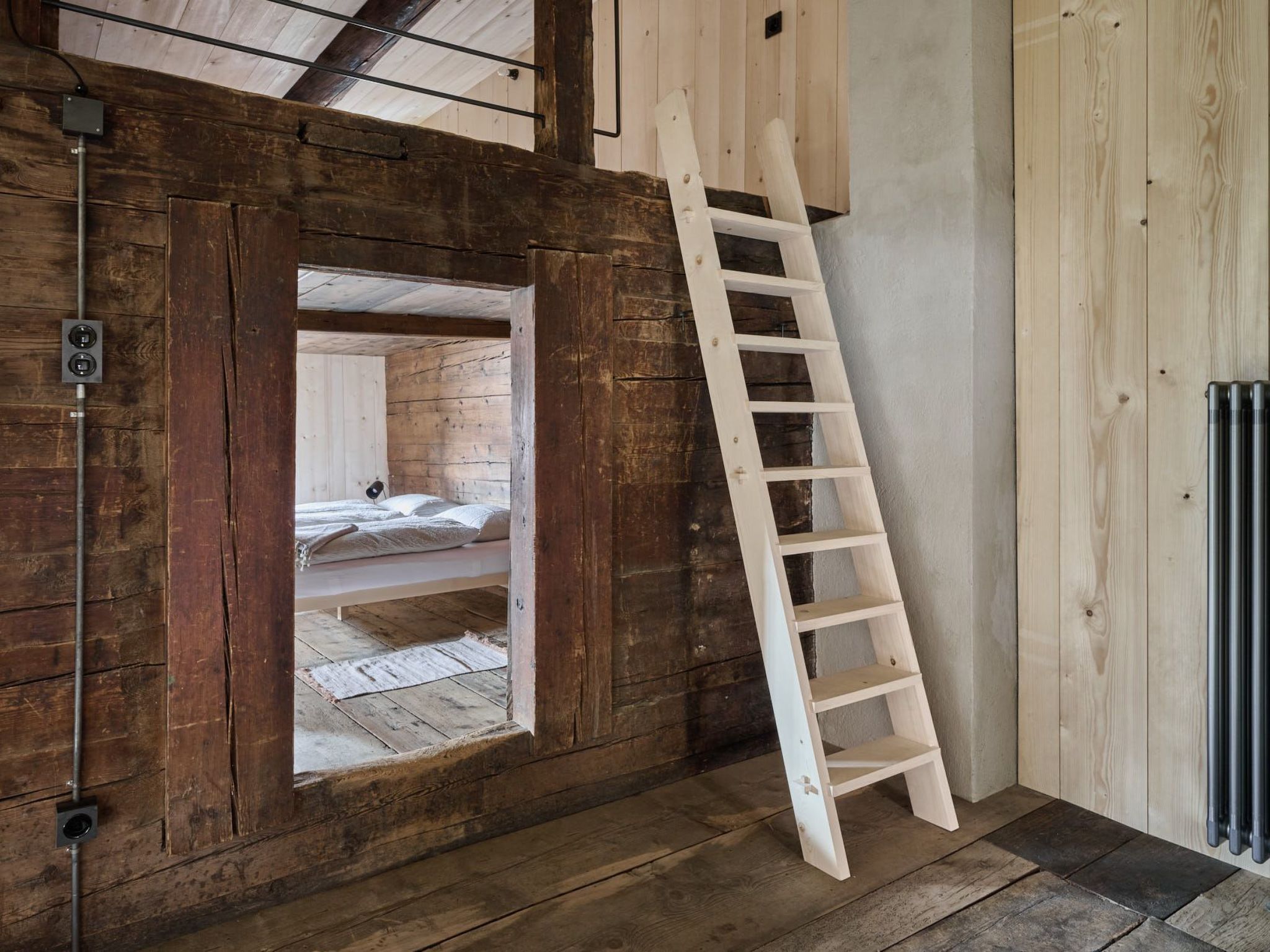 Anzahl Personen 3-6: 2 Schlafzimmer. Im 1. OG 1 Zimmer mit Doppelbett (180/200) ein Zimmer mit Einzelbett (90/200). Im Dachstock befindet sich ein Schlaflager für 3 Personen. Der Dachstock ist mit einer steilen Leiter zu erreichen.