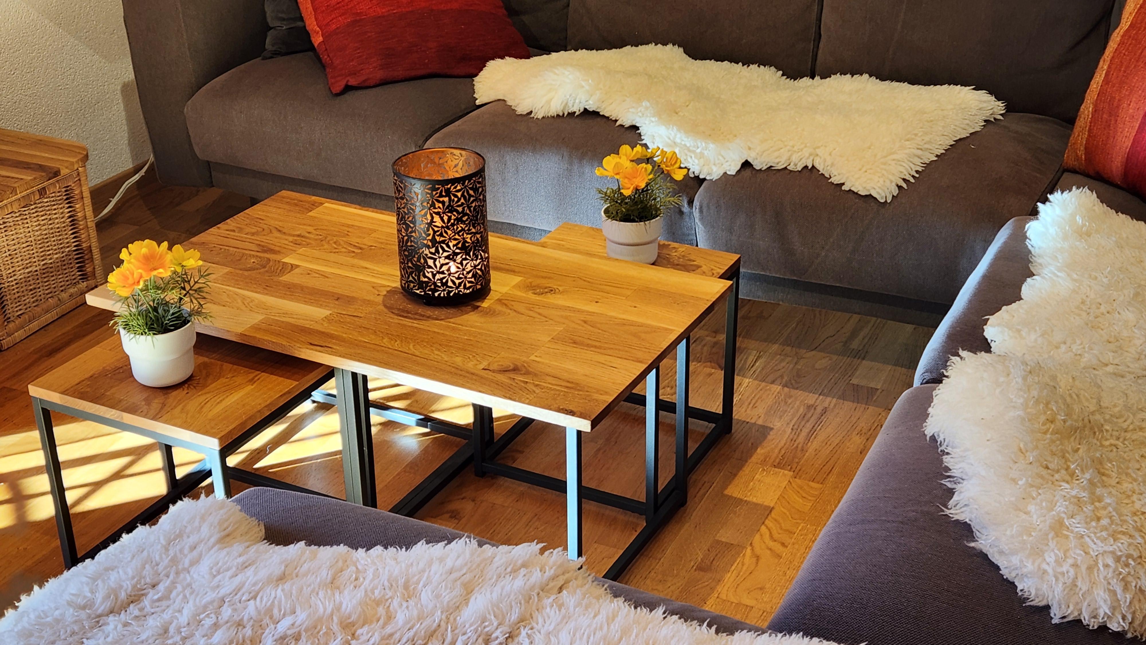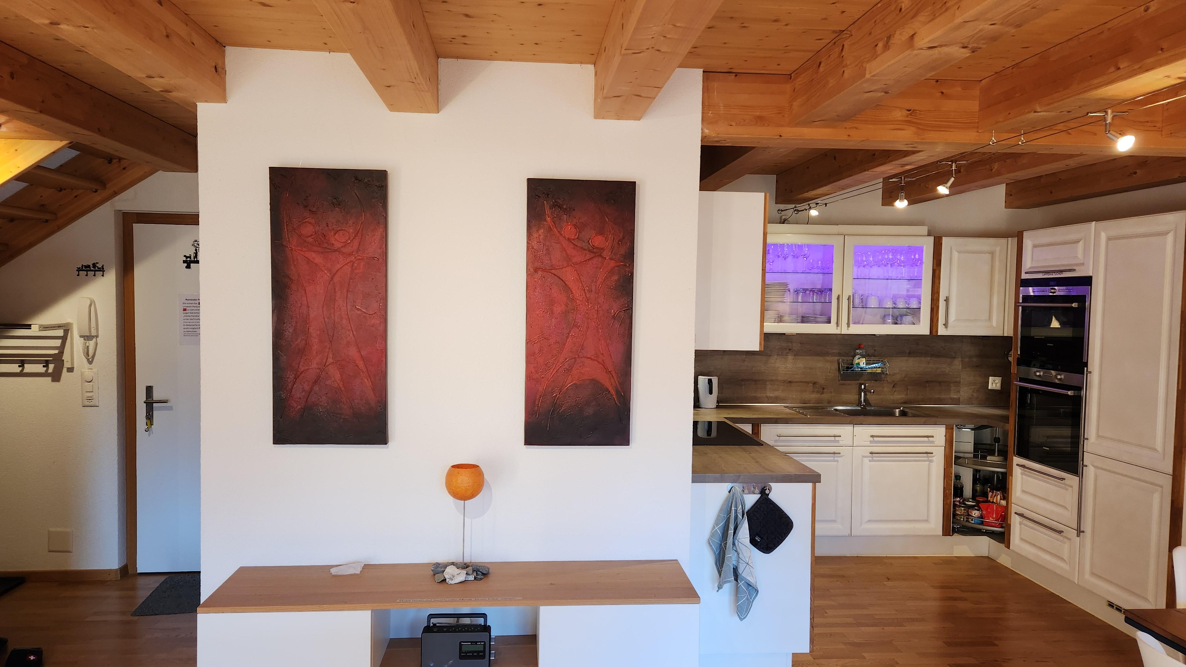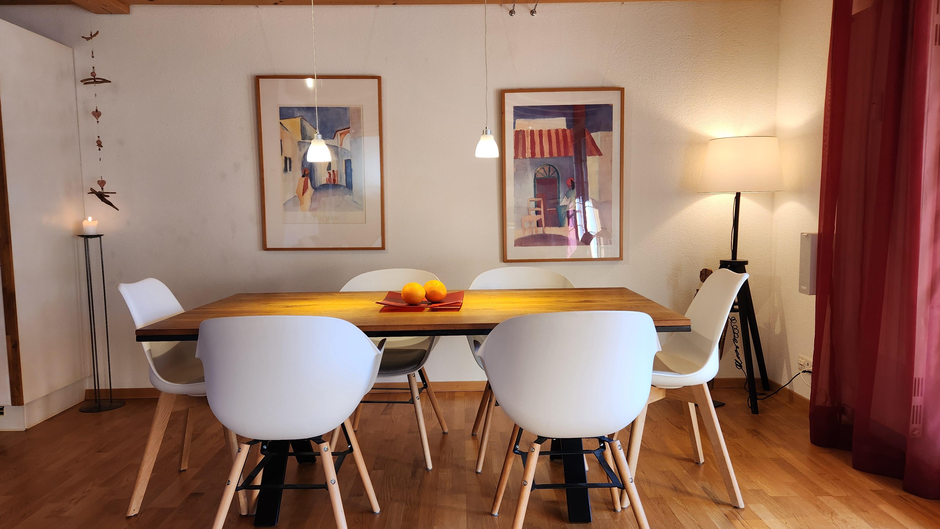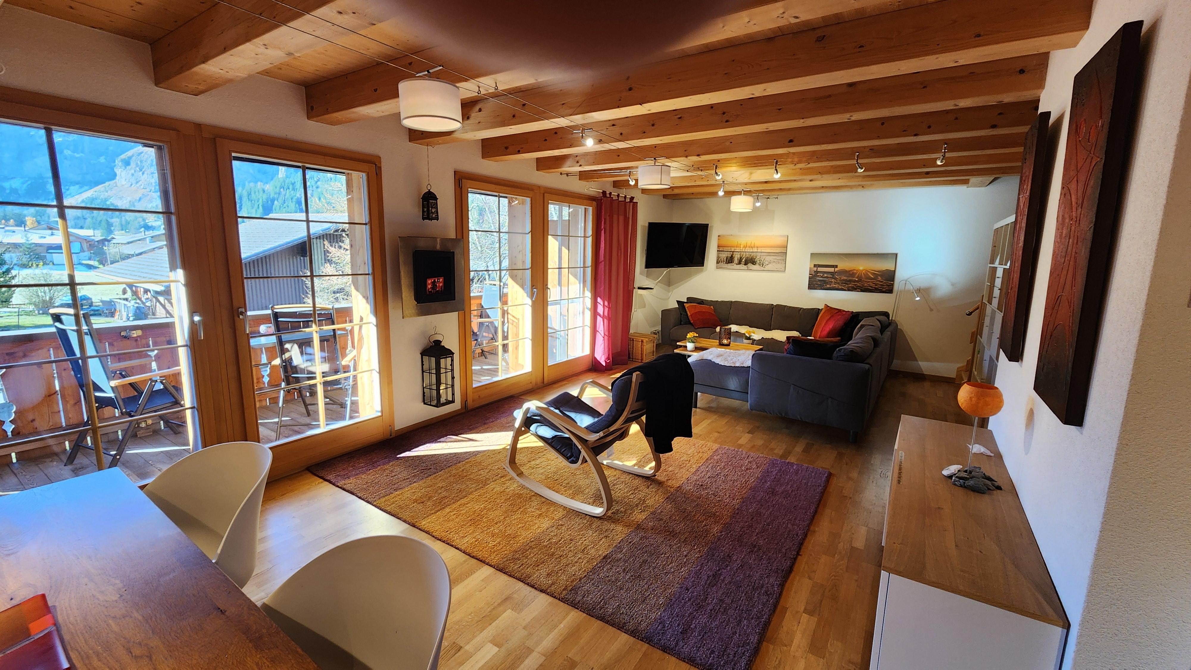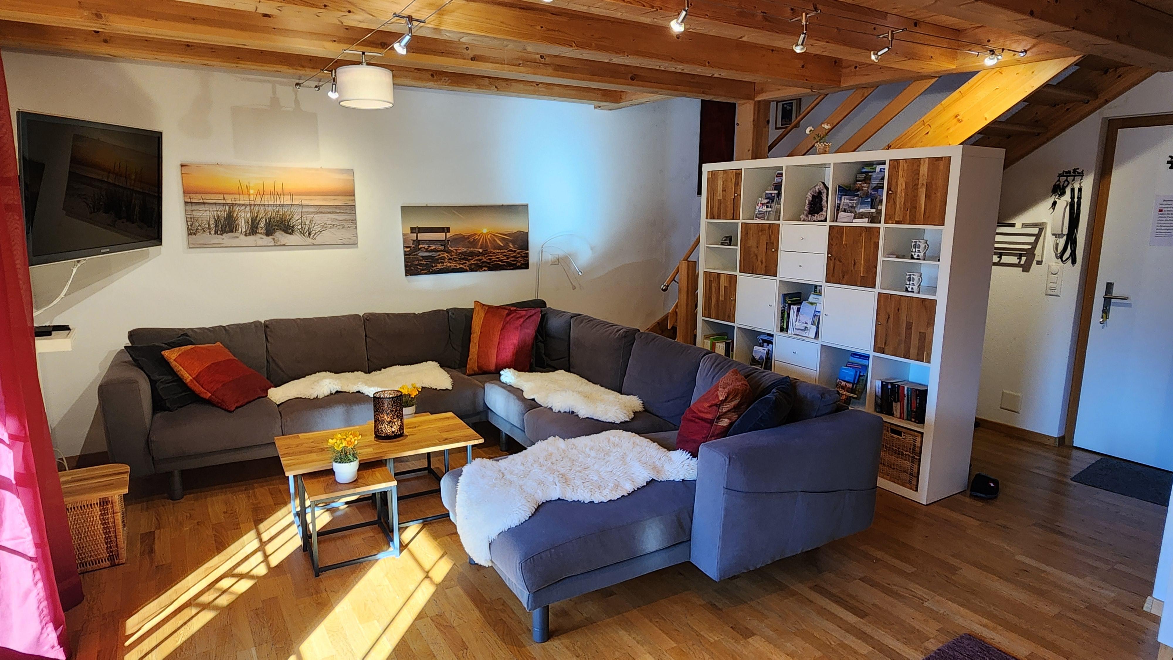 Unsere modern eingerichtete Maisonette - Ferienwohnung besteht aus 4.5 Zimmer (101 qm) und befindet sich im Dachgeschoss eines grossen Chalets.