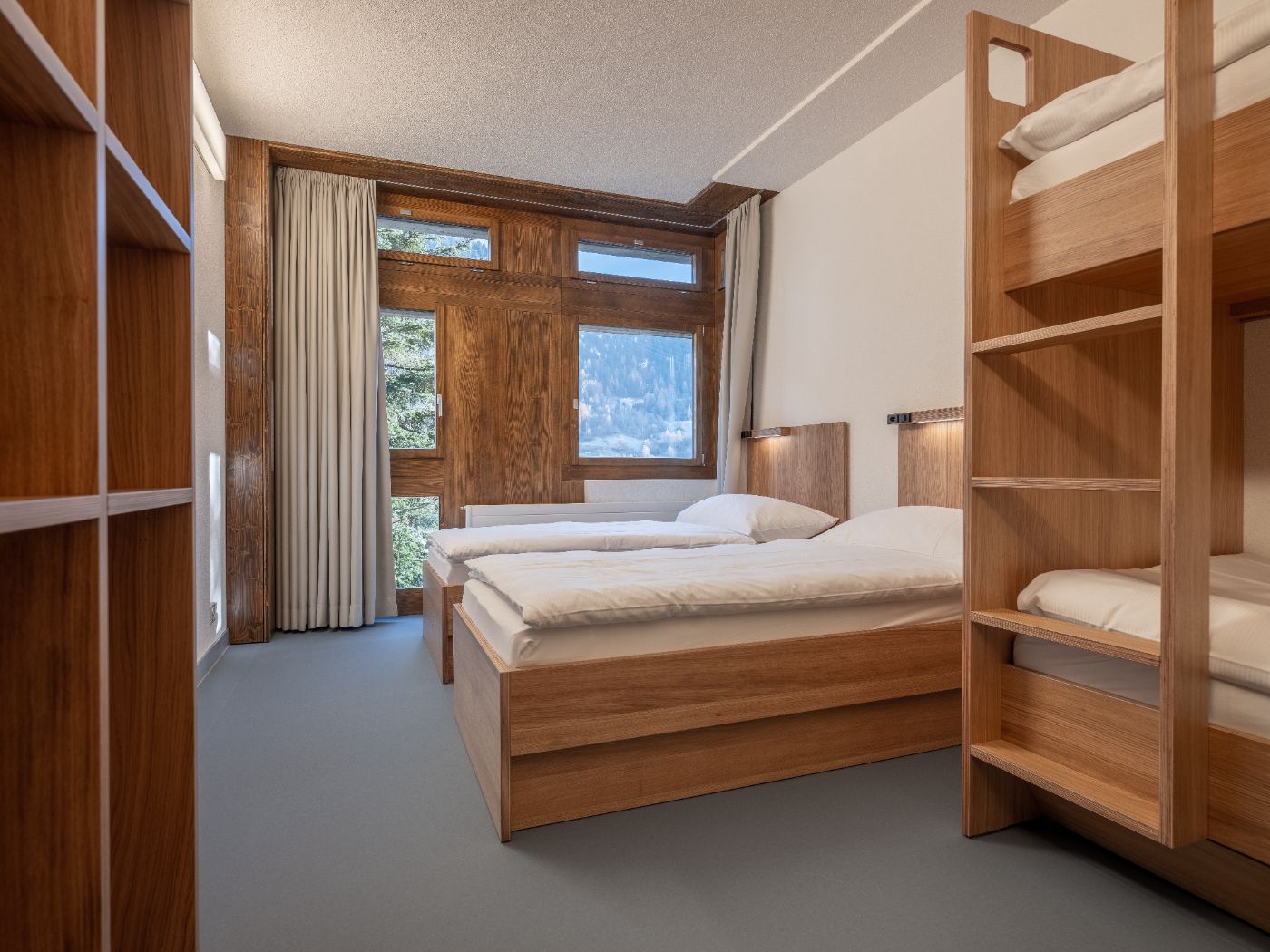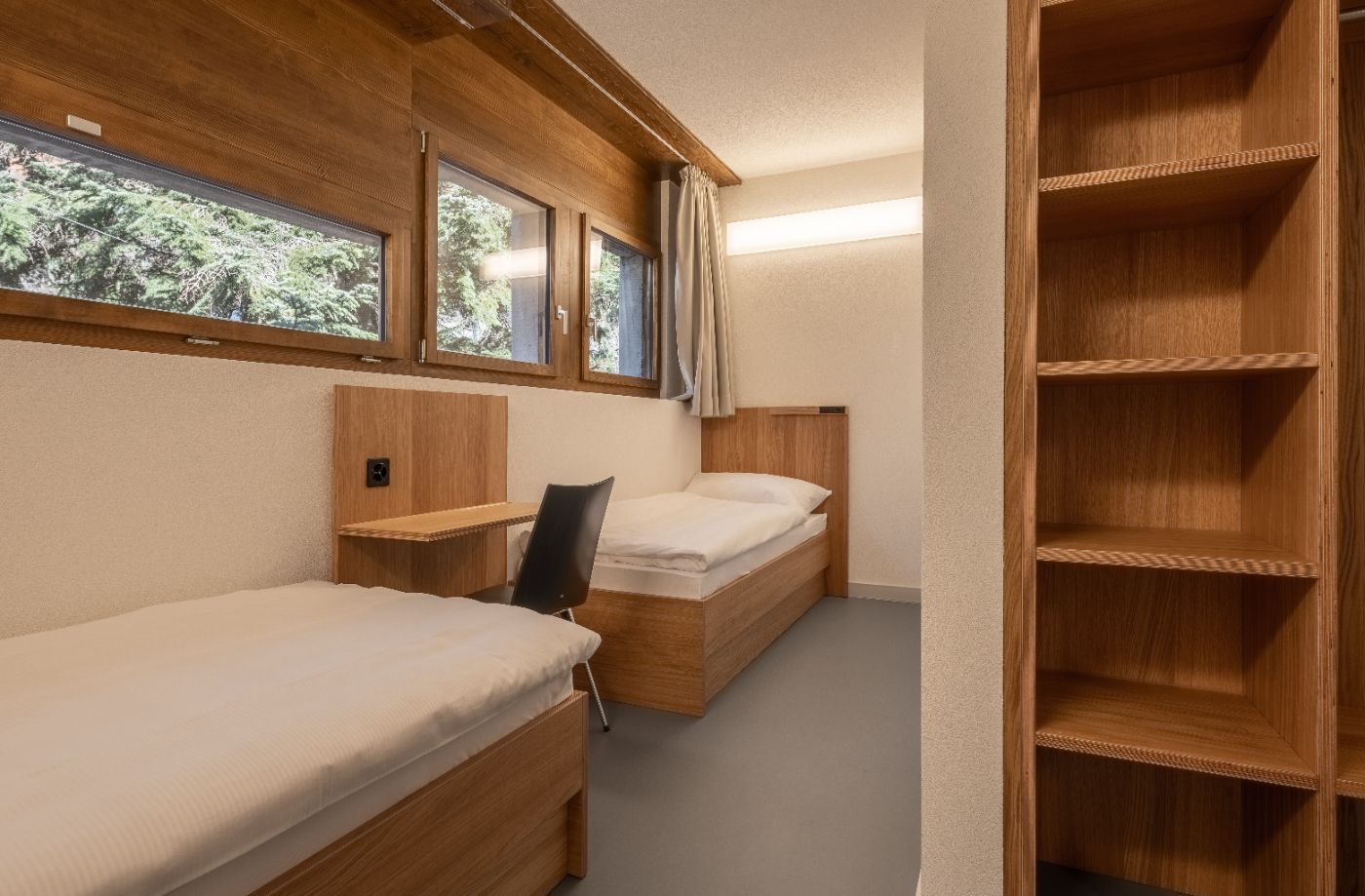 Die 44 komfortablen 1er, 2er, 3er und 4er-Zimmer sind alle mit Dusche und WC und gratis WLAN ausgestattet. Ideal für Gruppen, die etwas mehr Komfort und Privatsphäre schätzen. Komfort und Privatsphäre vereint in einem modernen Gebäude mit 132 Betten mit Frischluftzufuhr. Durch die Raumaufteilung sind die Zimmer bestens geeignet für kleinere Gruppen.