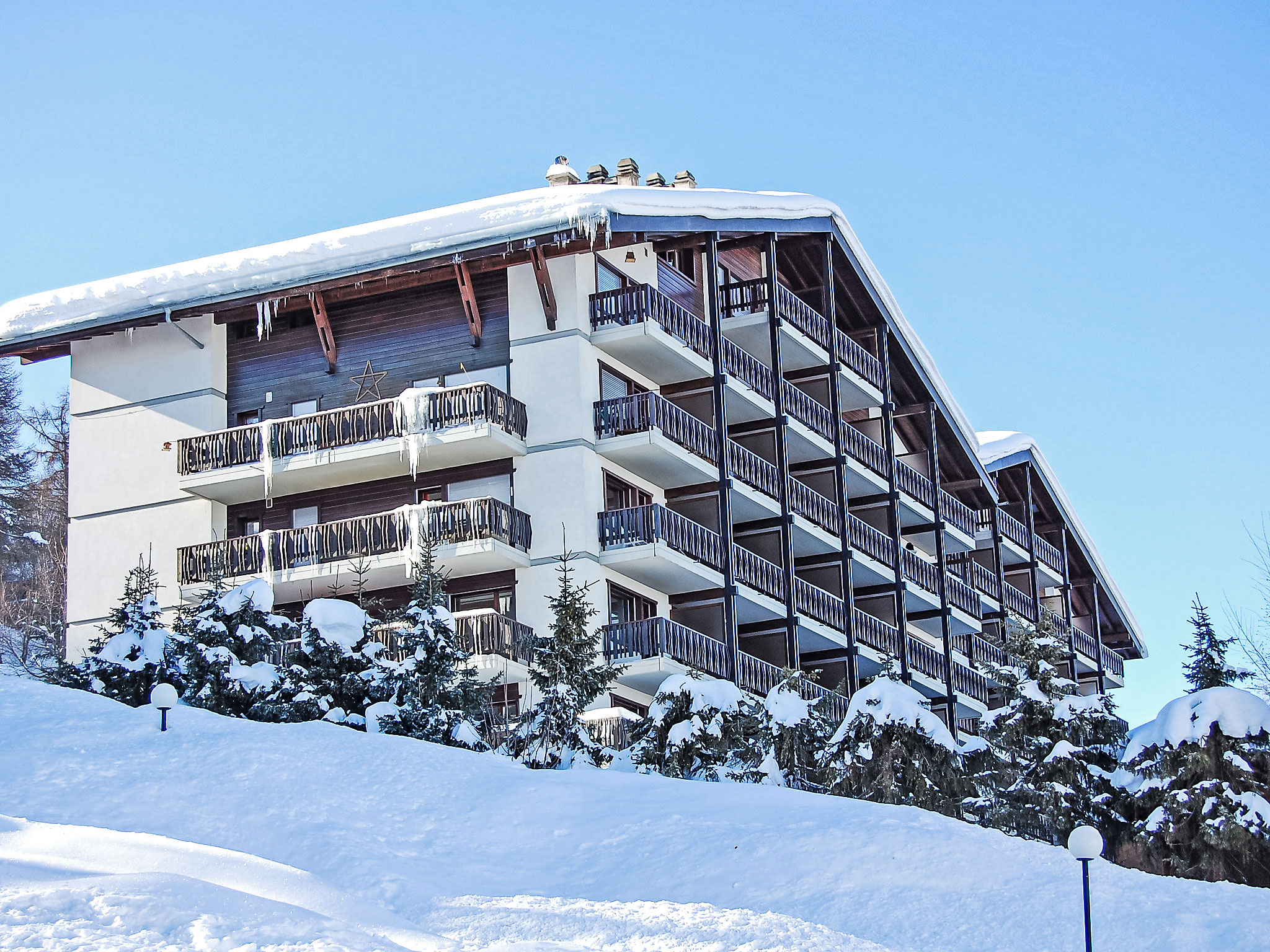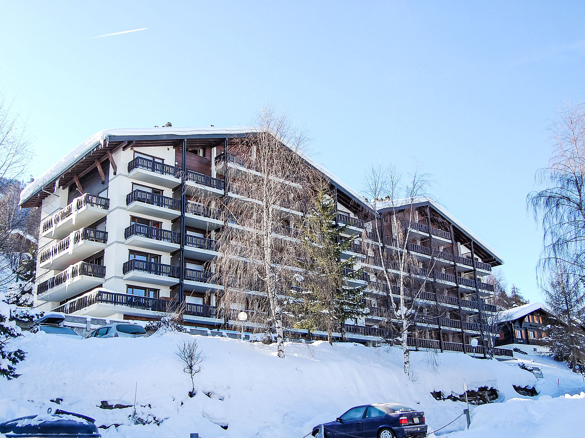 Mehrfamilienhaus "Eden Roc". Zur Mitbenutzung: Hallenbad (18 x 8 m, 130 - 180 cm tief, saisonale Verfügbarkeit: 16.Dez. - 01.Nov. Öffnungszeiten Schwimmbad: 08:00-19:00). Im Hause: Sauna (extra). Fahrstuhl, Zentralheizung, Waschmaschine, Wäschetrockner (extra). Zufahrt bis zum Haus. (15 Stufen). Parkplatz (beschränkte Anzahl). Supermarkt 900 m, Restaurant 250 m, Bäckerei 300 m, Bushaltestelle "Haute-Nendaz, télécabine" 450 m, Bahnstation "Sion" 17.4 km, Freibad 900 m. Golfplatz (18 Loch) 18 km, Tennis 900 m, Gondelbahn, Skisportanlagen 450 m, Eisfeld 500 m, Kinderspielplatz 600 m. Bekannte Skigebiete sind gut erreichbar: Nendaz 4 Vallées 300 m. Bitte beachten: Weitere Unterkünfte sind buchbar. Haustiere in der Wohnung nicht erlaubt.